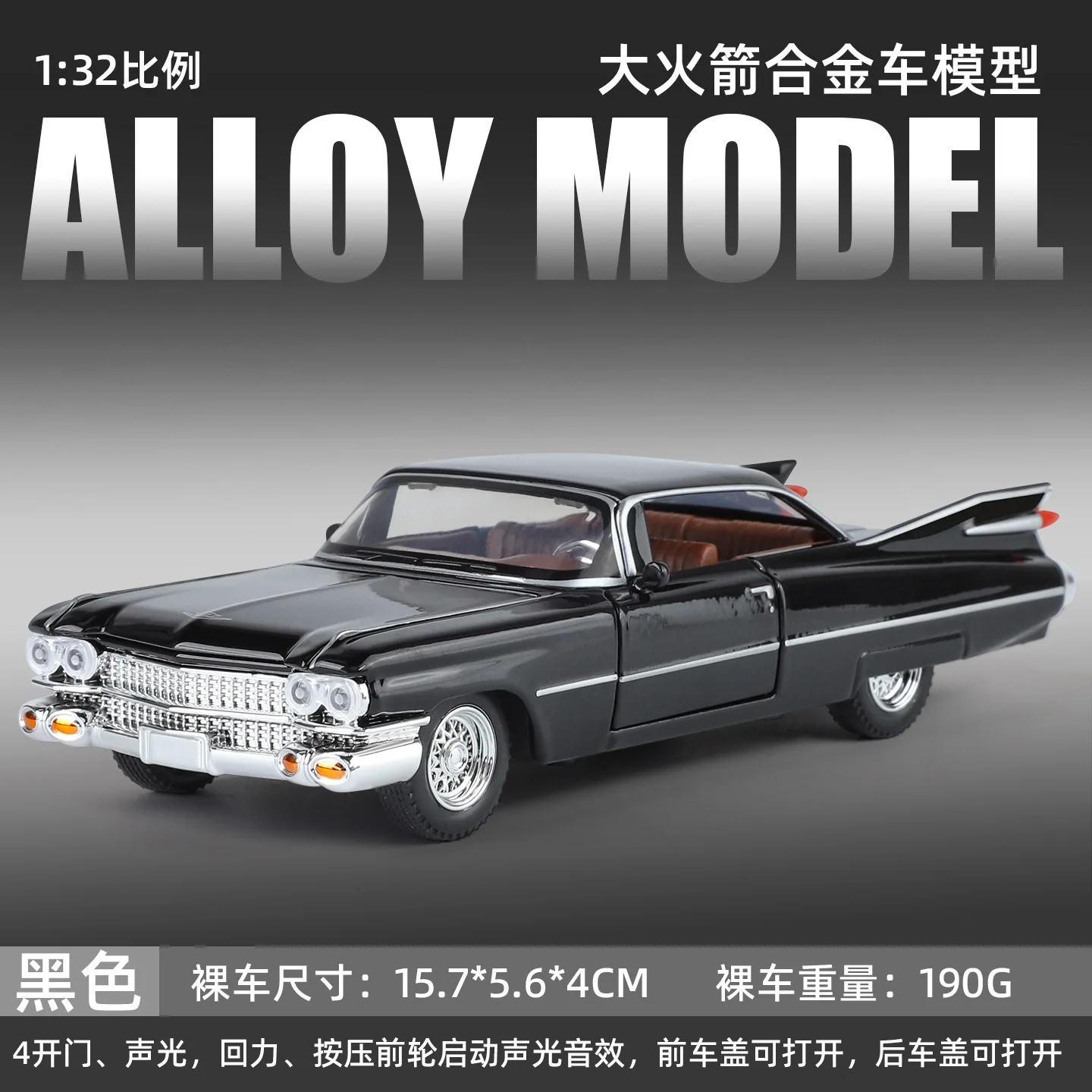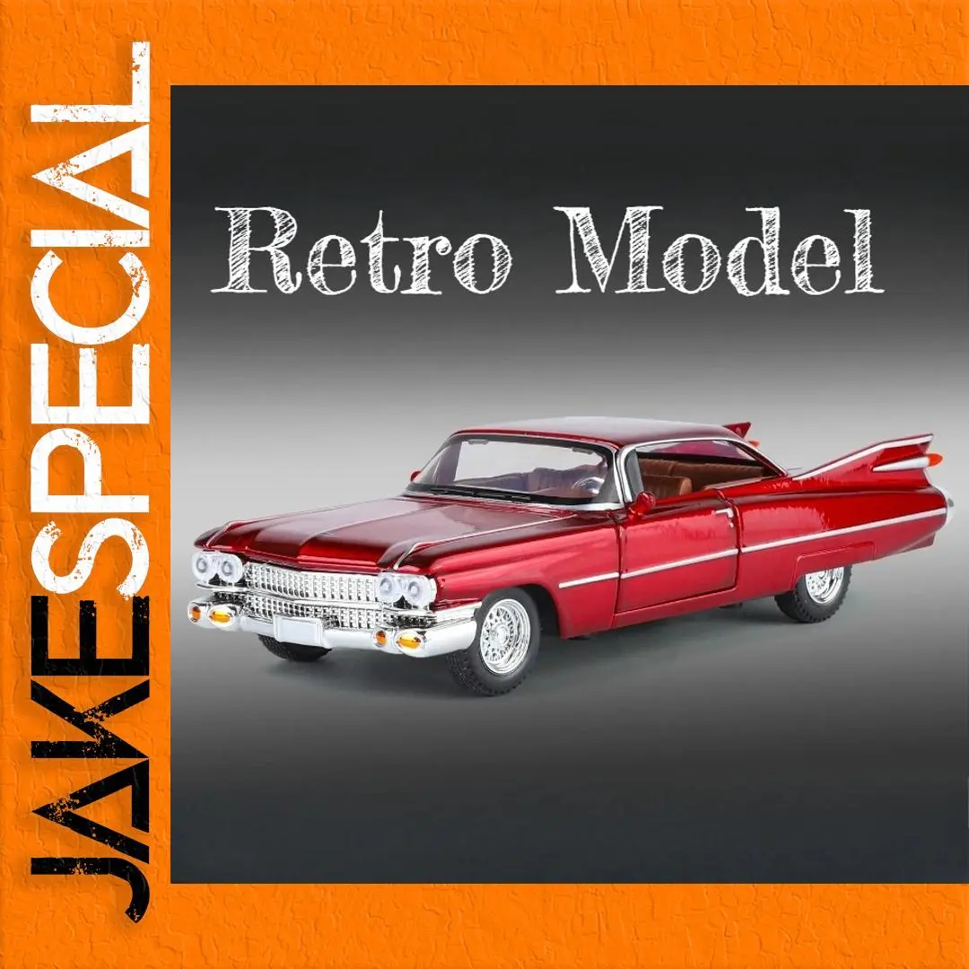 The 1:32 scale retro Impala classic sports car model impresses with its striking red finish and glossy paint that accentuates its vintage design. This meticulously crafted model features a long hood, tapered rear, and chrome-accented dual headlights, while the elaborate grill enhances its nostalgic charm. Made from durable metal, it includes four functional doors, revealing a richly detailed interior in brown. Iconic tail fins and finely detailed wheels with chrome rims add to its appeal. Equipped with sound and light functionalities, it operates on a button battery and functions as a pull-back toy, making it a perfect addition to any collection.