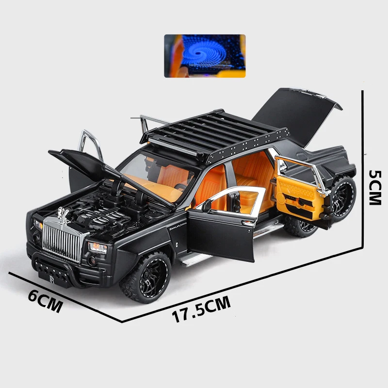 Transport yourself to a world of luxury with this meticulously crafted 1:32 scale miniature of the iconic Rolls Royce Phantom. Featuring a glossy black finish, it captures the sleek and sophisticated silhouette of the original vehicle, making it a standout piece for collectors and enthusiasts alike. The model’s refined details, including a prominent metallic grille, rectangular headlights, and a classic hood ornament, highlight its timeless elegance. Inside, the transparent windshield reveals a contrasting yellow dashboard and tan seats, adding depth and visual richness. The sporty black roof rack enhances its utilitarian charm, blending luxury with utility. Perfectly sized and constructed from durable alloy and plastic, this collectible toy exudes craftsmanship and style. Imagine the pride of owning such a realistic miniature that beautifully reflects this craftsmanship.