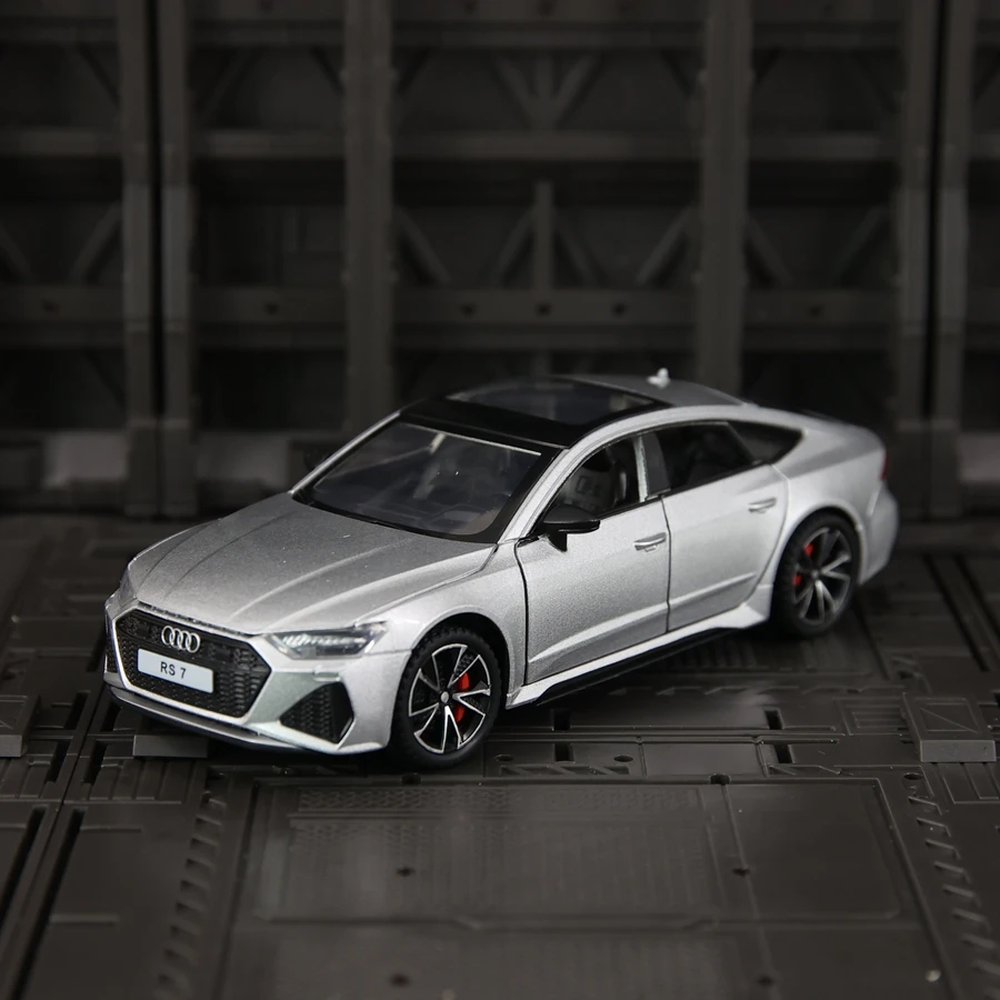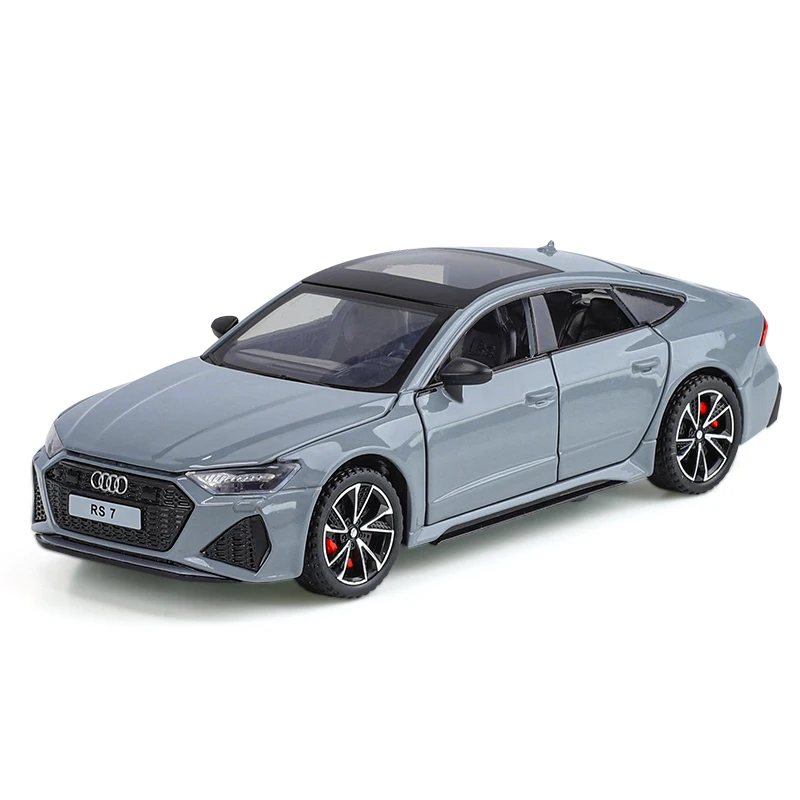 Experience the thrill of owning this highly detailed 1:32 scale diecast alloy model of the RS7, crafted with precision and care. Finished in an elegant metallic silver, this model captures the sleek, sporty silhouette of the luxury sports car. Its realistic decoration includes black wheels with silver accents and red brake calipers, elevating its bold presence. The open doors and hood reveal beautifully crafted interiors and engine details, showcasing unmatched craftsmanship. With integrated sound and light feedback, it offers an interactive display that enhances the realism. Perfect for collectors or car enthusiasts, this model provides a premium visual experience, adding sophistication and excitement to your collection or workspace.