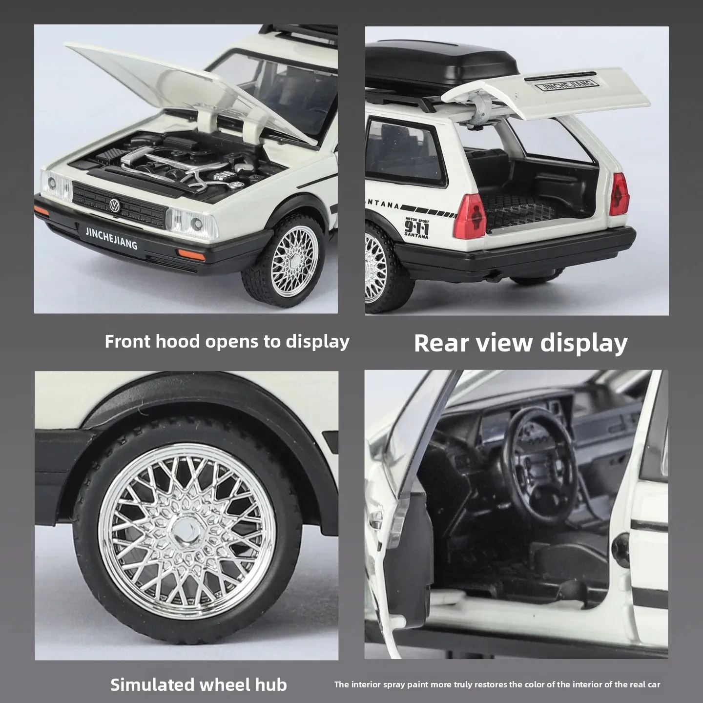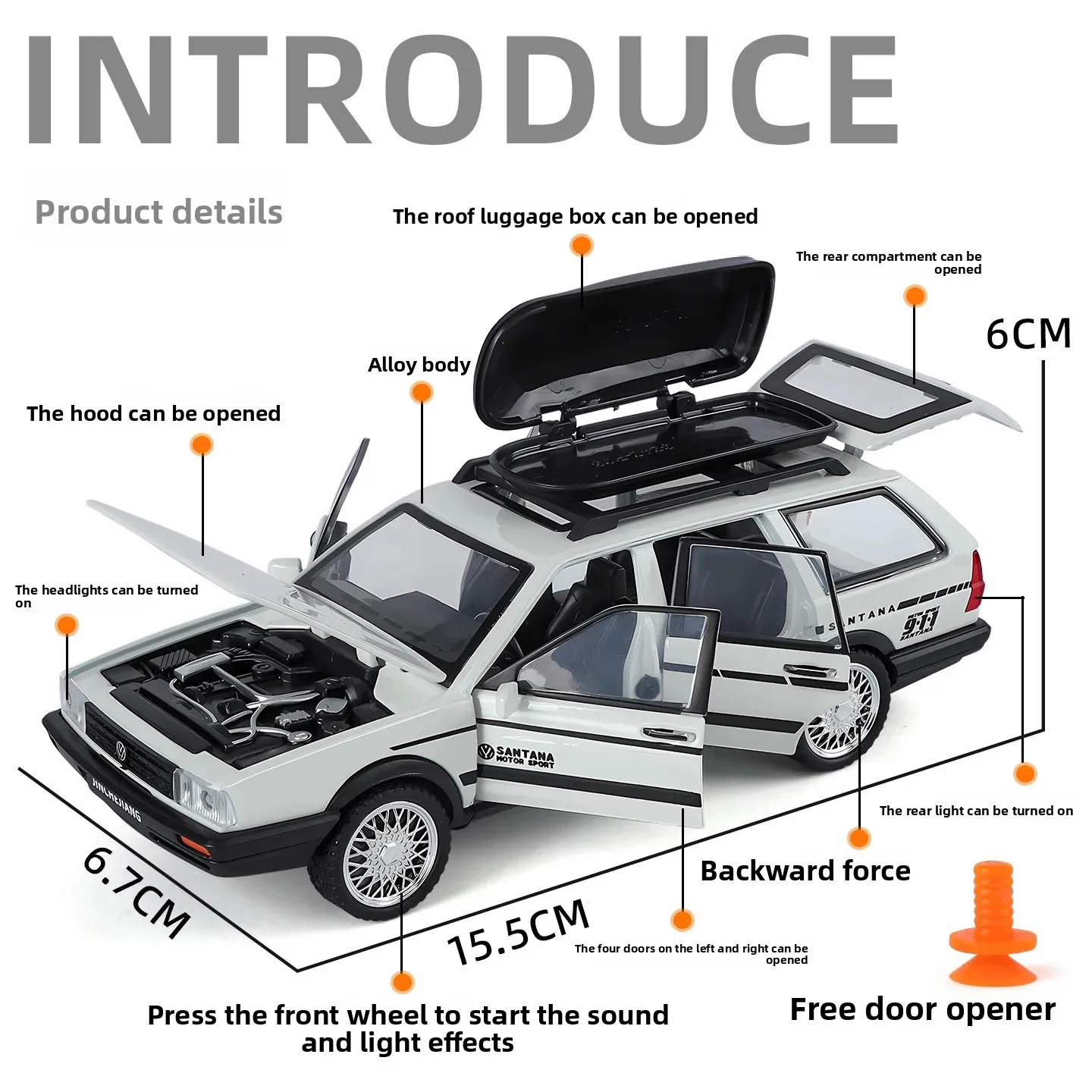 Enhance your collection with this highly detailed 1:32 scale alloy model of the Santana Tank Car, featuring realistic sound and light effects for an immersive display experience. Crafted with precision, it showcases vibrant color options including white with black accents, classic black, and bold red, all with intricate front grille, rectangular headlights, and streamlined side mirrors. Each model is equipped with black roof cargo boxes mounted on roof rails, multi-spoke alloy rims, and matching tires, emphasizing both sportiness and craftsmanship. Suitable as a striking decorative piece or gift, this high-quality collectible is battery-operated with button batteries and designed for enthusiasts aged 4 and above.