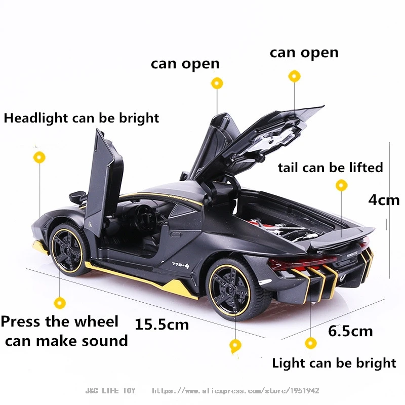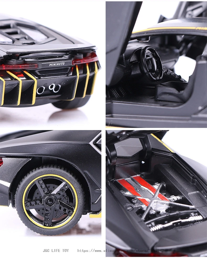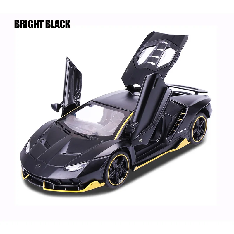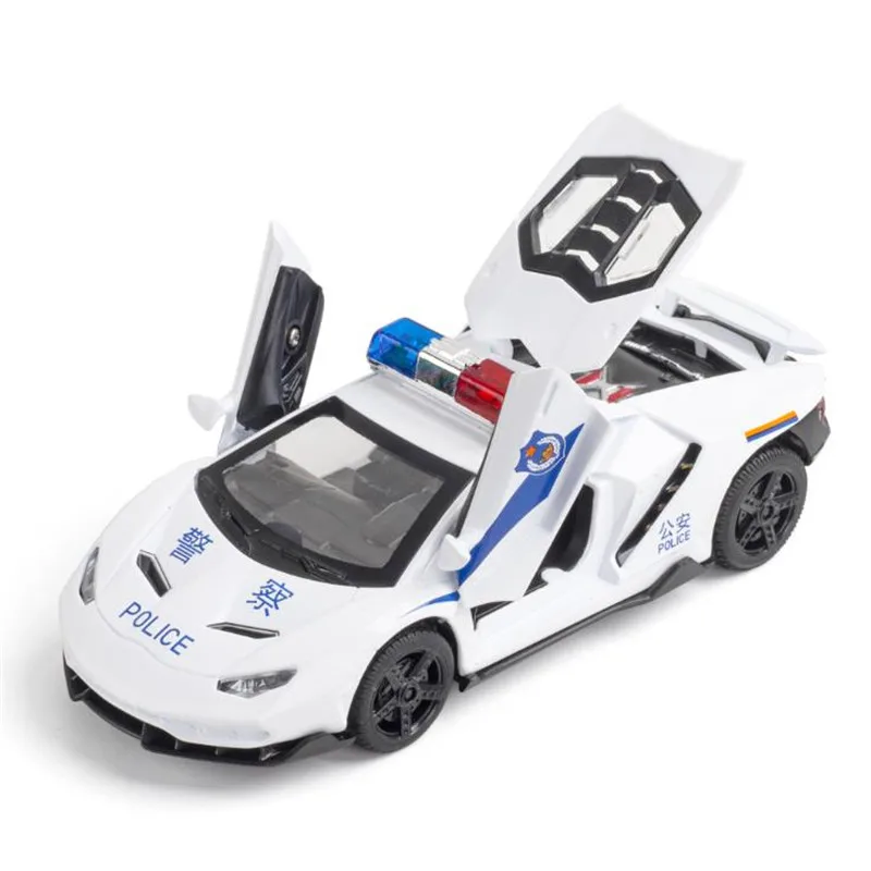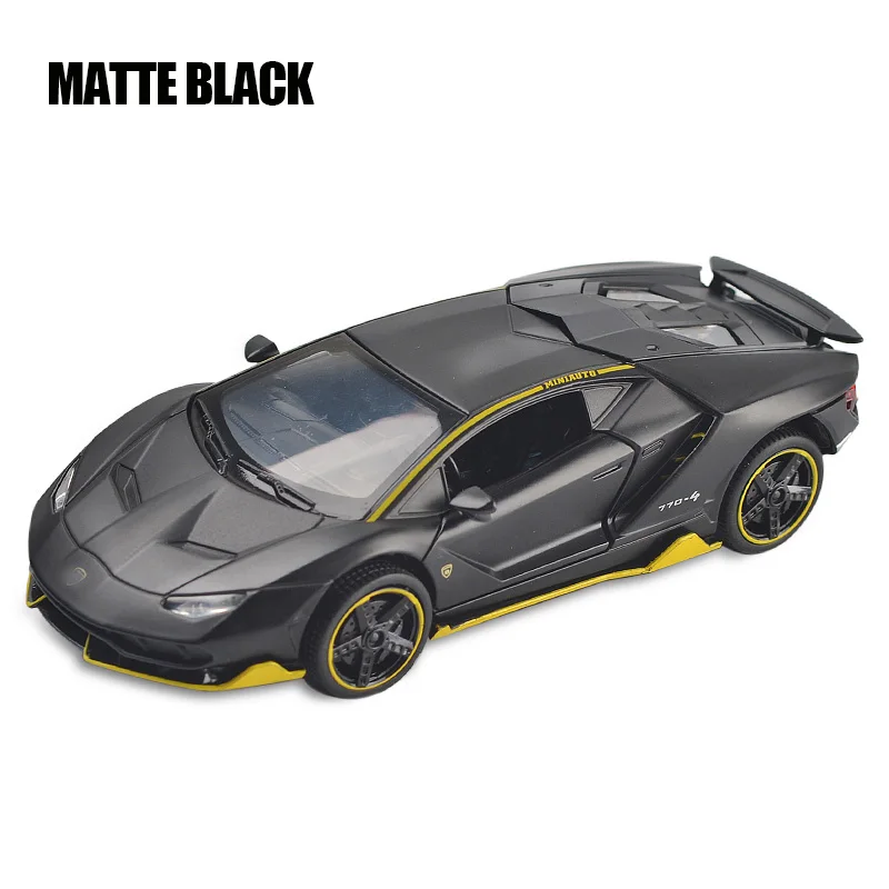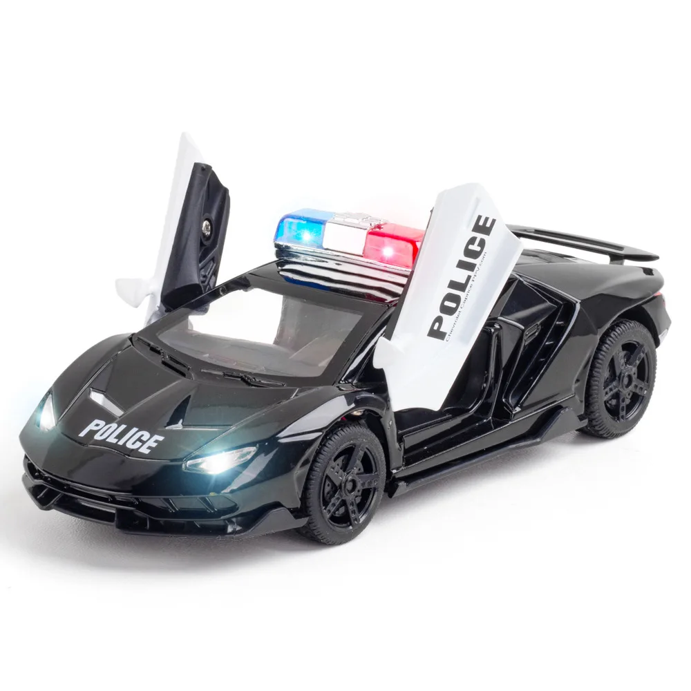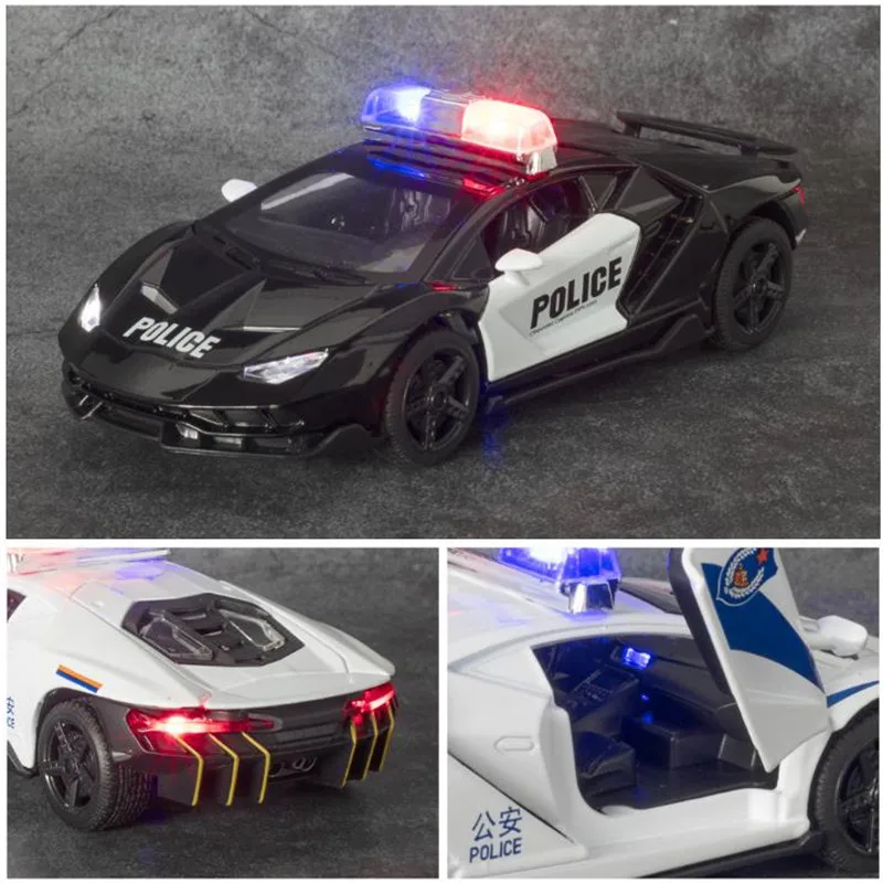 This 1:32 scale diecast alloy and plastic sports car model offers a realistic and dynamic experience with functional opening doors, a pull-back mechanism, and integrated sound and light effects. Available in Bright Black, Matte Black, Police Black, and Police White, it features detailed aerodynamic styling with sharp lines, a low stance, and colorful accents on the front splitter, side skirts, and rear. The wheels are designed for racing simulation, complemented by visible brake calipers and realistic tread. Equipped with a lifting tailgate and clear windows revealing an intricate interior, this high-performance model is perfect for display or play, suited for collectors aged 14+ and enthusiasts aged 18+.