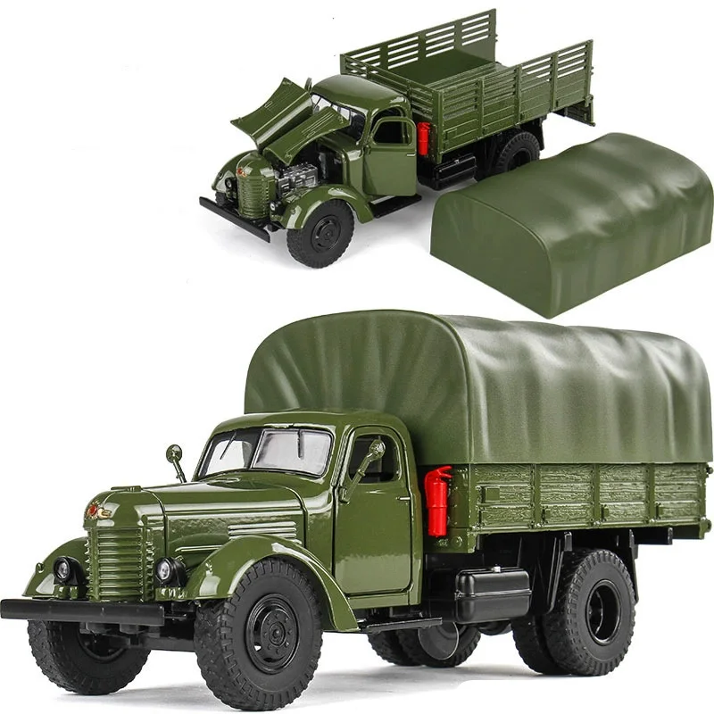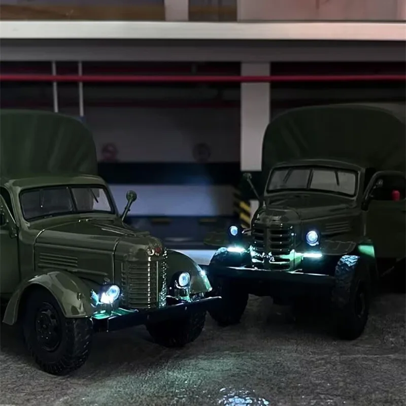 Imagine adding this impressive tactical truck armored car model to your collection. Designed with attention to detail, it features a robust matte green finish that embodies military aesthetics. The model exhibits a striking front grille, textured black tires for rough terrain, and realistic elements like clear lens headlights, side mirrors, and a spotlight. The tarpaulin-covered cargo area not only adds to its authenticity but suggests practicality for transporting personnel and equipment. Equipped with sound and light functions, this model promises to provide endless hours of enjoyment and admiration.