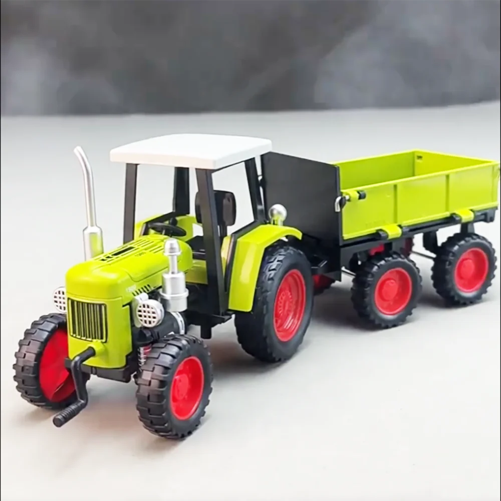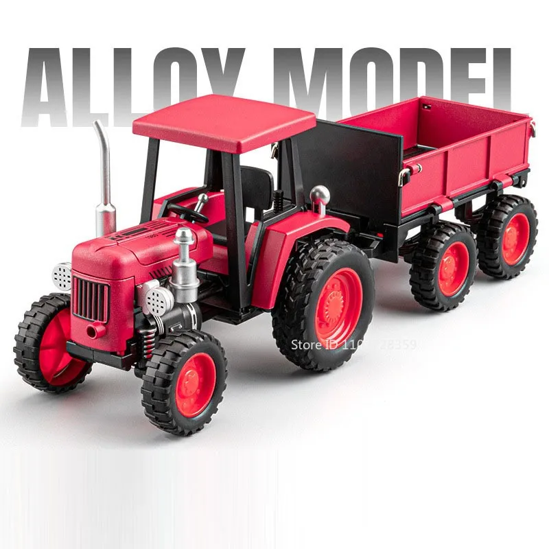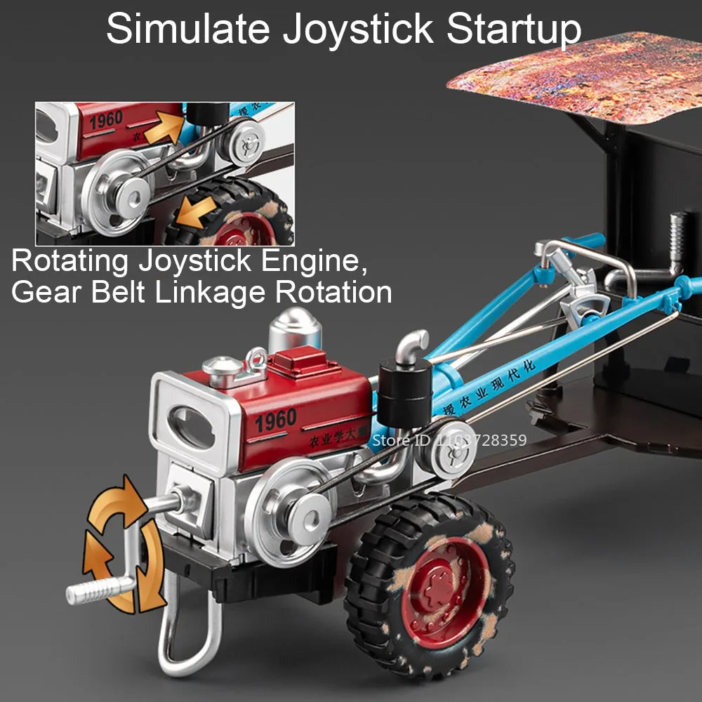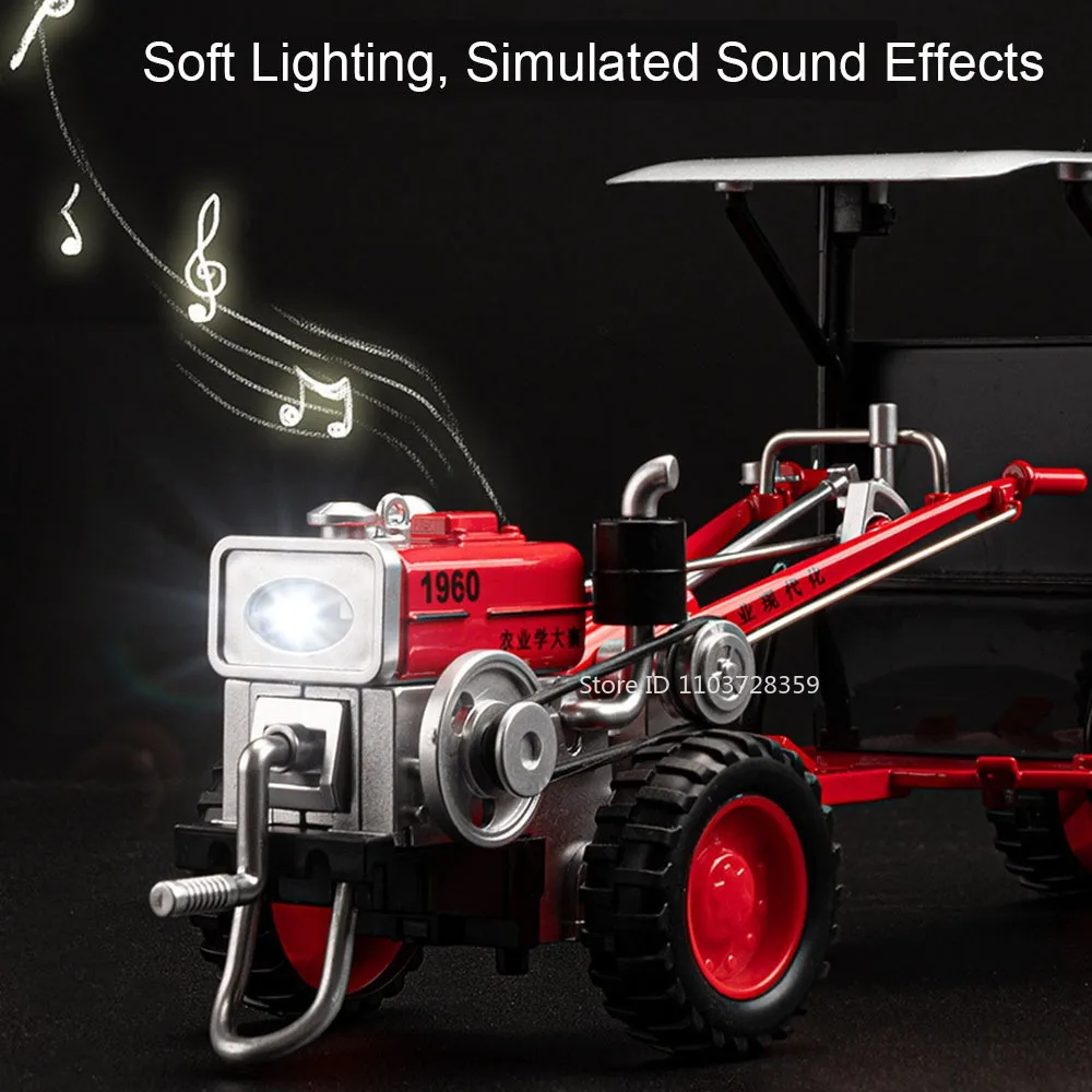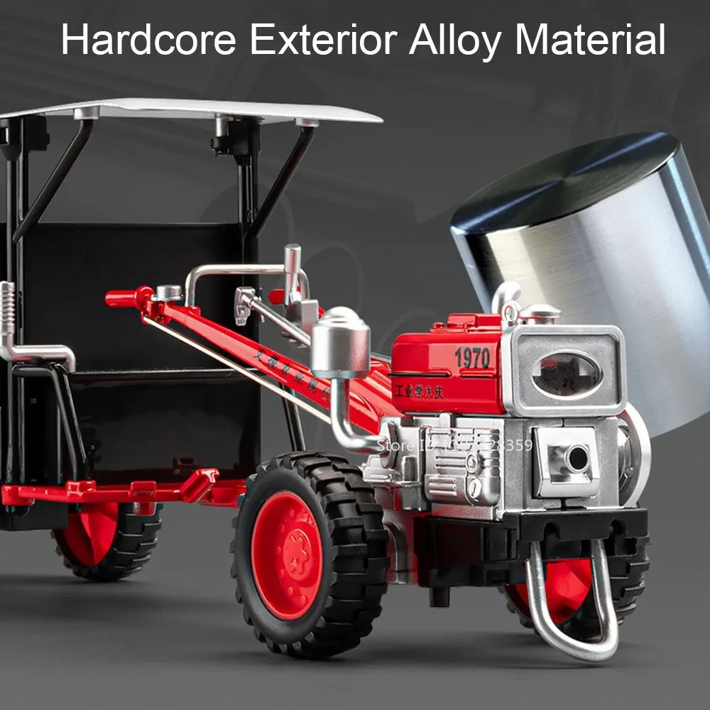 This 1:32 scale walking tractor model toy features a durable alloy metal body, plastic chassis, and rubber tires with deep treads, measuring approximately 26 cm in length, 7.3 cm in width, and 10 cm in height. Available in brown, green, red, and blue, it boasts realistic weathered textures and a sleek metallic silver engine. Functional features include sound and light activation via the joystick, pull-back mobility, movable doors, liftable baffle, and an iron hook. The steering is flexible, and a push-to-lock mechanism allows for directional control. This high-simulation model offers an industrial, vintage aesthetic ideal for adult collectors and enthusiasts. Batteries are not included.