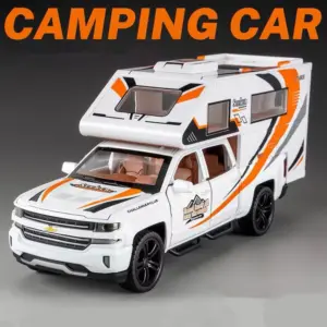 Imagine owning this beautifully crafted 1:32 scale diecast Silverado pickup RV, perfect for enthusiasts who value realism and intricate design. Crafted from durable alloy and plastic, this model captures every detail of a modern recreational vehicle, from its sleek white body accented with bold orange and black graphics to the rugged black multi-spoke wheels. The elevated camper section, side windows, and roof hatch add to its authenticity, inspiring thoughts of adventure and exploration. Exclusive sound and light features enhance the sensory experience, making it an engaging display piece or a dynamic toy. Available in blue, purple, and white, this model truly brings the thrill of outdoor journeys into your collection.