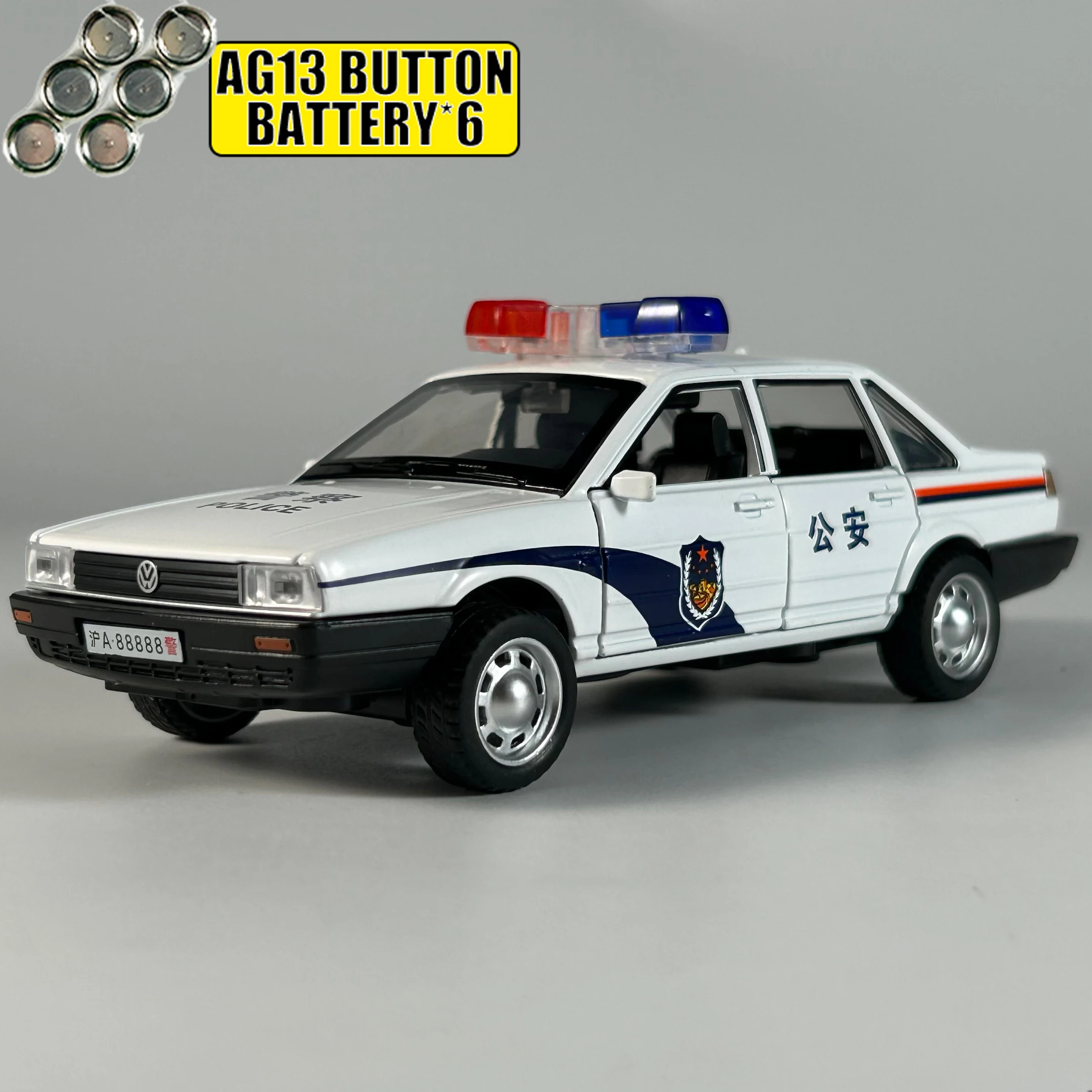 Experience the realism of a 1:32 scale diecast Volkswagen Santana Police Car, crafted from durable alloy metal. Featuring a sleek white finish with dark blue police markings, multicolored badge details, and a transparent light bar with red, clear, and blue sections, this miniature exudes authenticity. It includes black-tinted windows revealing detailed interior seating, a black front grille, and metallic silver wheels with black tires for an incredibly lifelike appearance. Perfect for adult collectors, this highly detailed model combines bold colors, realistic textures, and precise design elements, making it an impressive display piece or thoughtful gift for enthusiasts of police and automotive collectibles.