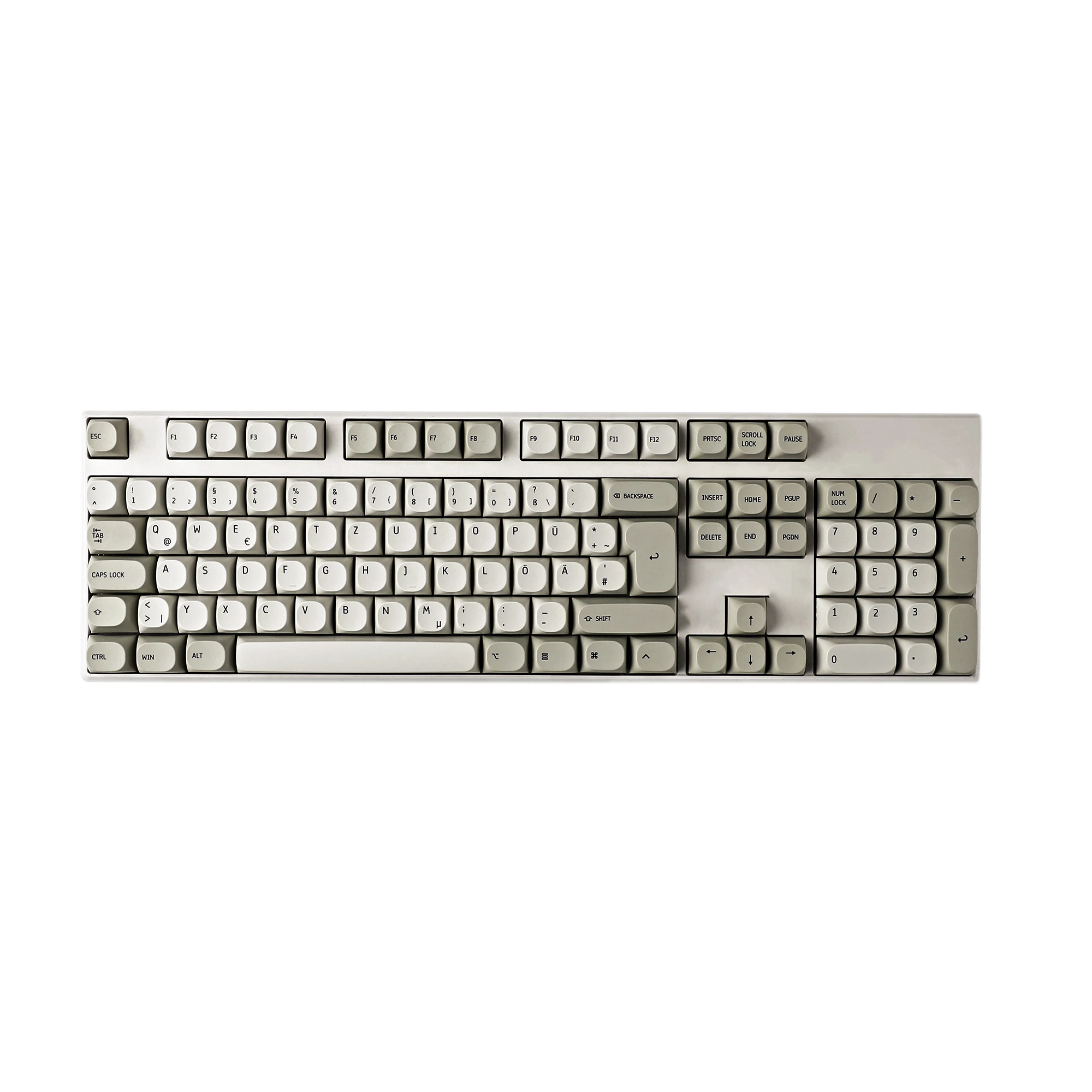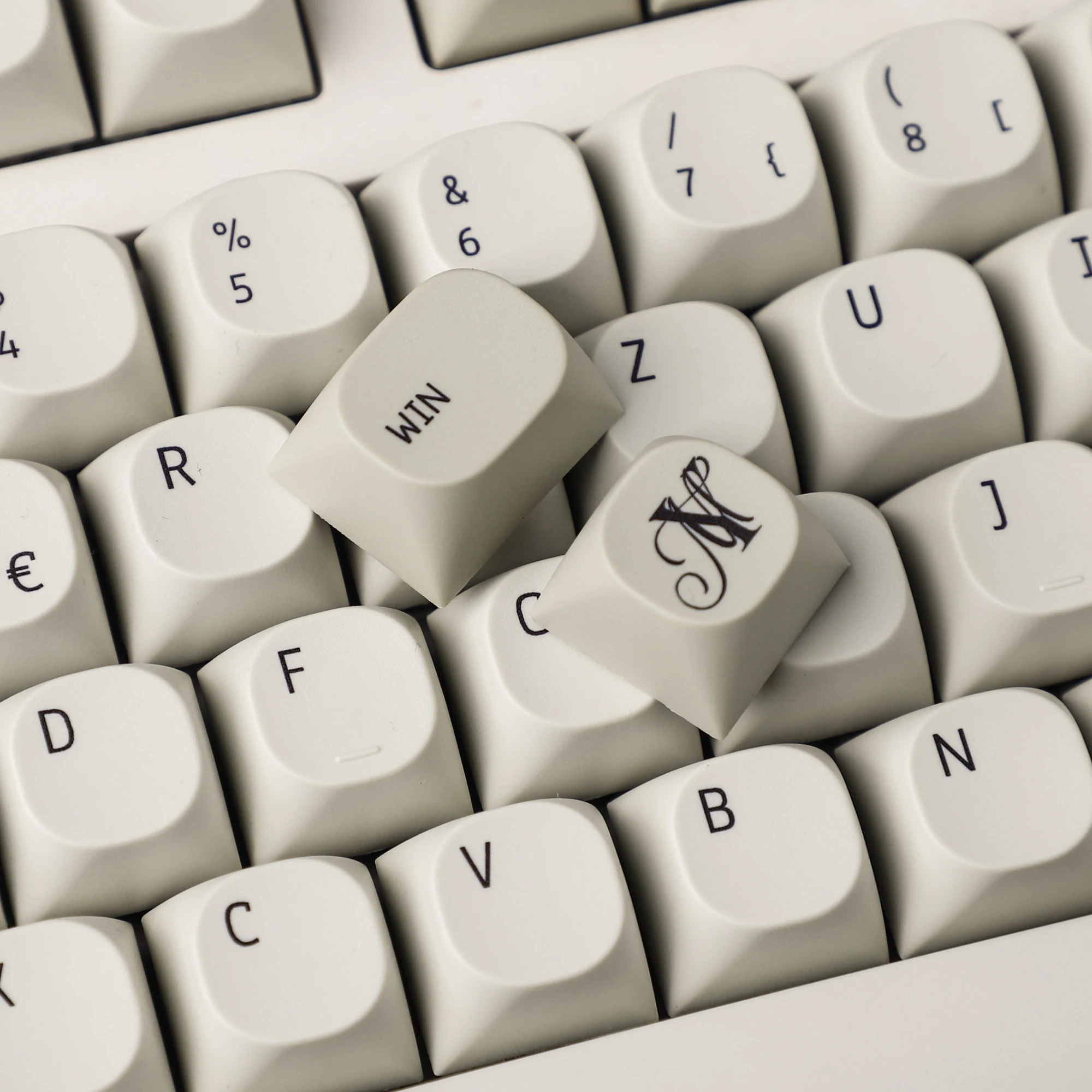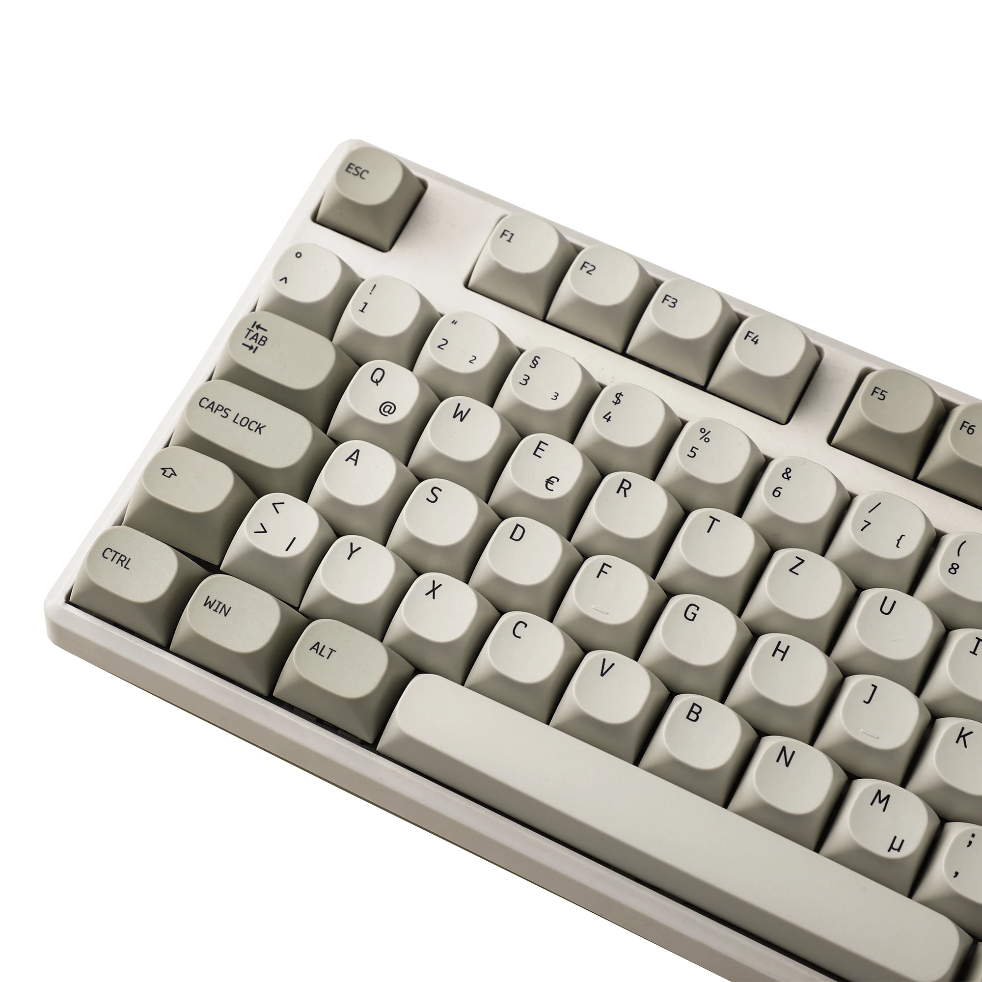 Enhance your mechanical keyboard with this set of 133 dye-sublimated PBT keycaps featuring a sleek MAC-style design. The high-profile MA caps are approximately 1.4mm thick, with durable legends that never fade, and include 129 regular keycaps plus 4 ISO keys and a puller. Designed for MX switches, these caps fit most ISO layouts with a 6.25u (~117mm) spacebar, compatible with keyboards like Filco, Ducky, IKBC, YMD96, Melody96, Kira96, Tada68, KBD75, YMD75, and others using a 7u spacebar. Available in French and German ISO variants, the keycaps sport a matte finish, subtle two-tone color accents, and a ball-shaped profile with tactile lines for precise touch typing.