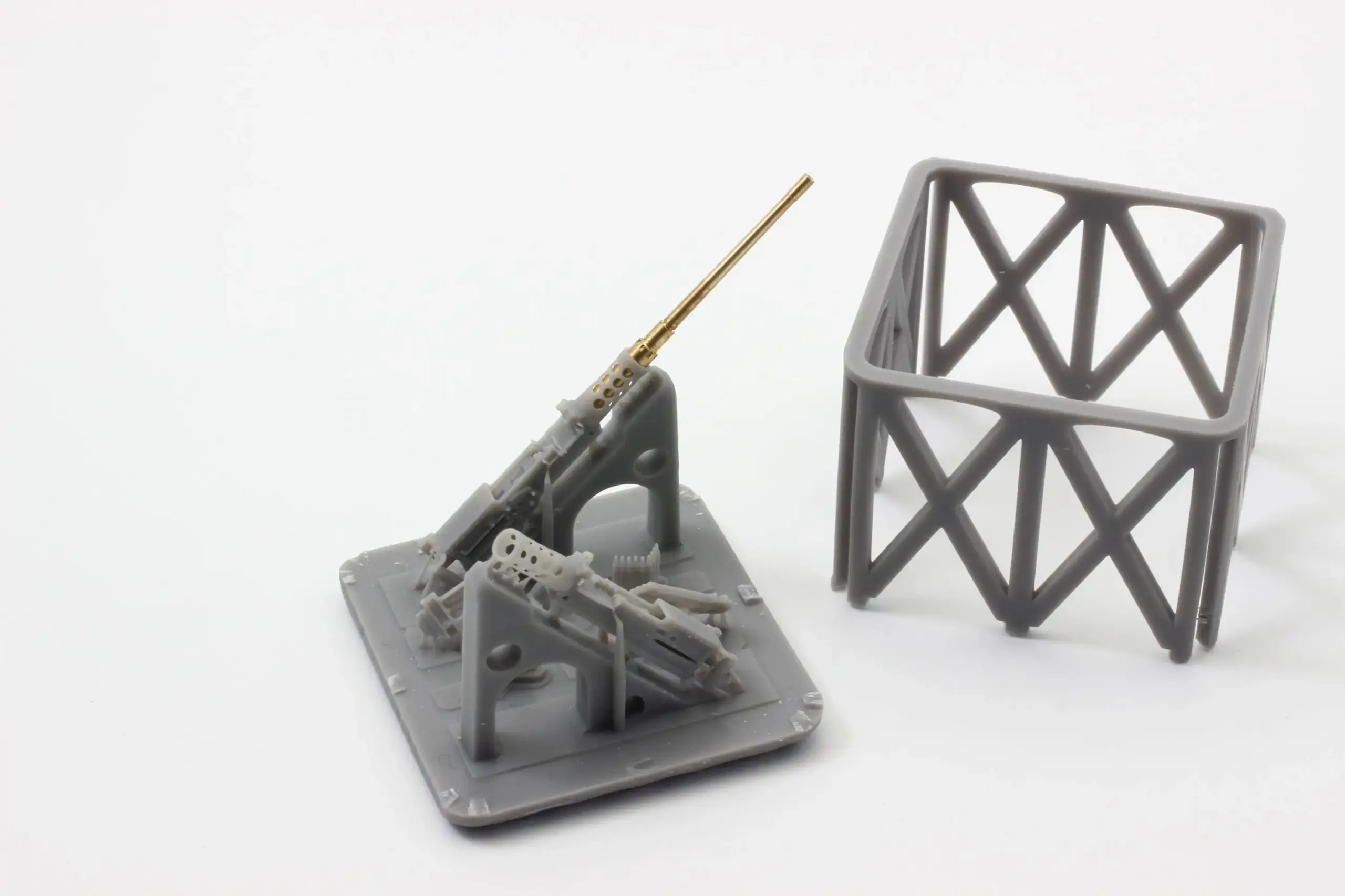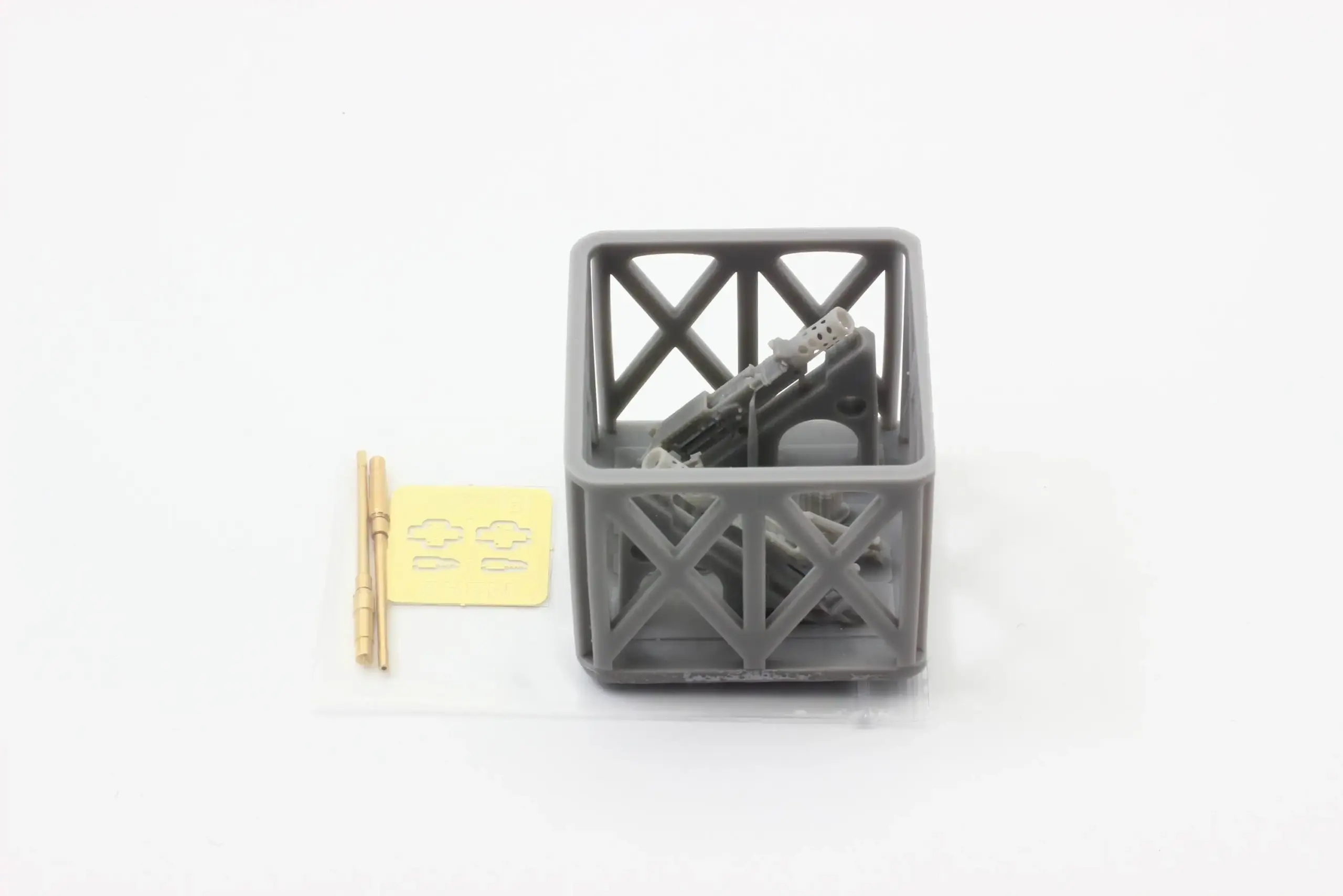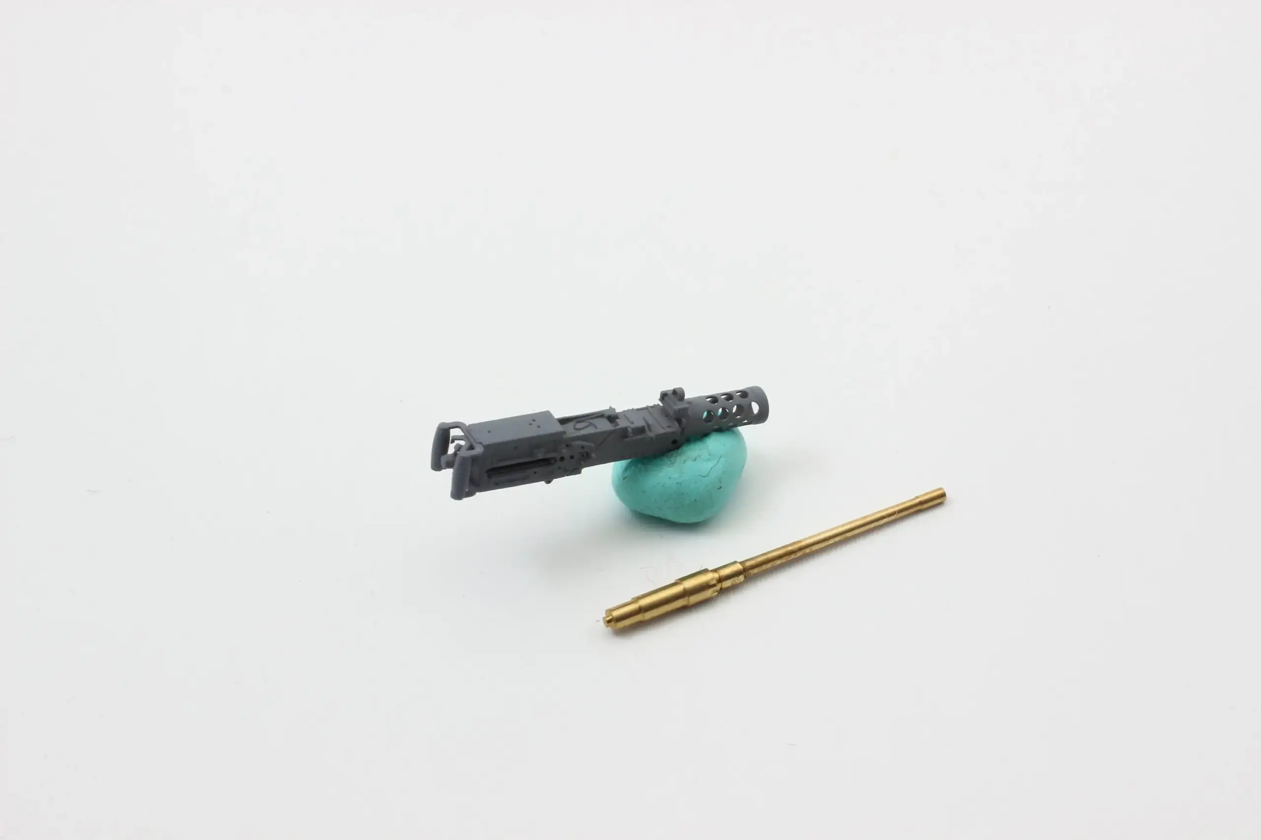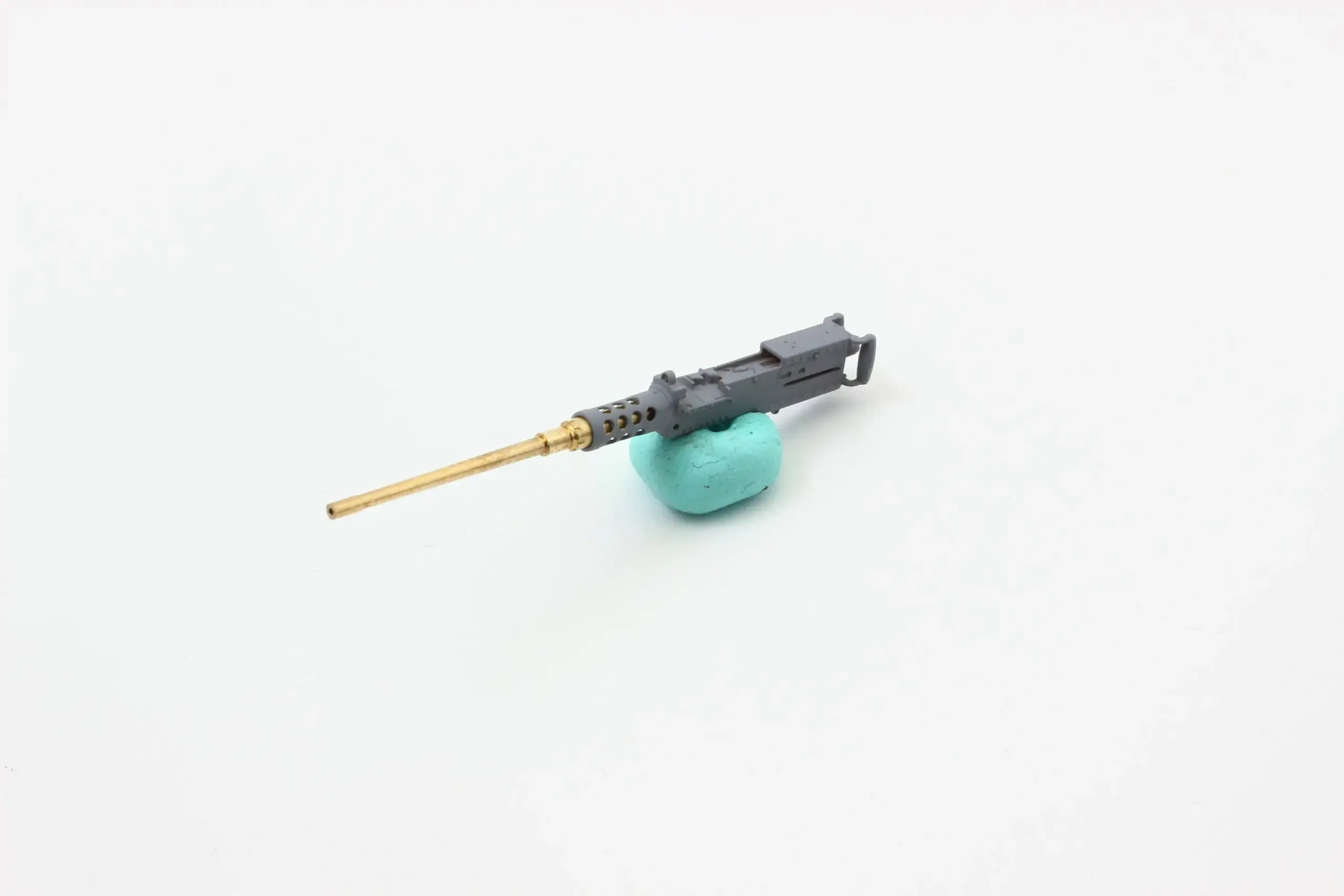 Discover a highly detailed 1:35 scale plastic model kit of the M2HB machine gun, designed for adult collectors and enthusiasts. Featuring intricate craftsmanship, the model showcases a realistic gray finish with finely detailed components. The elongated barrel is accentuated with a striking metallic gold appearance, providing a bold contrast. The model is mounted on a detailed rectangular base, including supporting structural elements, and comes with an additional gray lattice-like piece resembling a protective cage or turret. Perfect for adding a realistic military touch to your collection, this replica captures the robust and technical aesthetic of the iconic weapon with precise detailing.