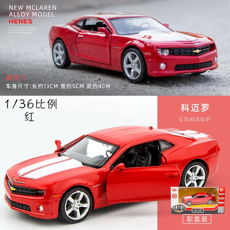 Experience the thrill of owning a meticulously crafted 1:36 scale Chevrolet Camaro diecast model. Featuring a stunning red finish, this model captures the sleek contours and sporty design of the real vehicle, highlighting its glossy surface, bold hood bulge, and distinctive front grille with a gold Chevrolet emblem. The car’s silver five-spoke alloy wheels and textured black tires add a touch of realism, making it a perfect display piece for collectors and enthusiasts. Designed with fine attention to detail, this model evokes the high-performance essence of the iconic Camaro. Its compact size makes it an ideal addition to your collection or display shelf, providing a deep connection to the legendary sports car.