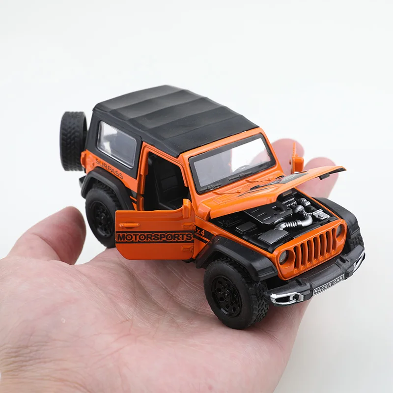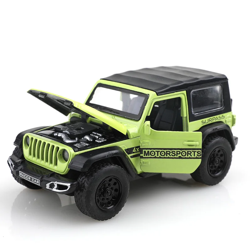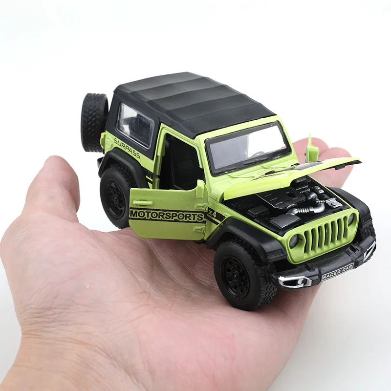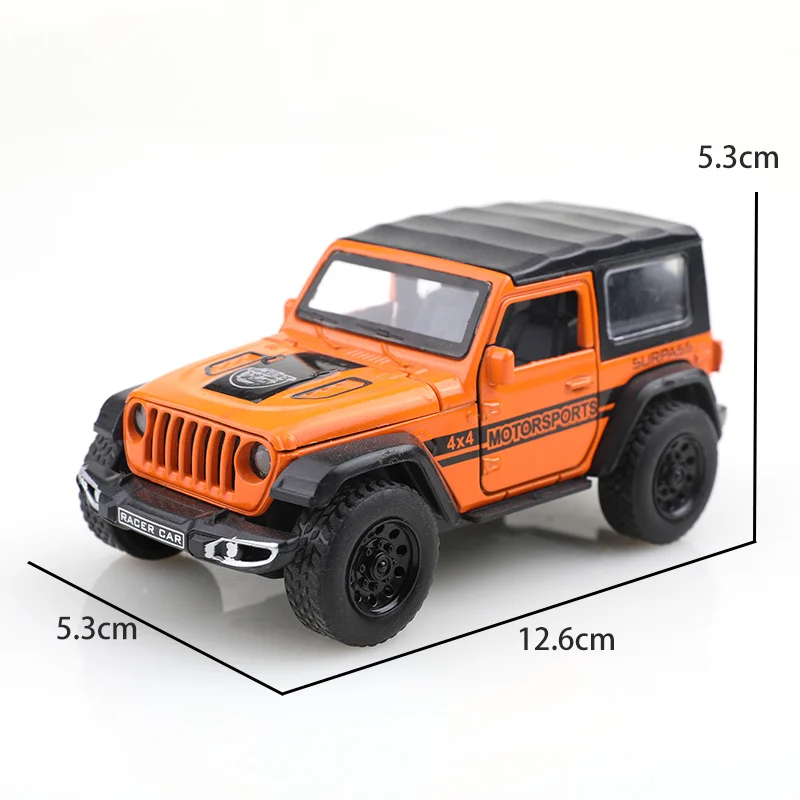 Experience the thrill of off-road adventure with this detailed 1:36 scale die-cast metal vehicle, available in striking green, silver, or orange. Featuring a rugged, closed-top design with four openable doors, the model boasts a powerful pullback mechanism for dynamic acceleration. Crafted from durable metal, this realistic toy is perfect for collectors and enthusiasts aged 4 and above. Its authentic design includes a distinctive grille, round headlights, detailed wheel arches, and large tires with intricate tread patterns mounted on black multi-spoke rims, embodying a tough, sporty aesthetic ready for imaginative off-road journeys.