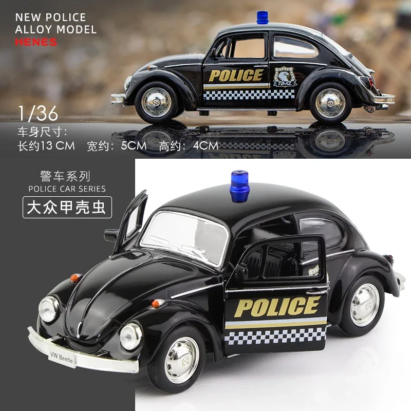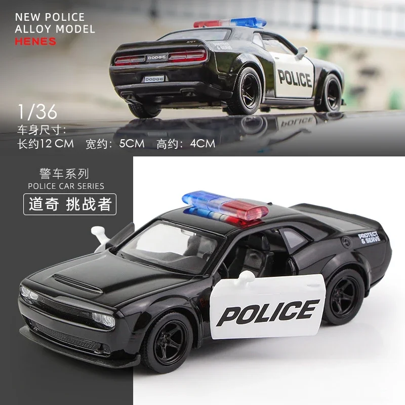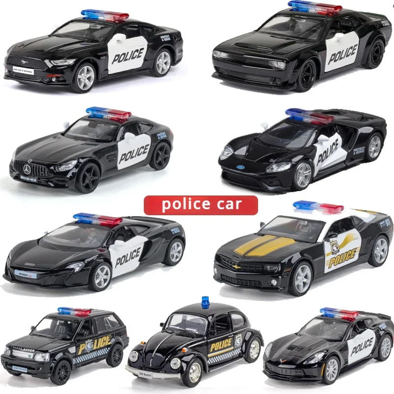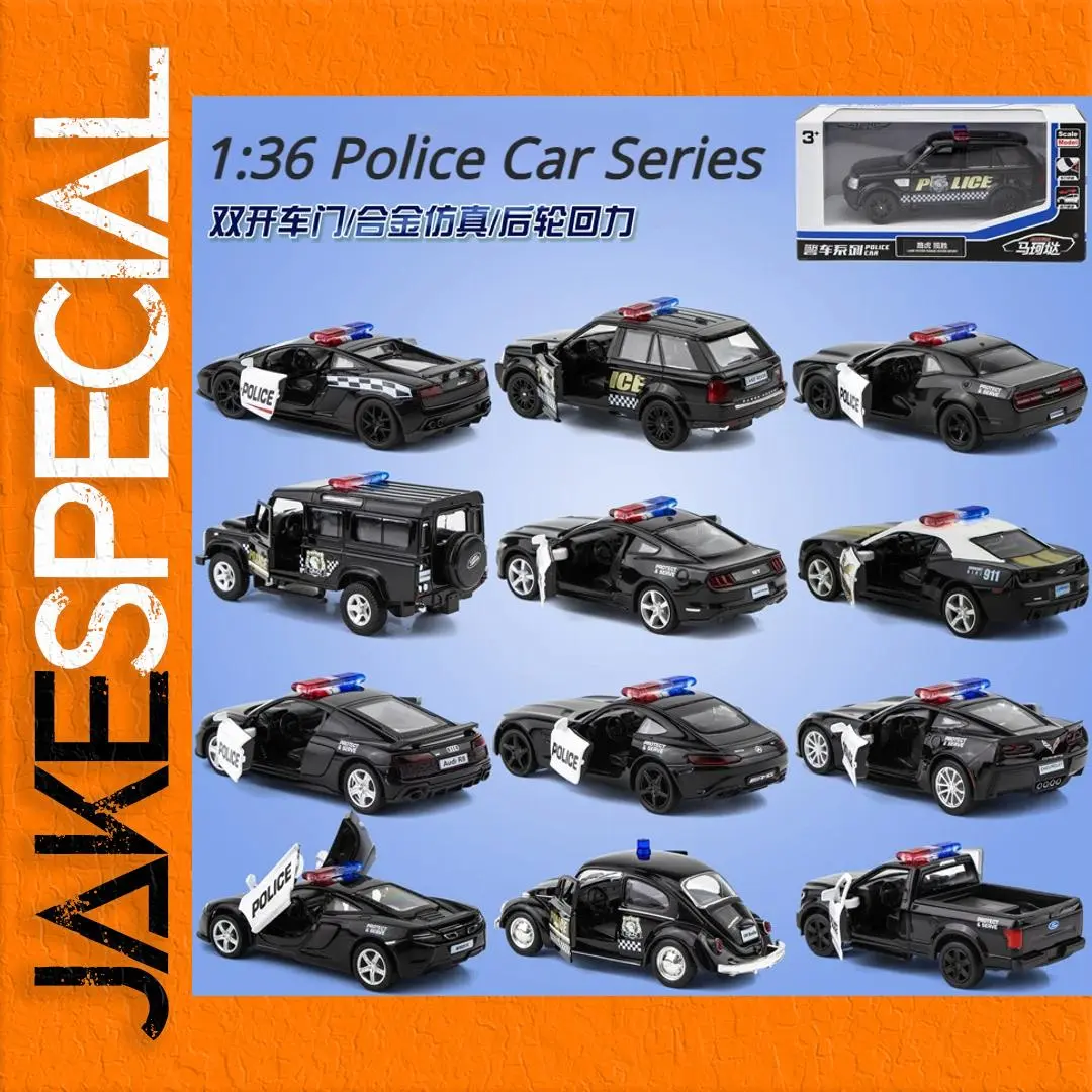 This 1:36 scale diecast model car collection features a striking series of police vehicles made from high-quality zinc alloy, with an advanced engineering plastic chassis and rubber wheels. Showcasing a range of models including a Mustang, Dodge, and Volkswagen Beetle, each car features a bold black color scheme with eye-catching blue and red light bars. Designed with functional details, the models include opening doors for interior access, flexible wheels for realistic movement, and a pull-back function that propels them forward. Perfect for collectors, these meticulous replicas embody authenticity and dynamic design.