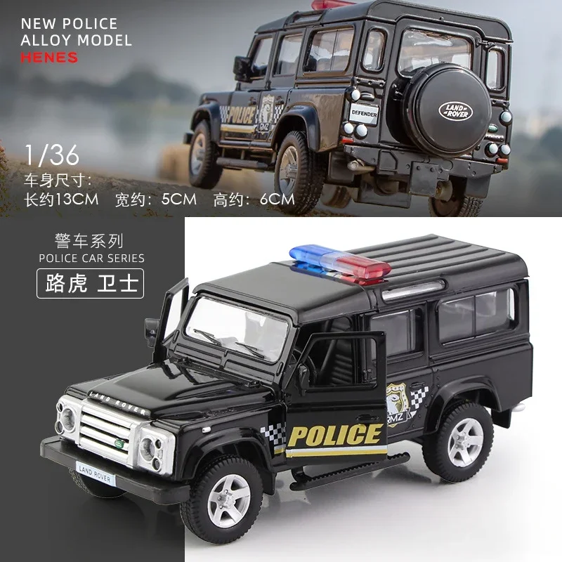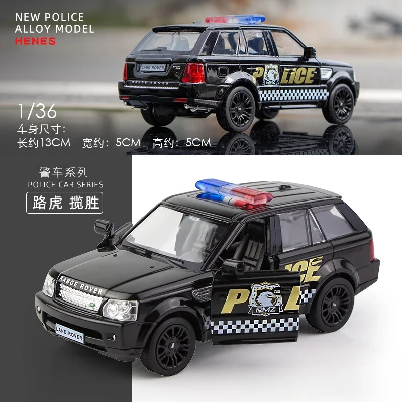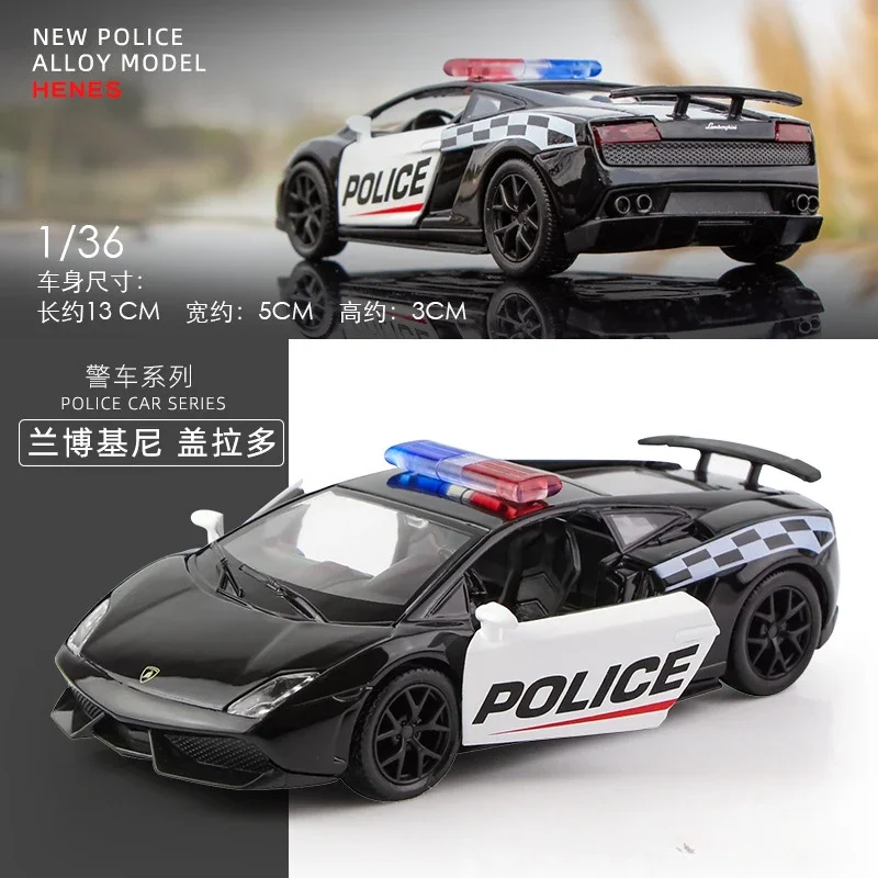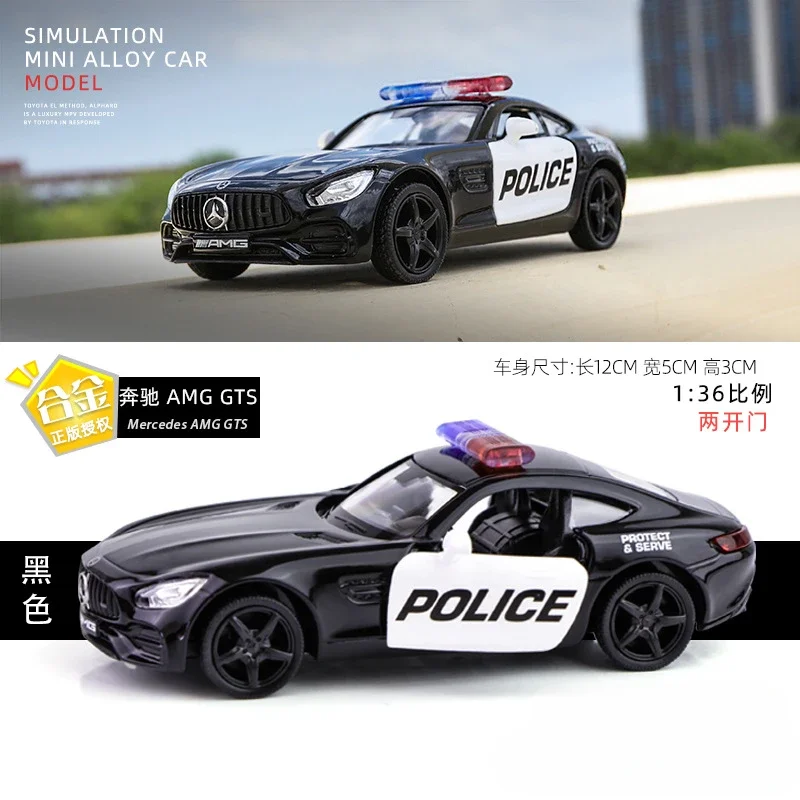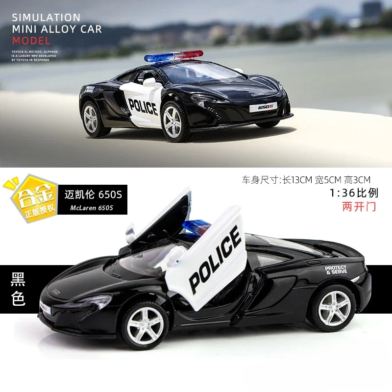 This 1:36 scale diecast model car collection features a striking series of police vehicles made from high-quality zinc alloy, with an advanced engineering plastic chassis and rubber wheels. Showcasing a range of models including a Mustang, Dodge, and Volkswagen Beetle, each car features a bold black color scheme with eye-catching blue and red light bars. Designed with functional details, the models include opening doors for interior access, flexible wheels for realistic movement, and a pull-back function that propels them forward. Perfect for collectors, these meticulous replicas embody authenticity and dynamic design.