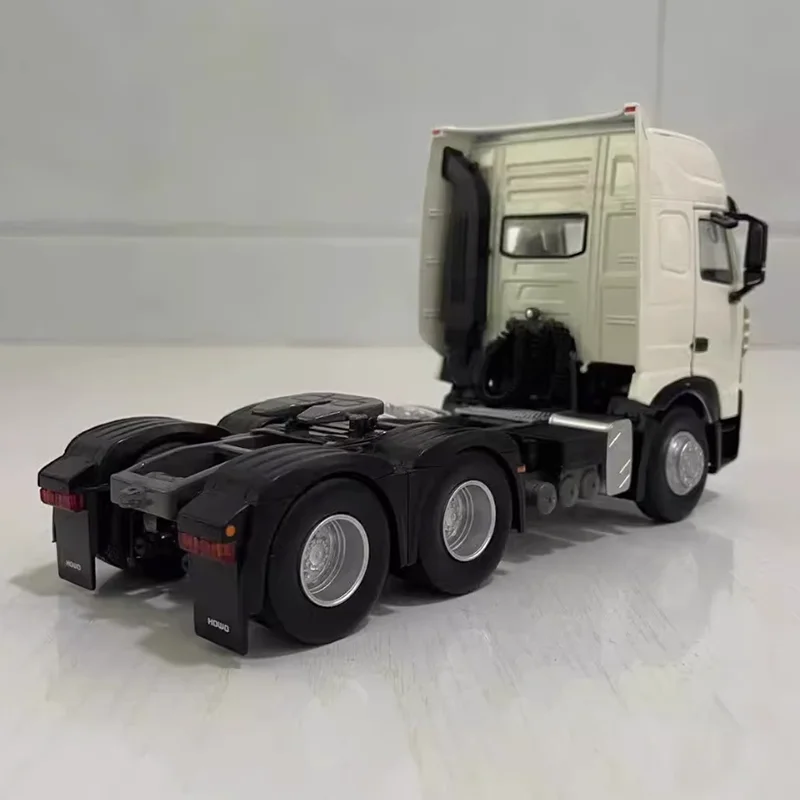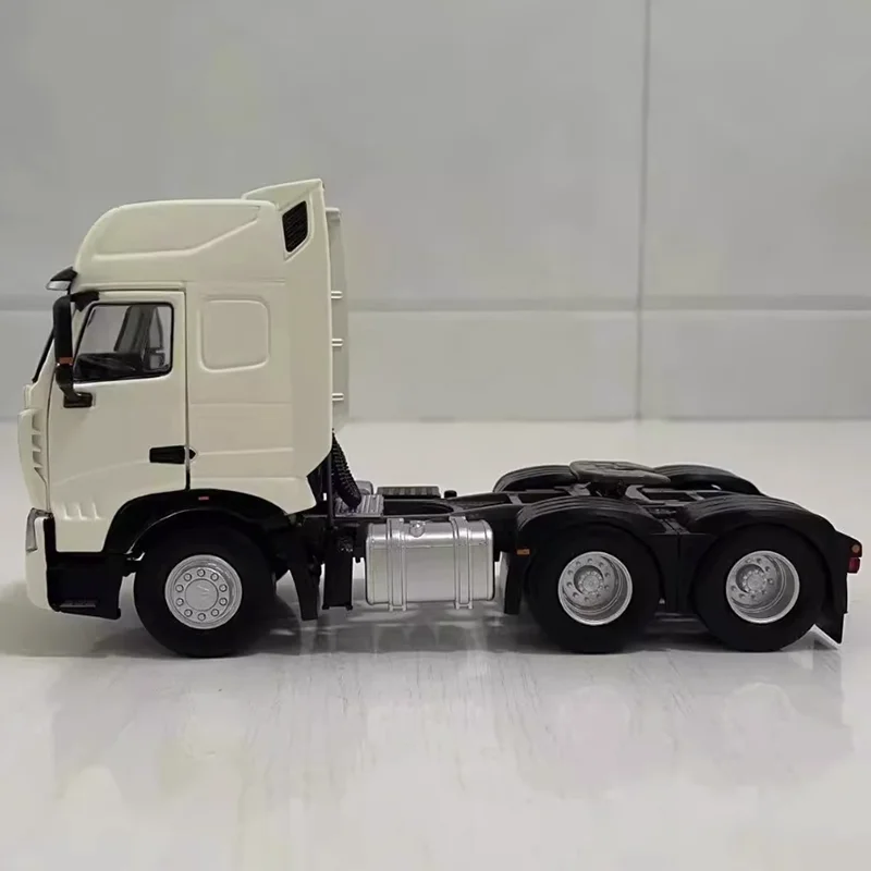 Imagine adding this meticulously crafted diecast alloy model of the HOWO TH7 MAX tractor truck to your collection. With its glossy white finish and subtle black and grey accents, this model exudes modern industrial appeal. The sleek, aerodynamic design features a smooth cab surface, highlighted by an intricate grille, silver emblem, and realistically detailed headlights. The flip-forward cab, opening doors, and movable rear saddle make it a highly functional display piece. The turnable front wheels with textured tires, liftable radiator cap, and silver hubcaps demonstrate superb craftsmanship. Its compact size of approximately 19cm long, 5cm wide, and 8cm high makes it perfect for display. This model blends aesthetics with authentic details for an impressive collector’s item or gift.