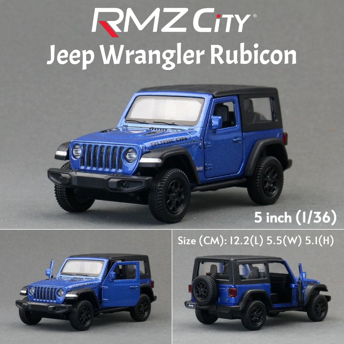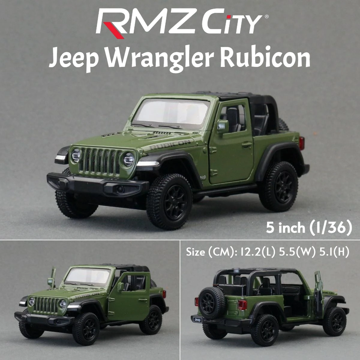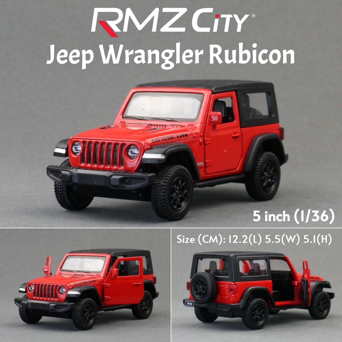- Constructed entirely from metal, featuring realistic off-road tires with textured treads, multi-spoke black wheels, and authentic exterior details like door handles, side mirrors, and “Rubicon” decals.