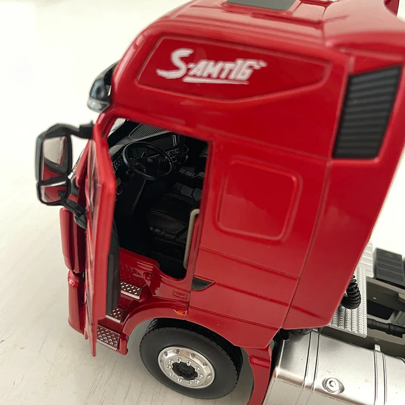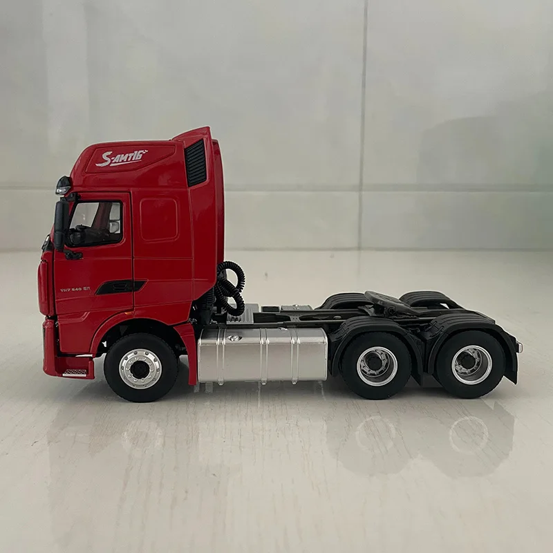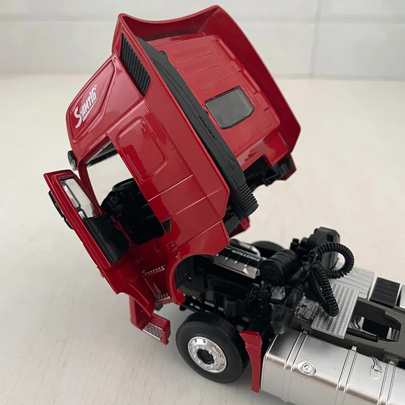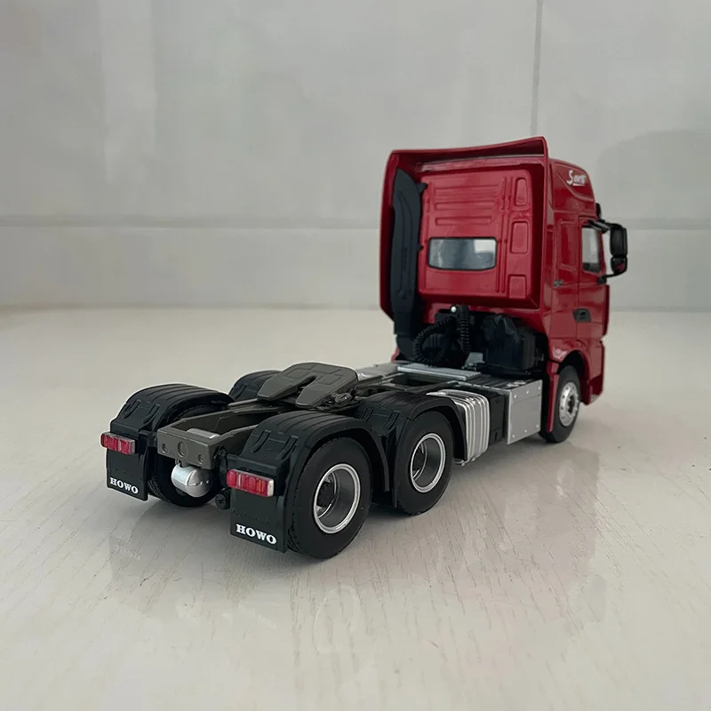 Experience the impressive realism of this high-quality 1:36 scale alloy model of a HOWO TH7 tractor truck. Crafted with precision, it features a bold bright red finish enhanced by detailed black and chrome accents. The cab’s design is meticulously recreated, showcasing a black grille with horizontal chrome bars, transparent windshield, and side windows outlined in black trim. The model’s doors have small black handles, and extended side mirrors add to its authenticity. The roof displays Chinese characters and a white logo, with “TH7 540” printed on the side for added detail. The black rear chassis contrasts beautifully with silver rims and metallic features like the fuel tank, embodying realistic structural elements. This model embodies craftsmanship, durability, and aesthetic excellence, making it a striking display piece for enthusiasts.