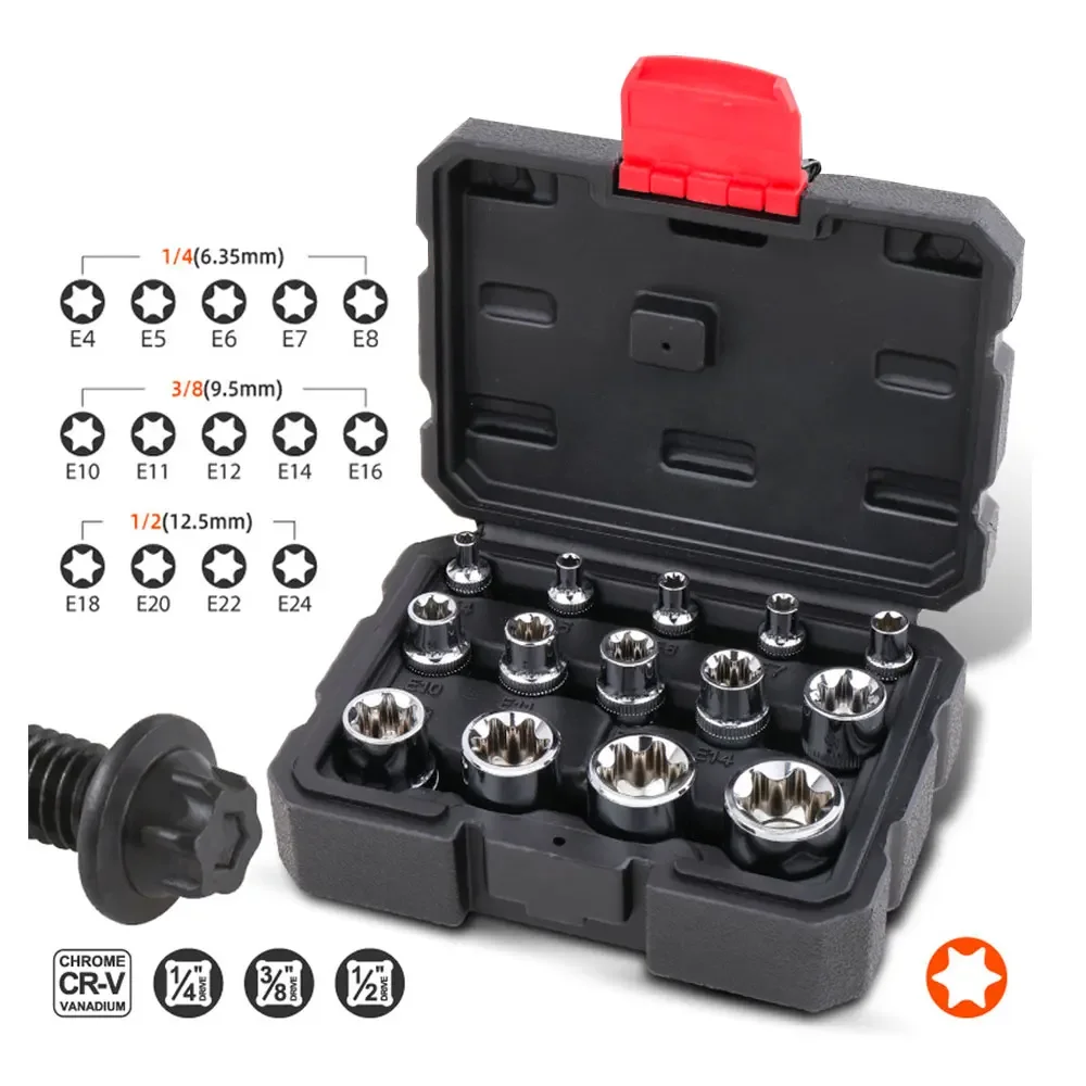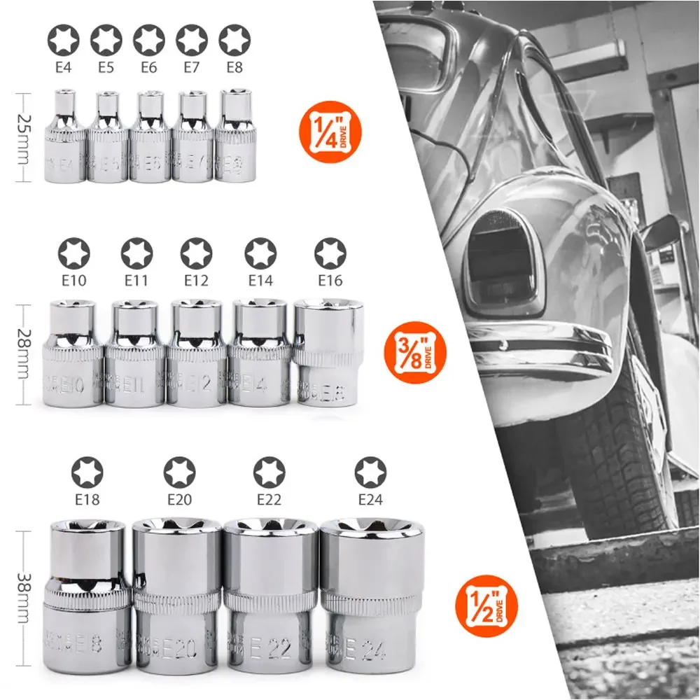 - Three drive sizes included: 1/4″ (E4 – E8), 3/8″ (E10 – E16), and 1/2″ (E18 – E24), ensuring compatibility with most standard torque tools.