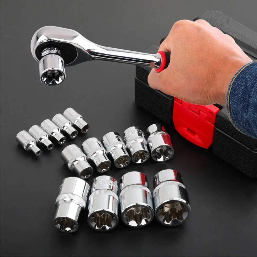 Step into a world of precision and reliability with this exceptional 14-piece female E-TORX socket set. Crafted from durable chromium-vanadium steel, each socket features a high-polish finish, reflecting light with a sleek metallic sheen. Encountered with this set, you'll appreciate its organized case with custom-molded slots that keep each piece securely in place. Whether you're tackling professional projects or demanding DIY tasks, this set’s range of sizes and drive compatibility ensures versatility and a perfect fit. Imagine confidently working on intricate assemblies or heavy-duty machinery, knowing this set offers the precision and durability required for torque transfer. It’s an essential addition for ensuring efficient, damage-free, and professional results every time.