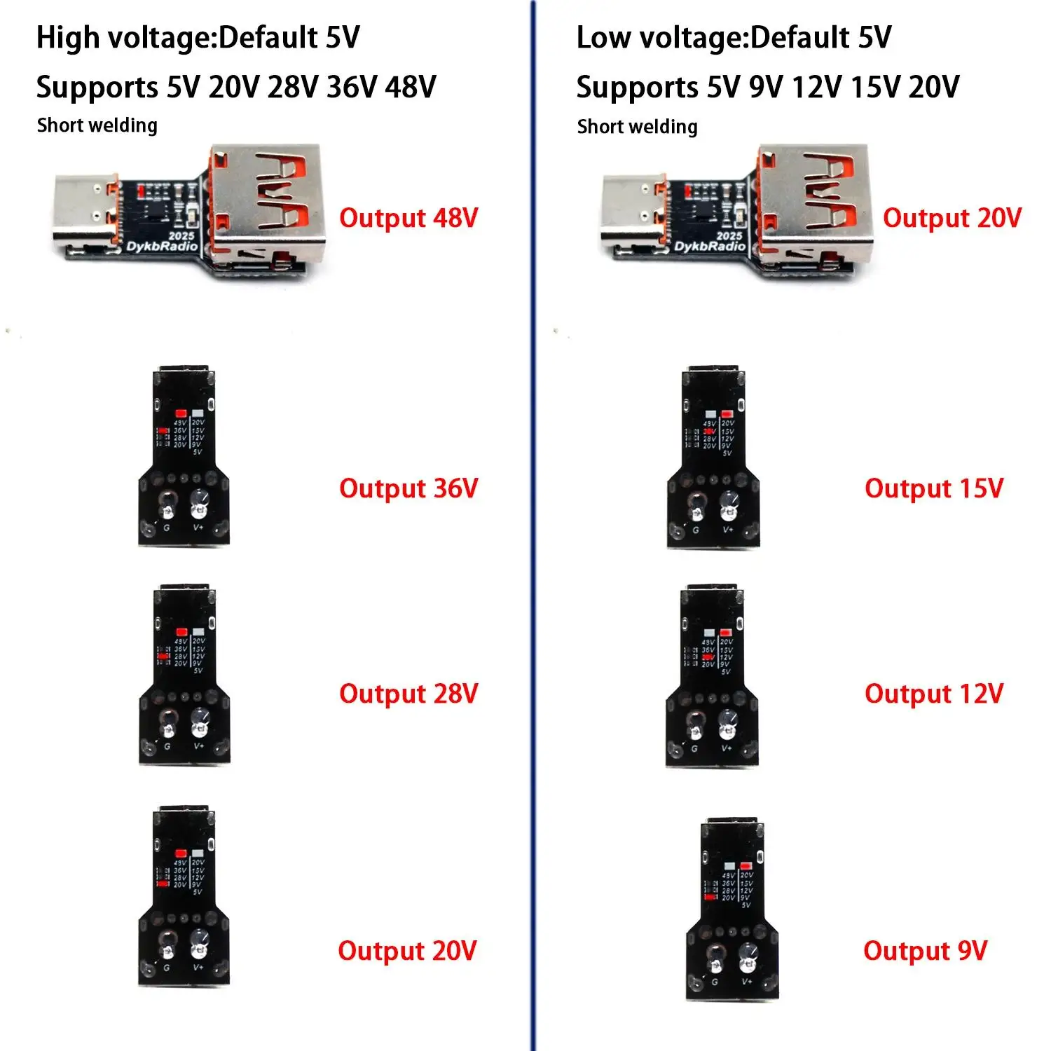 - Adjustable output voltages: default 5V; options for 9V, 12V, 15V, 20V (low voltage version), or 5V, 20V, 28V, 36V, 48V (high voltage version) by shorting specific pads.