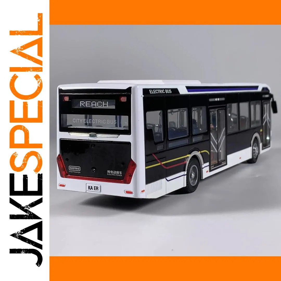 Bring home this detailed 1:42 scale alloy metal diecast model of a modern electric city bus, featuring sound and light functions powered by a button battery. Available in striking Black, Blue, and Red options, this miniature ornament showcases realistic design elements like transparent windows, sliding doors, and metallic hubcaps on rubber tires. Its precise craftsmanship and subtle detailing make it an attractive desktop decor piece or collector’s item. Crafted without hazardous chemicals and suitable for adults 18 and over, this modern city bus model will add a touch of sophistication and contemporary charm to any interior space, perfect for enthusiasts and collectors alike.