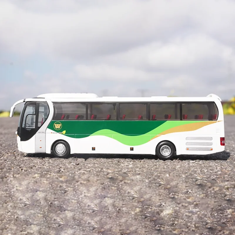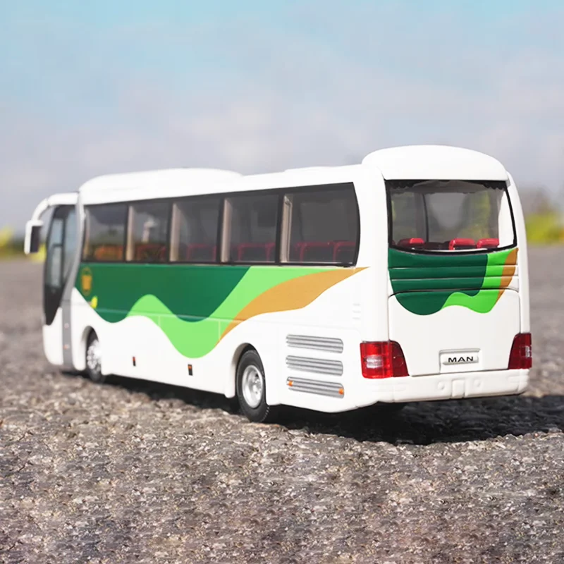 Immerse yourself in the craftsmanship of this highly detailed 1:42 scale alloy replica of the iconic MAN R41 bus. Measuring approximately 26 centimeters long, this model captures the essence of the real vehicle with precision. Its sleek white body serves as the perfect canvas for eye-catching green and yellow graphics, including a bold swooping stripe and a subtle yellow wave accent. The large, curved transparent windshield and rectangular tinted windows reveal a minimalist interior with red seats, adding realism. Constructed from durable alloy, this static display piece boasts silver alloy rims on black tires. It’s an ideal collectible or gift for enthusiasts seeking a realistic, visually impressive model that embodies the charm of the original bus.