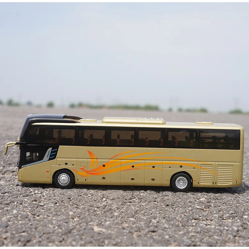 Experience the beauty of this highly detailed 1:42 scale Yaxing bus model, crafted with meticulous precision. Made from durable zinc alloy, engineering plastic, and rubber, it captures the sleek, modern design of a passenger coach. With its elegant black, gold, and beige palette, the model exudes sophistication and realism. The aerodynamic shape, sharp headlights, large curved windshield, and tinted grey side windows offer a lifelike appearance. Vibrant orange decorative graphics add a touch of dynamism, while the gold accents enhance the luxurious feel. Its realistic wheels with white hubcaps further elevate its craftsmanship. This collectible model is perfect for display, gifting, or personal decoration, offering a true-to-life miniature of the actual vehicle.