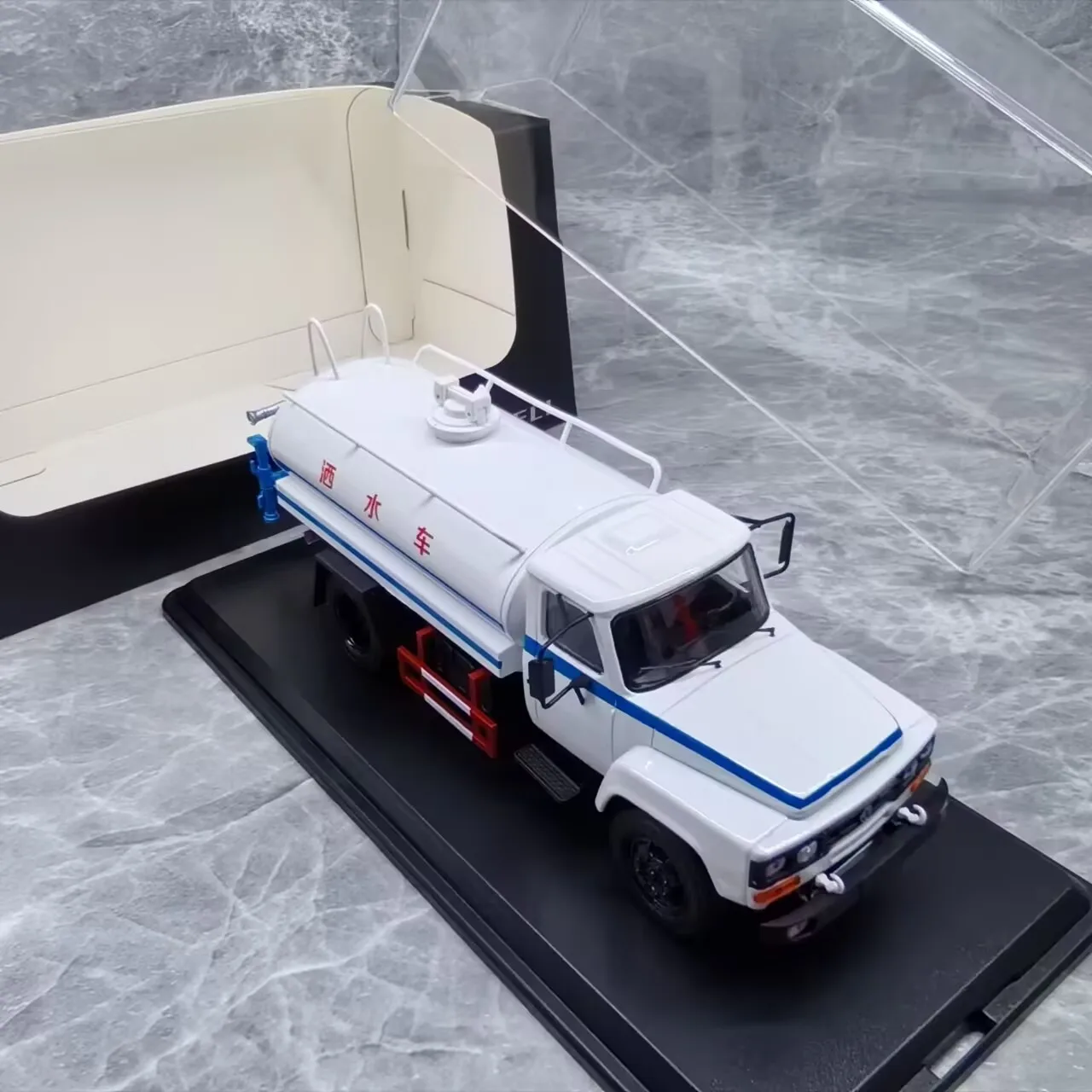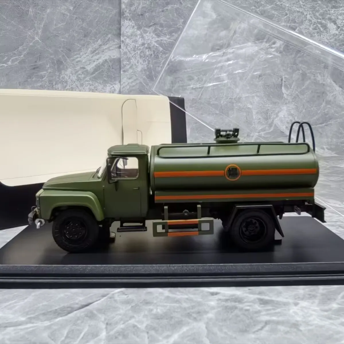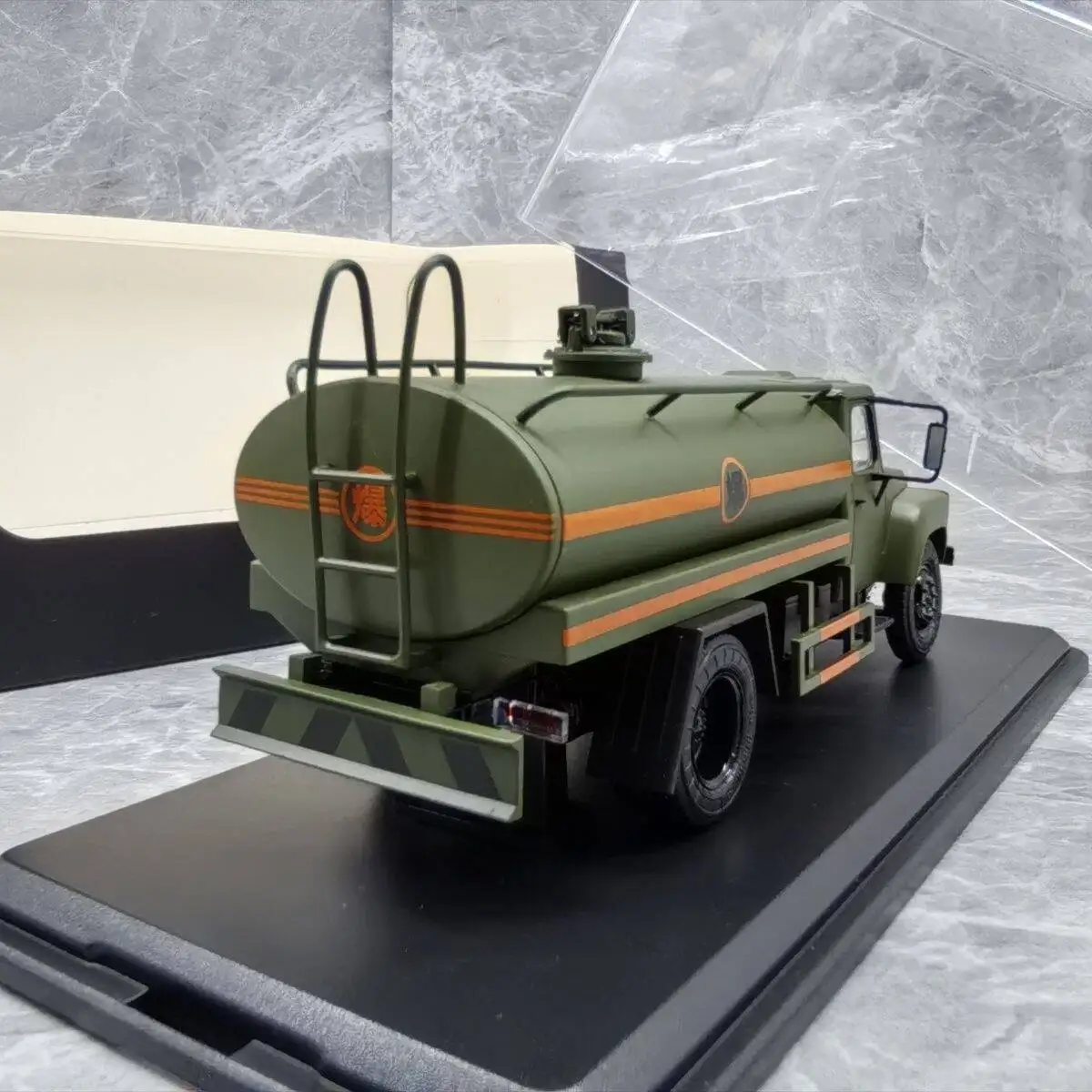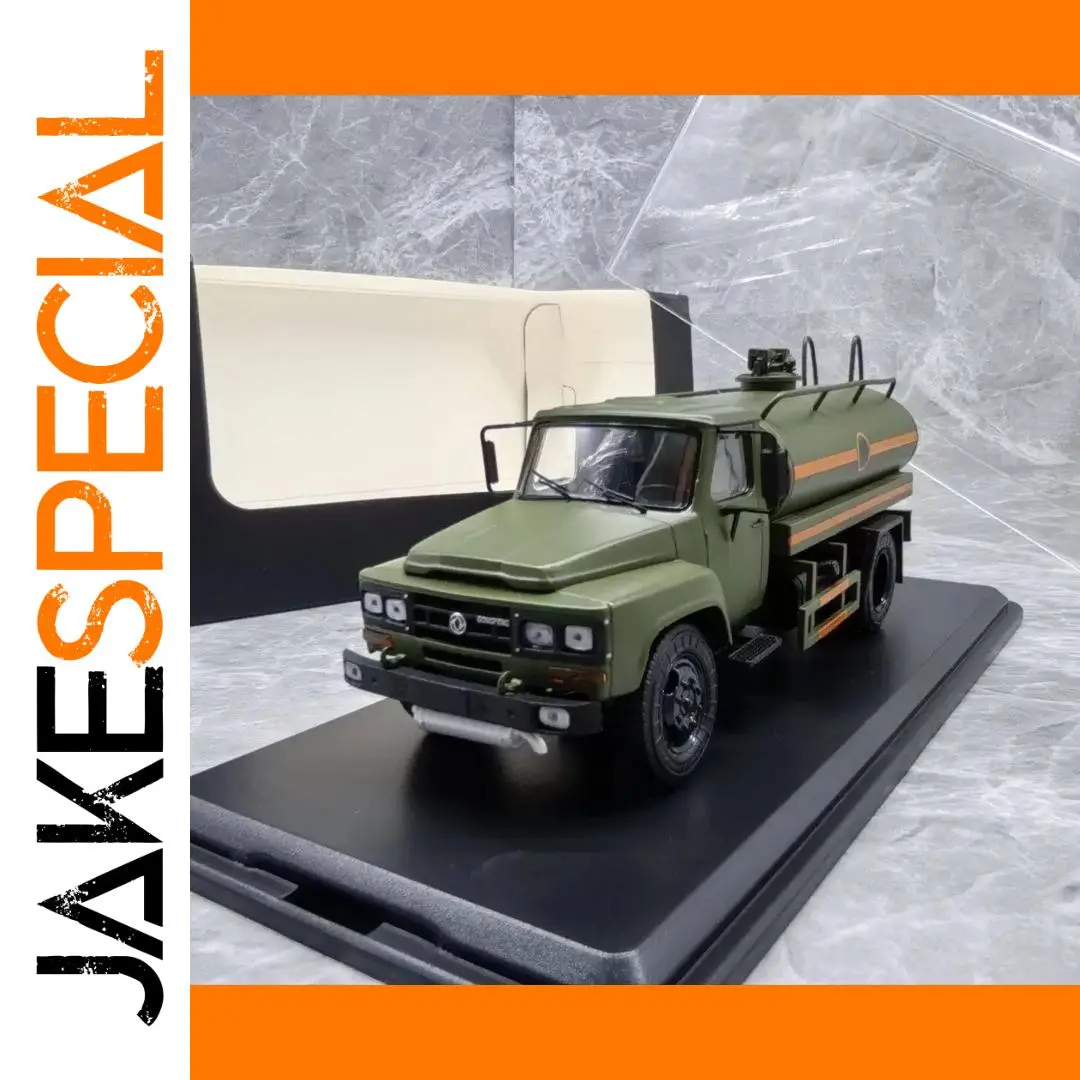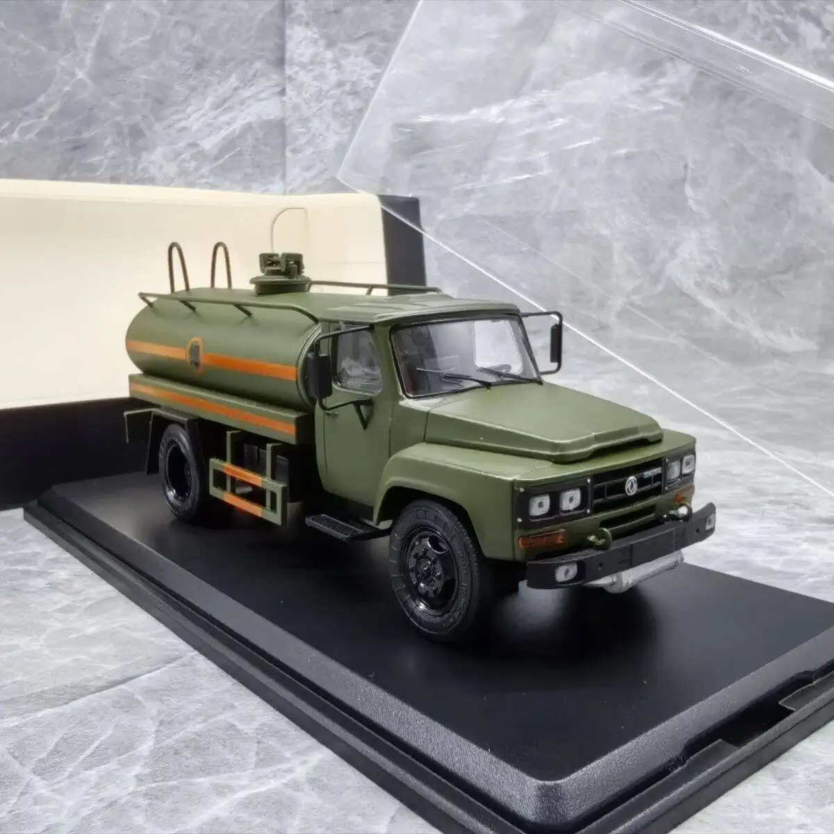 Experience the realism of this 1:43 scale diecast alloy tanker oil truck model, crafted from durable metal and plastic. Featuring a matte olive green finish with bold black accents on the grille, mirrors, chassis, and wheels, it showcases a striking orange stripe along the cylindrical tank, adding visual interest. The model displays a realistic, utilitarian design with a rounded tank, angular cab, detailed black-tread wheels, and a black display base. Available in classic red, blue, and white colors, this miniature is perfect for adult collectors and enthusiasts seeking a detailed, collectible display piece or gift, suitable for ages 18+.