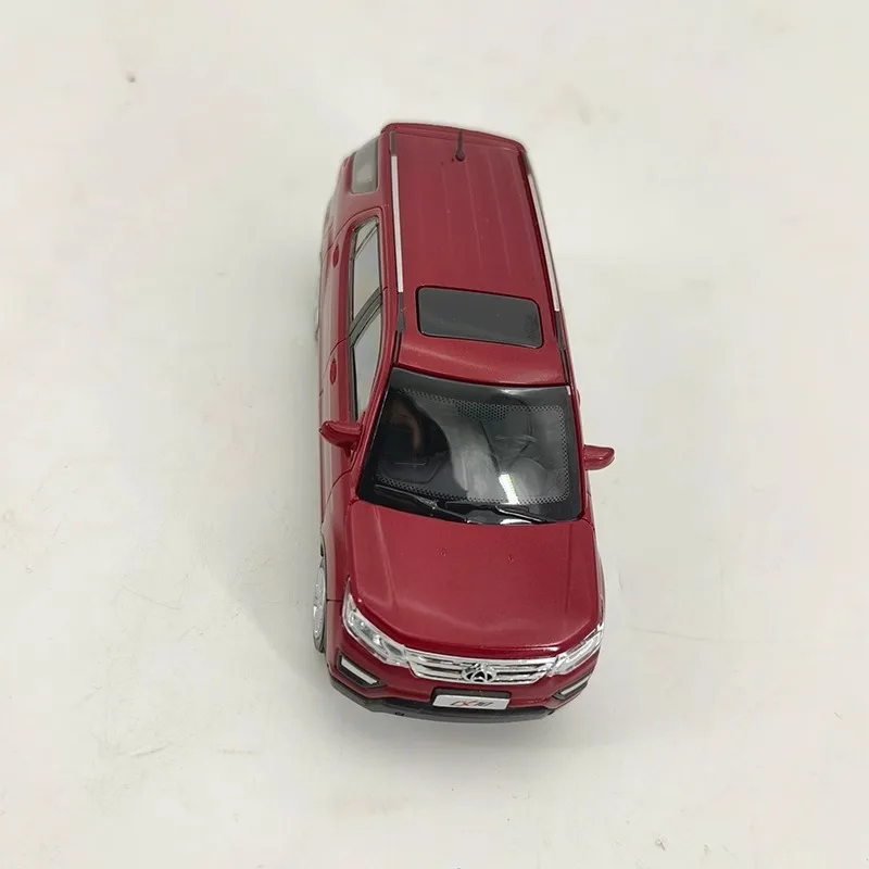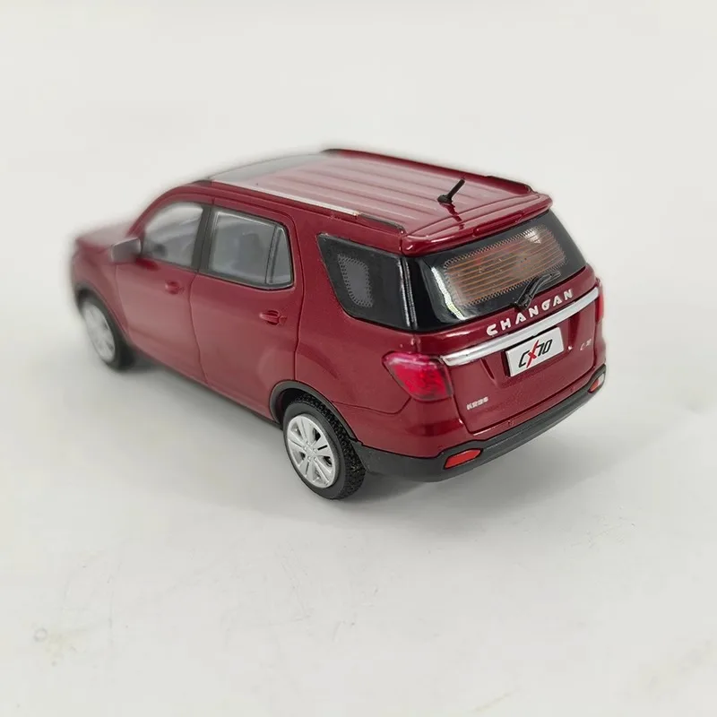 This exquisite 1:43 scale Changan CX70 plastic car model ornament features a striking glossy red finish with white wheel accents, crafted from durable ABS plastic and equipped with lifelike rubber tires. It showcases intricate details including clear plastic windows and finely designed headlights, all resting on a silver-colored display box with embossed texture. Measuring 10 cm in length, 8 cm in width, and 5 cm in height, this delicate diecast model is perfect for collectors and admirers of automotive art. Please note, it is recommended for ages 14 and above due to its small parts and intricate design.