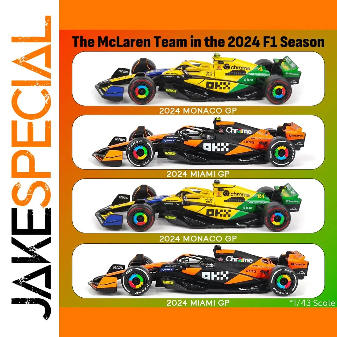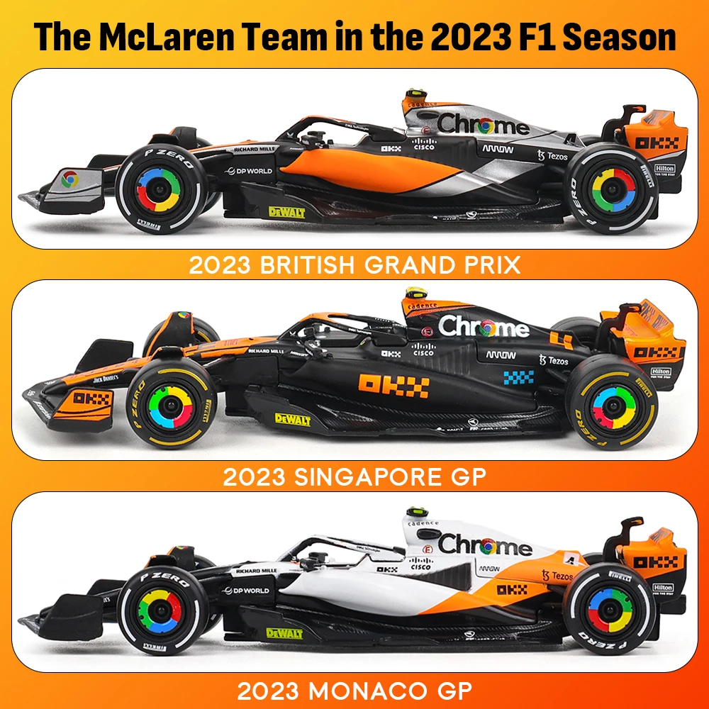 - Vibrant color schemes representing different seasons, including 2023 MCL60-4 and 2024 MCL38-81GP liveries, to showcase racing evolution.