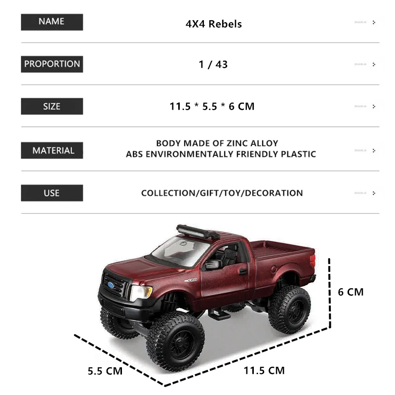Experience the rugged appeal of this detailed 1:43 scale die-cast alloy model featuring iconic Jeep, Chevrolet, Ford, and Volkswagen 4×4 vehicles. Crafted from durable metal and finished with precision, these models come in various colors representing classic and modern designs such as the 1953 Chevrolet, 1999 Chevrolet, 1999 Ford F-350, 2014 Chevrolet, 2017 Chevrolet, 2019 Chevrolet, 2019 Ford, Ford F-150, Jeep Wrangler, and Volkswagen. Certified with CE standards, this non-electric collection is suitable for collectors aged 4 and above. Each model is securely packed in a shock-absorbing foam box to ensure perfect condition upon arrival, making it an ideal addition to any automotive enthusiast’s collection.
