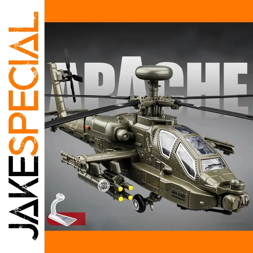 Experience the realism of the 1:46 scale diecast Apache attack helicopter model, crafted from alloy and plastic with intricate surface details. This highly detailed collectible features functional sound and light effects, enhancing its authenticity. The model showcases a sleek military green finish, with a transparent cockpit canopy revealing a finely detailed interior, robust main rotor blades with a rounded central hub, and side attachments including missile pods and rocket launchers with yellow-tipped projectiles. Surfaces are adorned with raised panels, rivets, and engravings for added texture. Suitable for enthusiasts aged 14+, this model is perfect for display and collection, offering a captivating blend of precision engineering and military aesthetics.