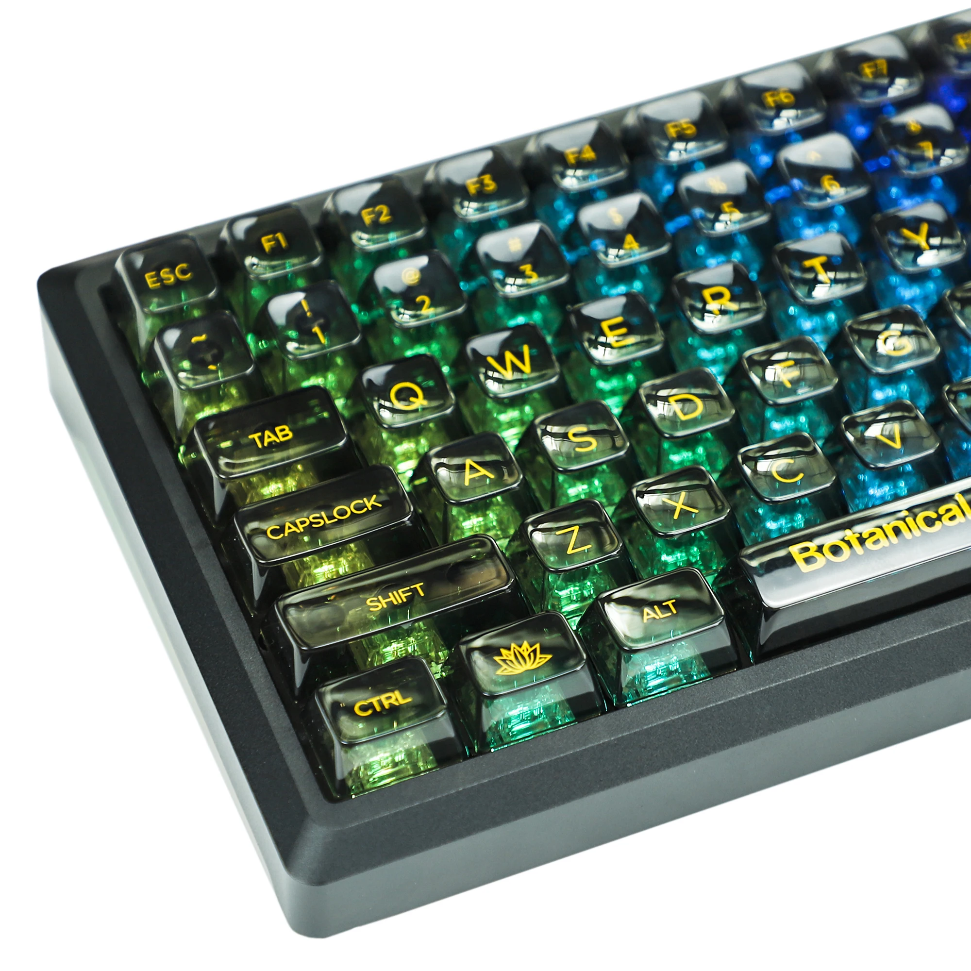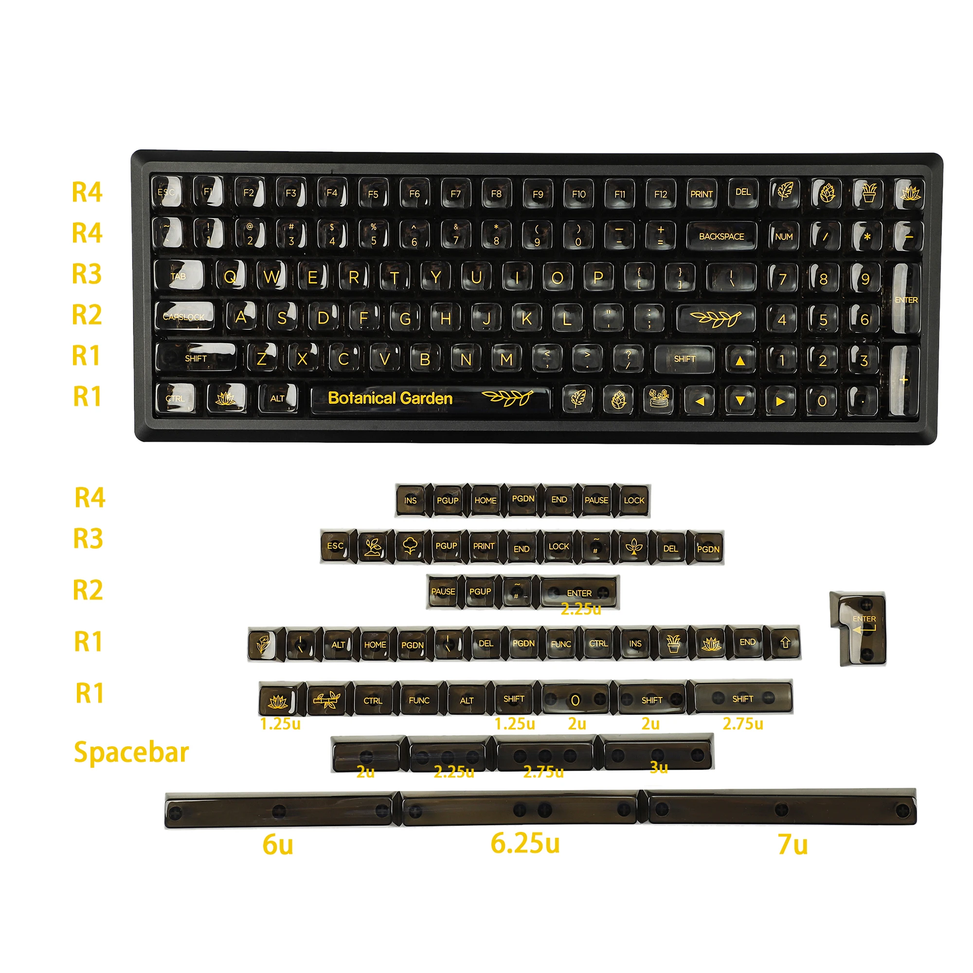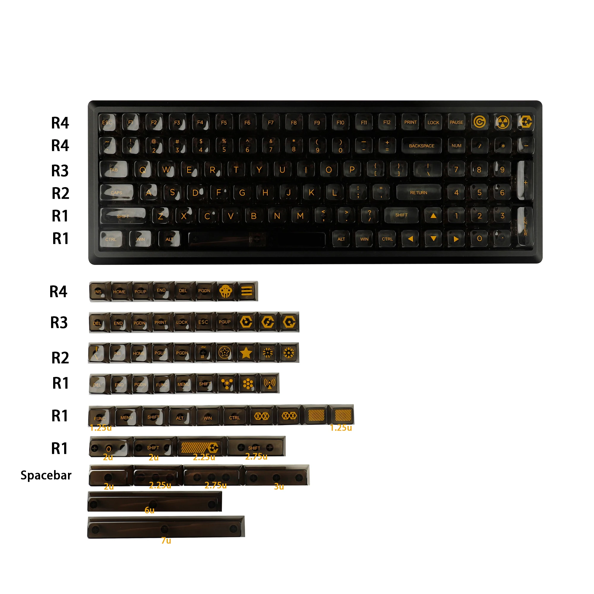 Transform your mechanical keyboard with this set of 148 crystal backlit keycaps featuring an ergonomic MDA profile and glossy translucent black finish. Made from durable PC material with UV-printed bright yellow legends, these approximately 1.2mm thick keycaps allow stunning RGB lighting to shine through, creating a vibrant, modern aesthetic. Compatible with most standard MX switch keyboards spanning 61 to 108 keys, including ANSI and ISO layouts, and designed to fit spaces of 6.25u (11.7cm). The package includes 7 extra spacebars and a puller, perfect for customizing popular layouts such as Planck, Preonic, Wings, Alice, and certain Corsair and Razer models that accept 1.25u keys, excluding low-profile switches.