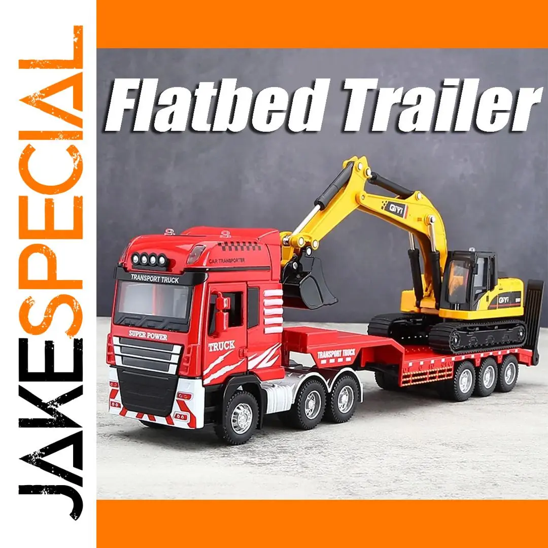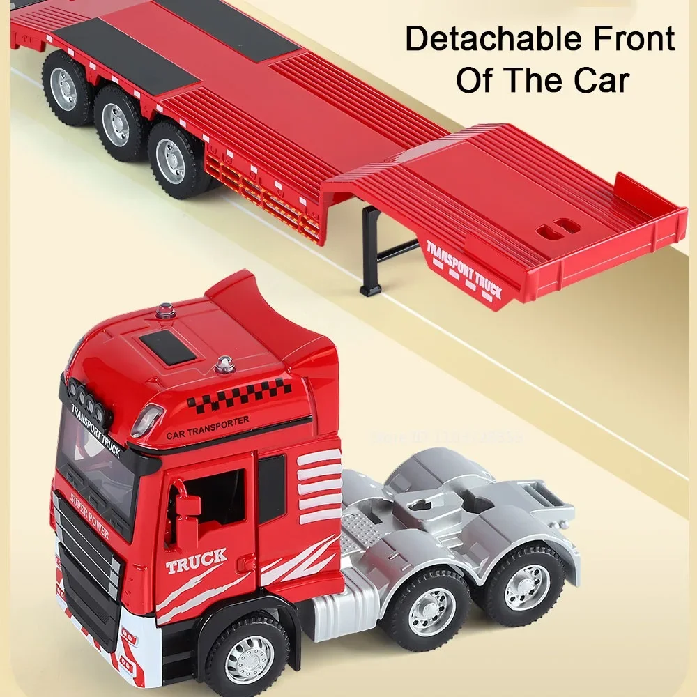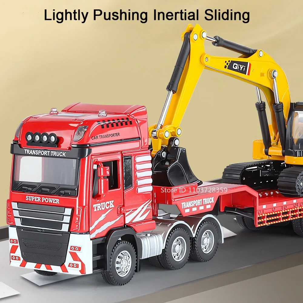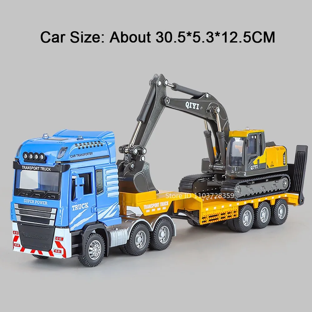 Immerse yourself in the realistic world of construction with this detailed 1:48 scale model of a platform trailer towing excavator. Crafted with a durable alloy metal body, plastic chassis, and rubber tires, this toy offers an authentic industrial look. The vivid red or blue colors with acrylic accents make it visually striking. Its intricate hydraulic piston details, articulated joints, and extendable arm capture the ruggedness of real heavy machinery. With functional lights, sounds, sliding tracks, and opening doors, this model provides an engaging experience. The manual disassembly of the front and the lowering tailboard further enhance realism, making it an ideal gift for passionate collectors or enthusiasts eager to bring construction sites home.