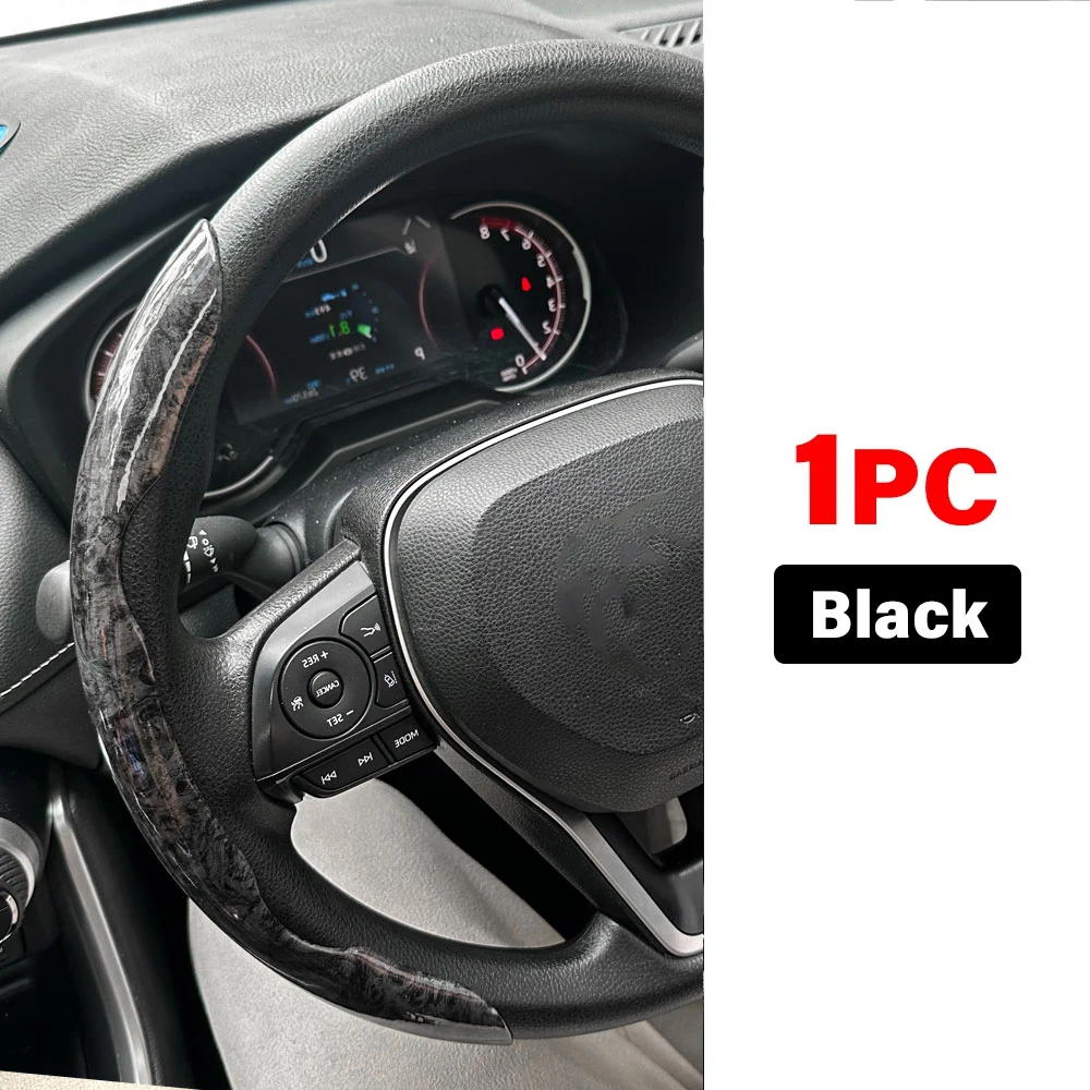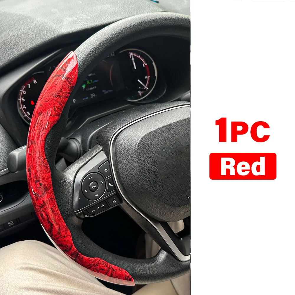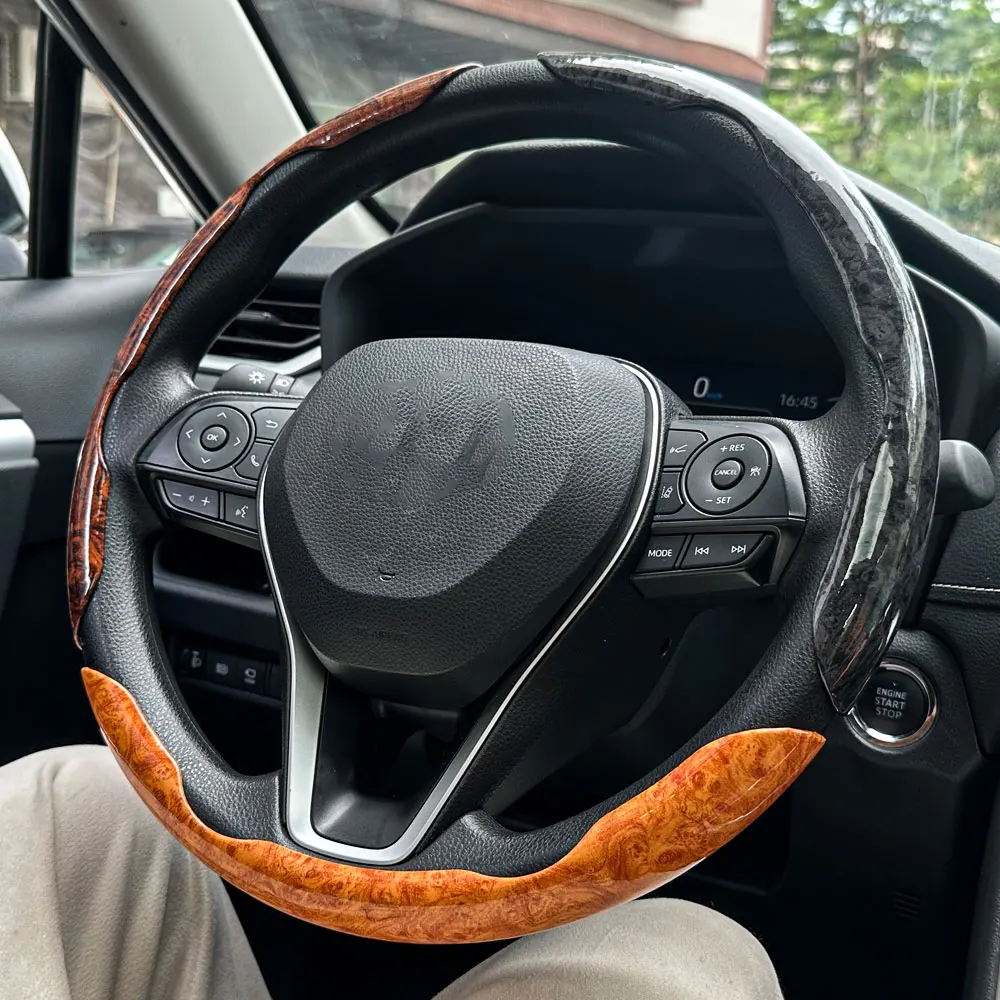- Made from microfiber leather with a glossy, textured carbon fiber finish enhances interior appearance. The layered pattern adds depth and a modern, high-tech vibe. Suitable for a 15-inch steering wheel.
