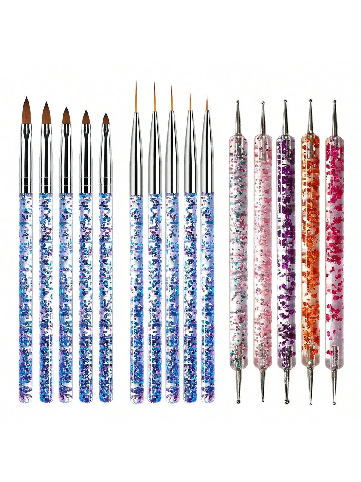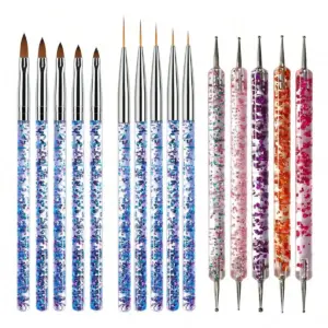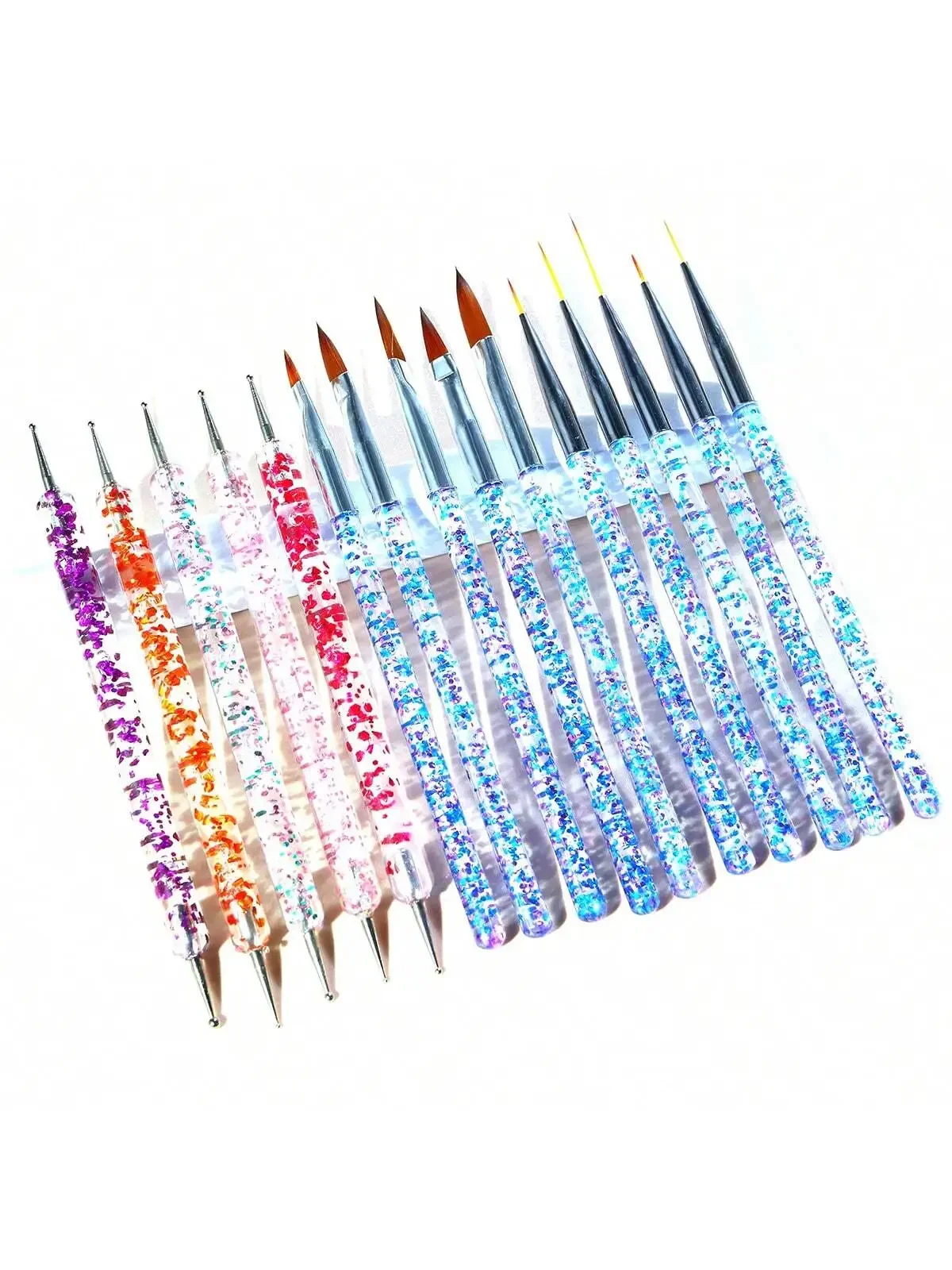 Enhance your nail artistry with this 15-piece nail art brush set, featuring UV gel nail polish brushes, acrylic nail brushes, and other professional manicure tools. Crafted from high-quality pen material, these brushes are free from concerning chemicals, ensuring safe and precise application. The set includes a variety of brush sizes and styles, from large flat and rounded tips perfect for base coats and surface coverage, to slender, pointed metal tips ideal for intricate detailing and fine lines. With shimmering handles embedded with multicolored glitter particles in blue, pink, purple, orange, and green, complemented by shiny silver ferrules, this collection offers both style and functionality to elevate your nail design experience.