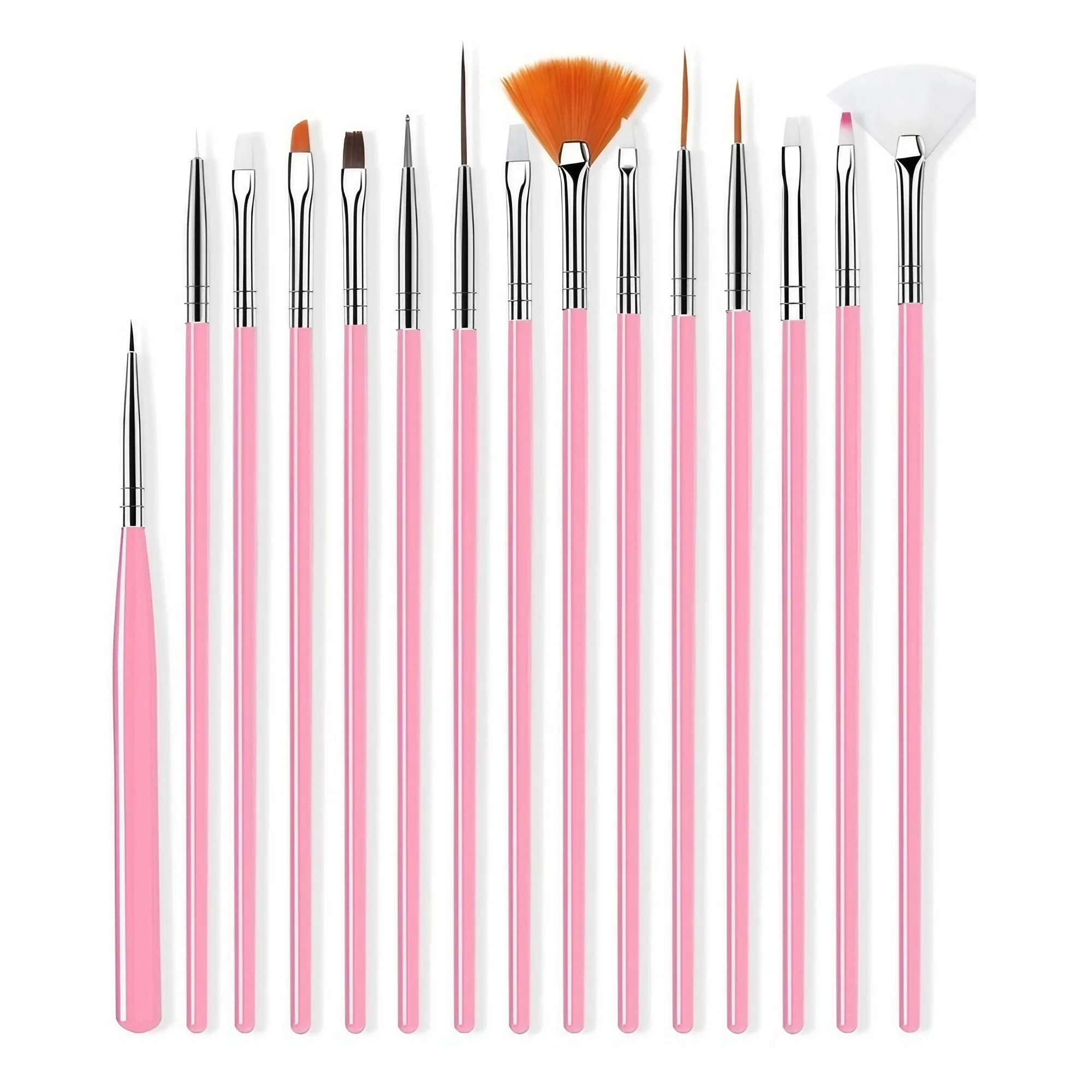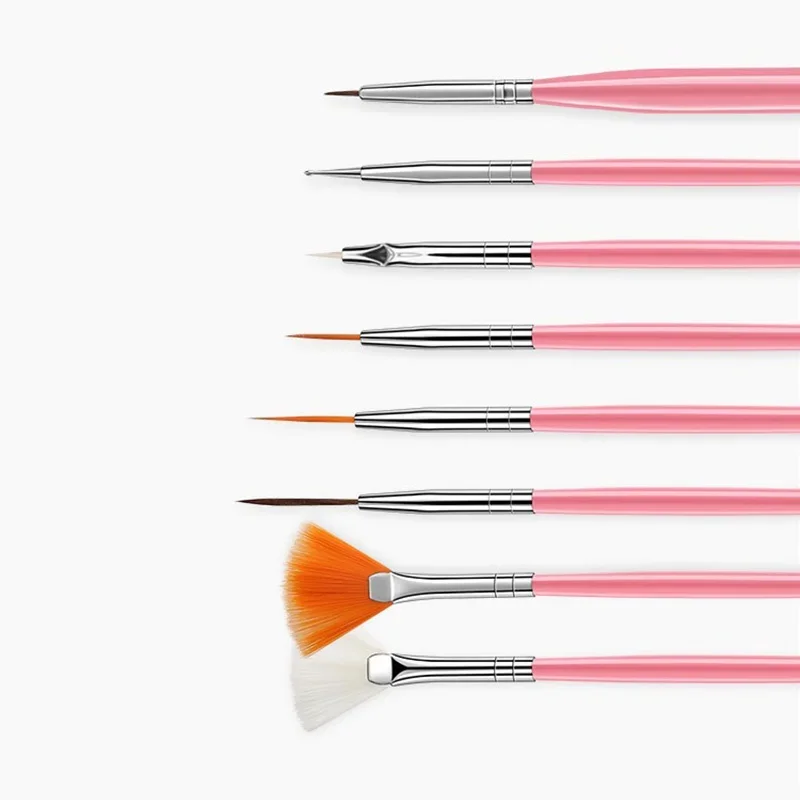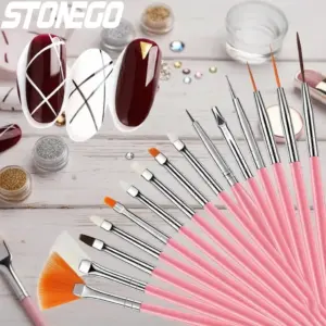Transform your nail art experience with this carefully curated 15-piece nail art brush set. Designed with precision and durability in mind, each tool features a chic metal handle with a soft pink hue, complemented by nylon, plastic, and alloy components. The variety of brush heads—ranging from fine tip lines, flat angles, to fan shapes—allows you to create intricate patterns, detailed flowers, and flawless designs effortlessly. Whether you're a professional nail technician or passionate hobbyist, this set provides the versatility needed for every manicure project. Its portable construction makes it easy to carry, ensuring beautiful, long-lasting results every time. Elevate your nail art game today with this essential collection.