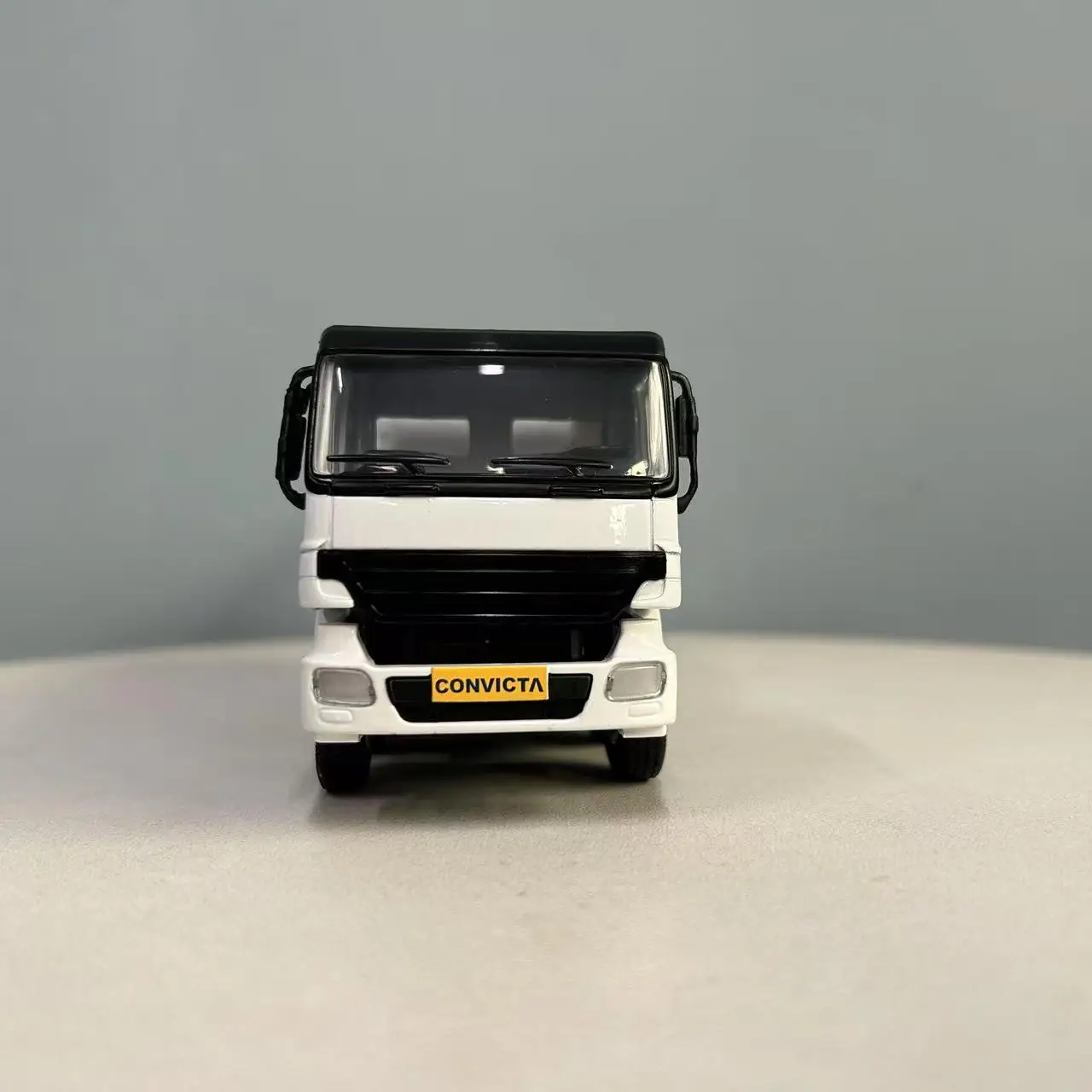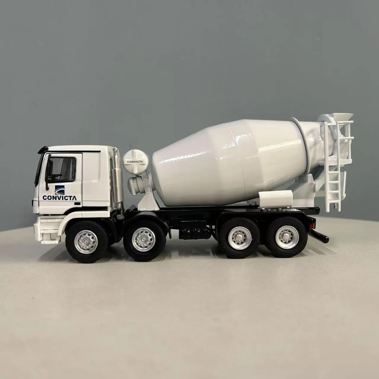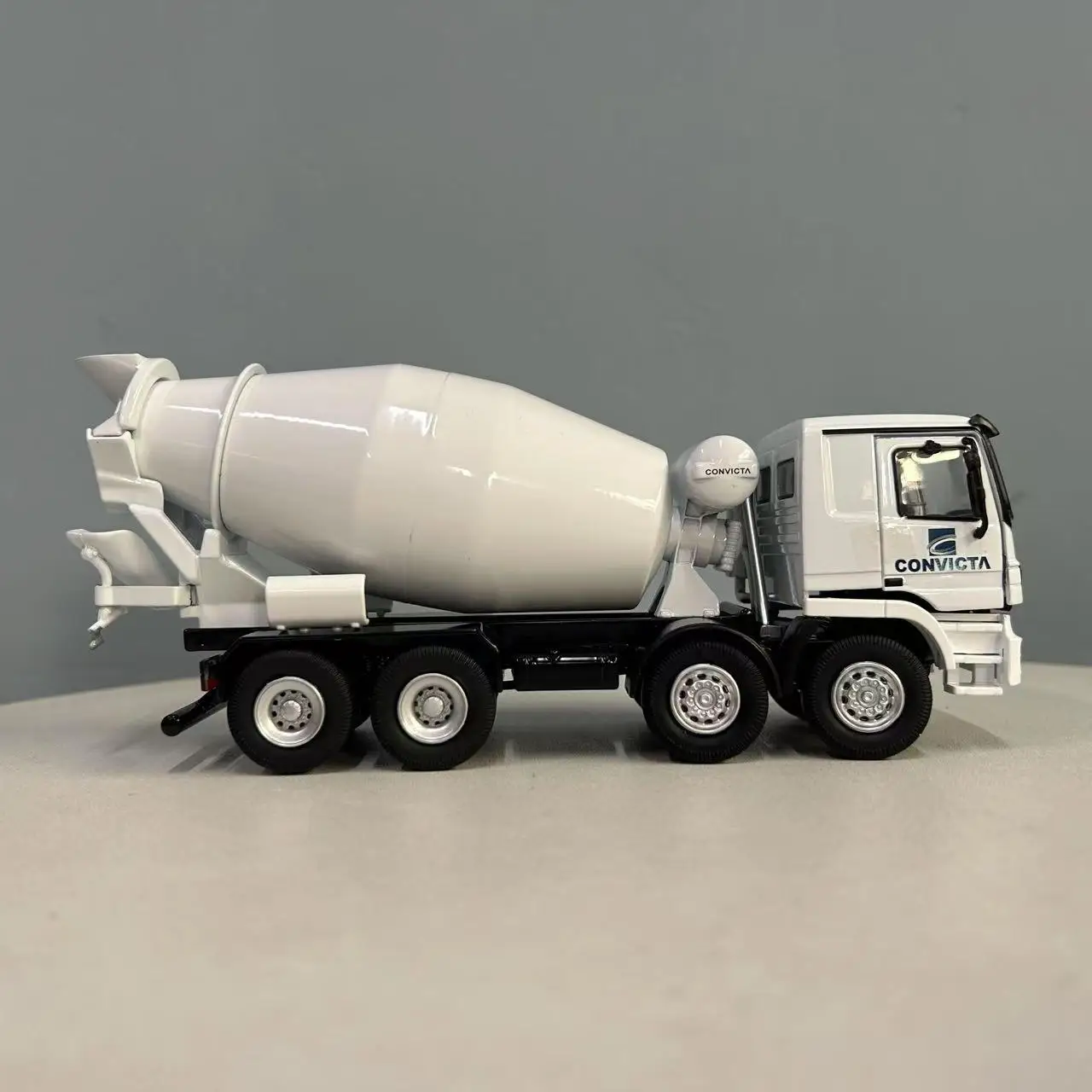 Imagine owning this meticulously crafted mini replica of the Grupo Convicta Auto Betoneira C-8000 cement mixer truck. With its sleek white finish accented with black details, it adds a modern touch to your collection or display space. This true-to-life model features a boxy cab with detailed windows, headlights, and side mirrors, bringing an authentic construction vehicle vibe. The horizontally mounted white mixer drum emphasizes industrial design, while the six tires with realistic treads and hubcaps enhance realism. Despite minor cosmetic imperfections from local defects, the high-quality alloy, plastic, and rubber construction ensure durability and visual appeal. Perfect for display or as a gift, owning this model offers a glimpse into construction machinery craftsmanship.