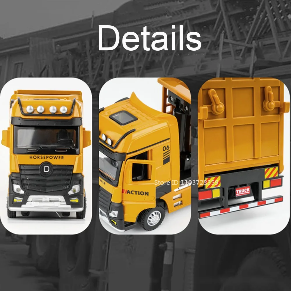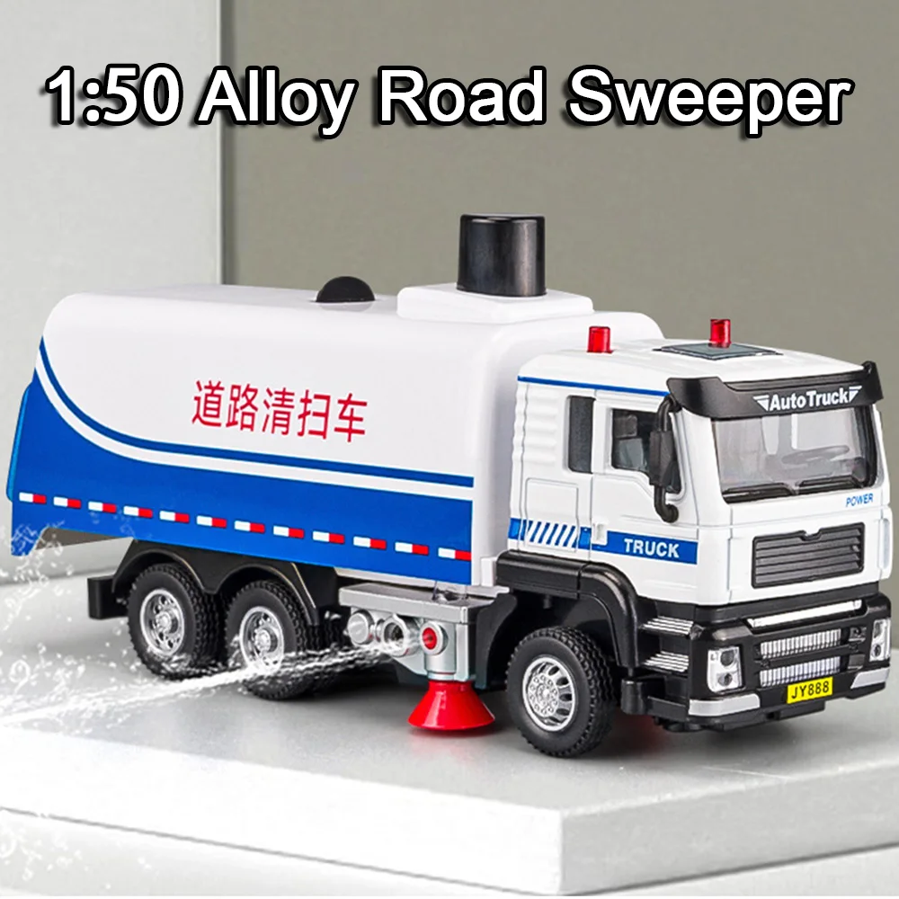 - Technical specifications include 1:50 scale, dimensions of 33 x 5 x 8 cm for the dump truck and 17.5 x 5.5 x 8.5 cm for the sweeper, with rubber tires and functional doors.