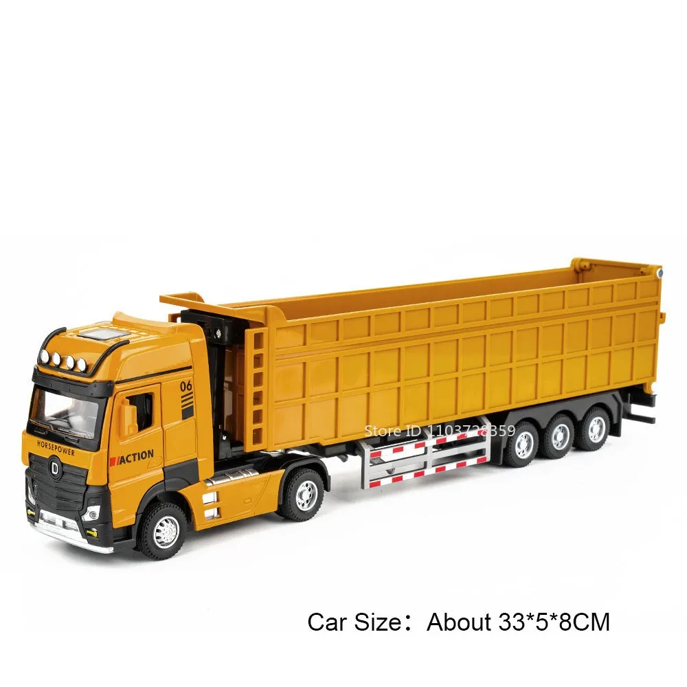 Immerse yourself in the detailed world of construction with this highly realistic 1:50 scale dump truck. Crafted from durable metal and plastic, it measures approximately 33 x 5 x 8 cm, making it an impressive display piece or a fantastic addition to any model collection. The vibrant yellow-orange color with black accents enhances its lifelike appearance, featuring a detailed front grille, headlights, and side mirrors. The trailer extends significantly behind, mimicking a real dump trailer with panel details and support ribs, connected by a sturdy black chassis with visible axles and tires. The rubber tires with detailed treads ensure realism and durability. It combines functionality and craftsmanship for an authentic experience.