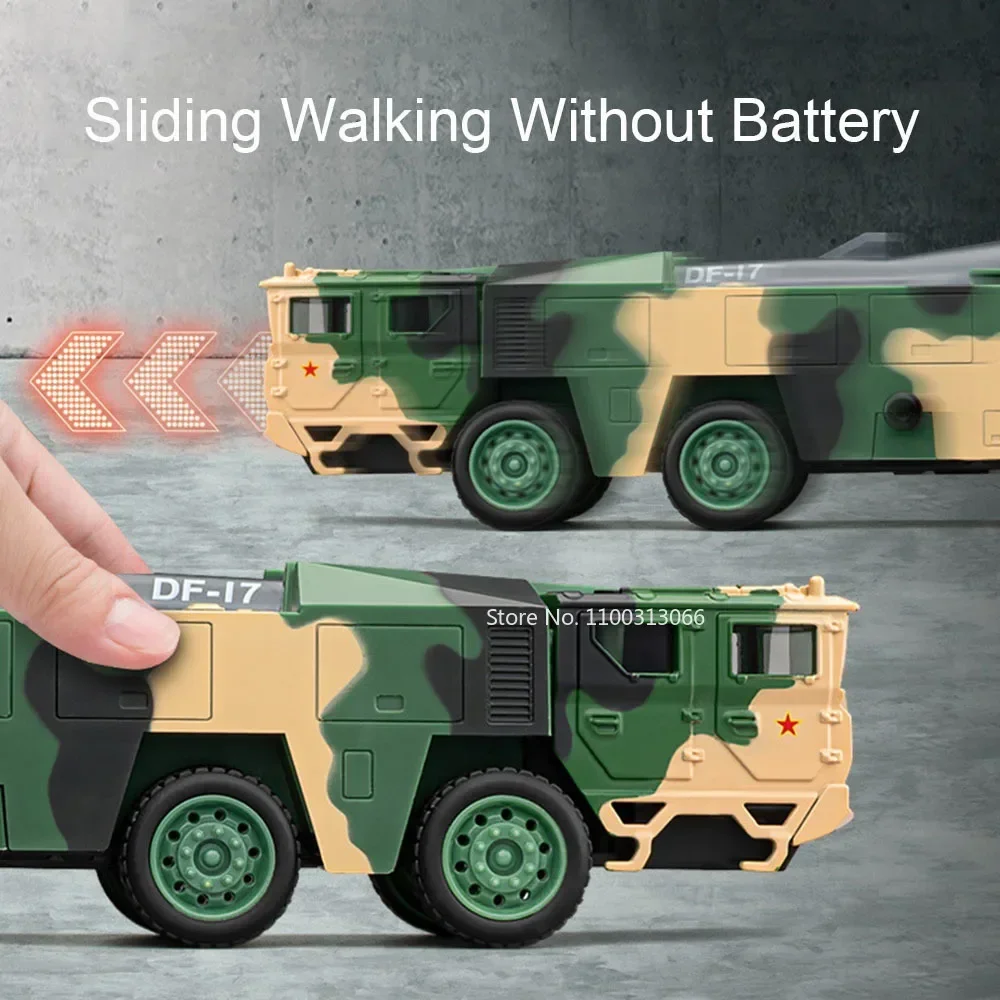 Experience the thrill of owning an authentic military vehicle replica with this detailed 1:50 scale DF-17 missile launch car model. Crafted with a durable metal alloy body, it showcases a striking green camouflage pattern featuring darker green and tan patches, embodying a rugged military aesthetic. The model measures approximately 25.5cm in length, 5.2cm in width, and 5.5cm in height, making it an impressive display piece. It includes an intricately designed alloy front end, plastic chassis, and rubber tires for realistic mobility. Features such as light and sound effects, operated by included button batteries, bring the model to life. With sliding walking functionality, this toy offers an interactive experience perfect for collectors and enthusiasts alike.