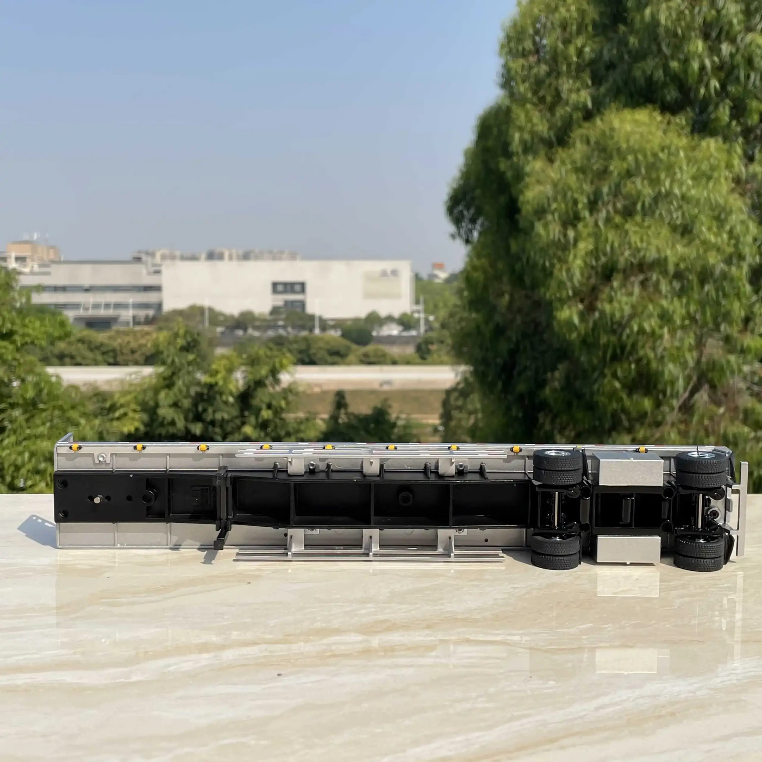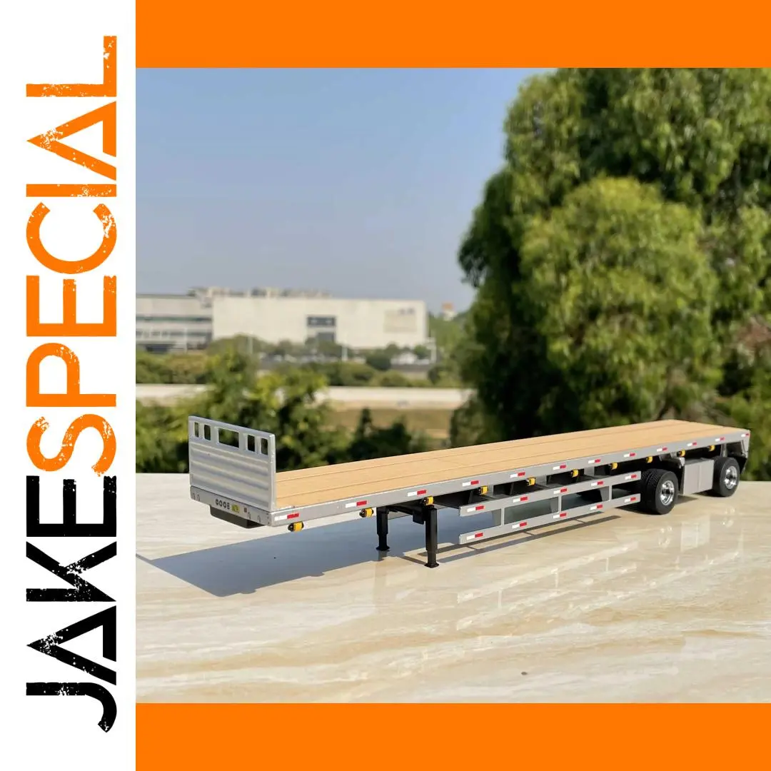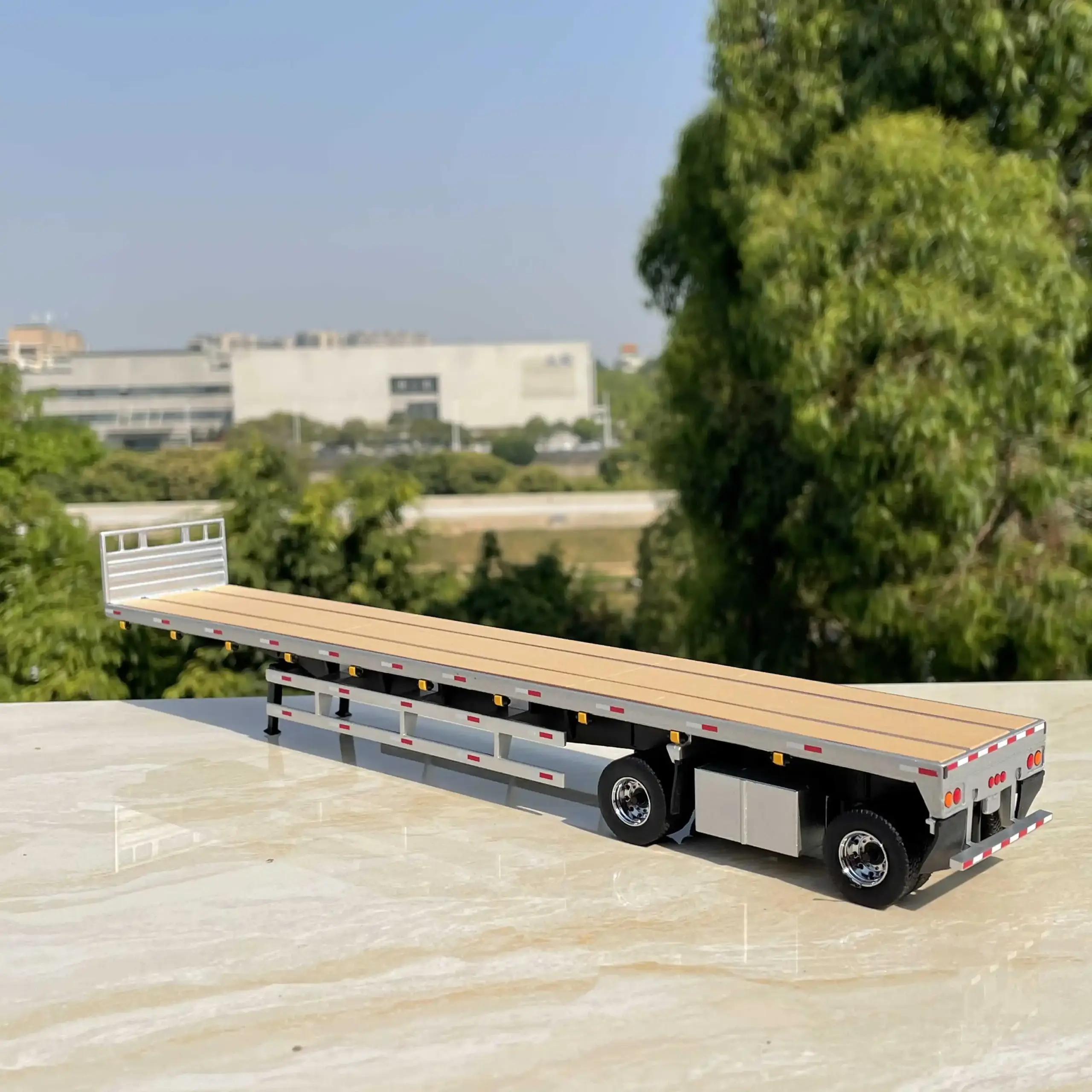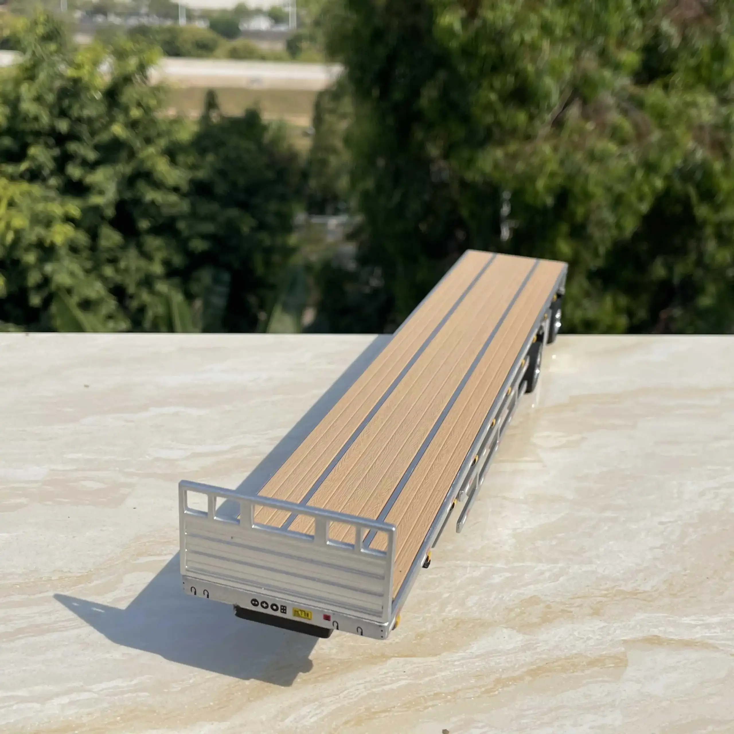 This highly detailed 1:50 scale diecast semi-trailer model features a realistic flatbed trailer with a metallic silver frame and textured natural wood deck. Equipped with black wheels with silver hubcaps and intricate black undercarriage components, including axles and suspension details, it offers an authentic appearance. The trailer has a small raised hitch area at the front and a rear guardrail with openings, capturing the realistic design of a semi-trailer. Made entirely of durable metal, this non-electric display piece is perfect for collectors and enthusiasts aged 14 and above, providing a sleek, utilitarian aesthetic that highlights craftsmanship and attention to detail.