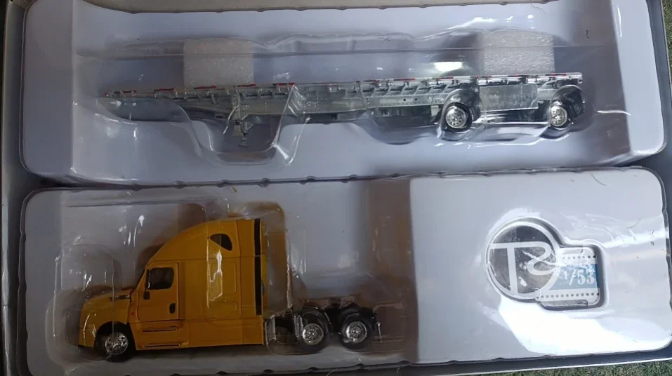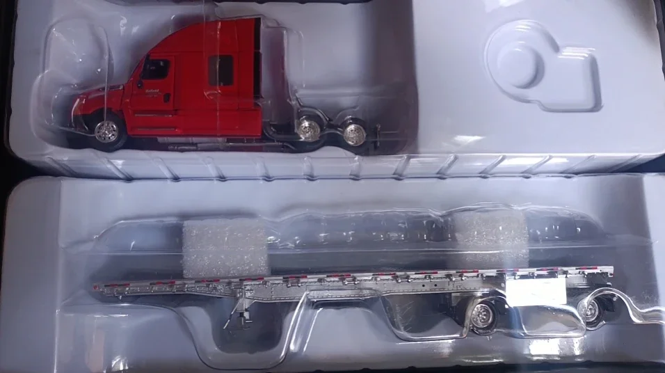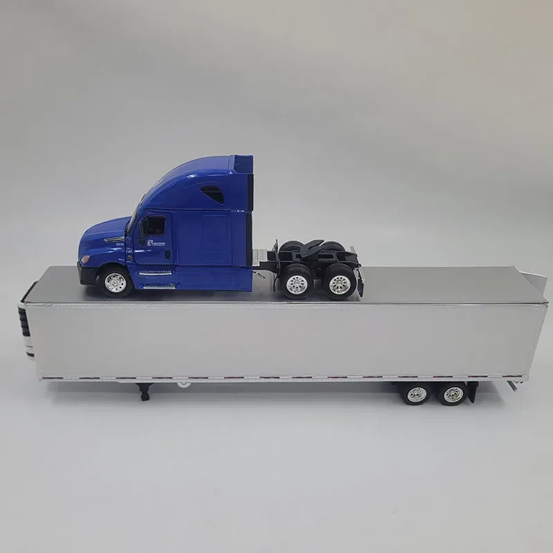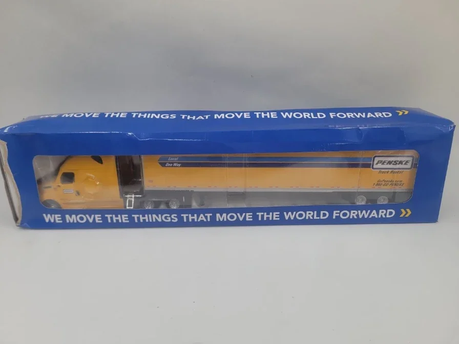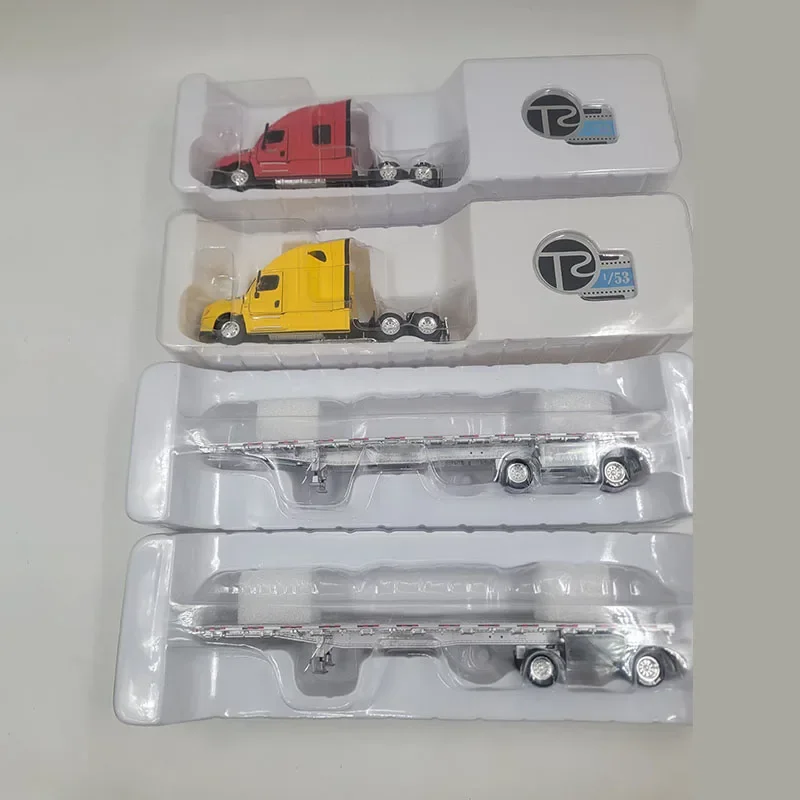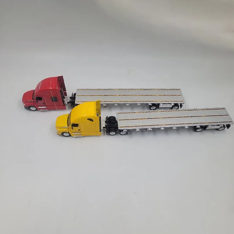 This 1:53 scale diecast model truck features a vibrant red Freightliner/Peterbilt 587 container truck alongside a sleek yellow truck, both crafted from high-quality alloy for durability. The models exhibit intricate detailing, including realistic headlights and a shiny chrome grille, perfect for showcasing their modern design. Each truck boasts a high roof and rounded cab silhouette, with dimensions that may vary slightly by 1-2 cm. As static models with no moving parts, they are ideal for display purposes, making them an excellent addition to any collection or a thoughtful gift for enthusiasts.