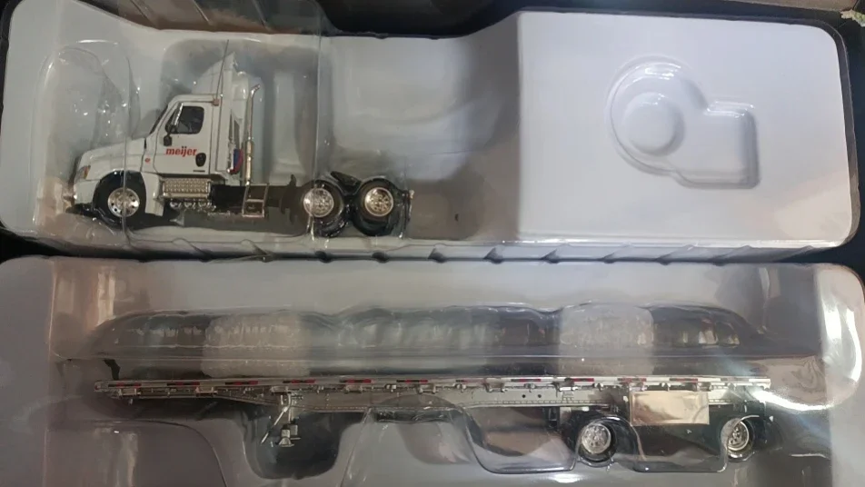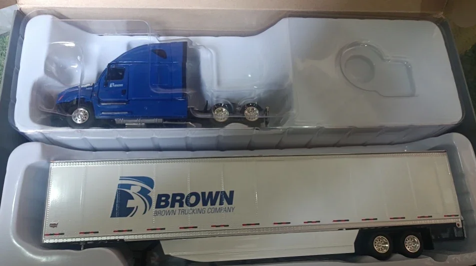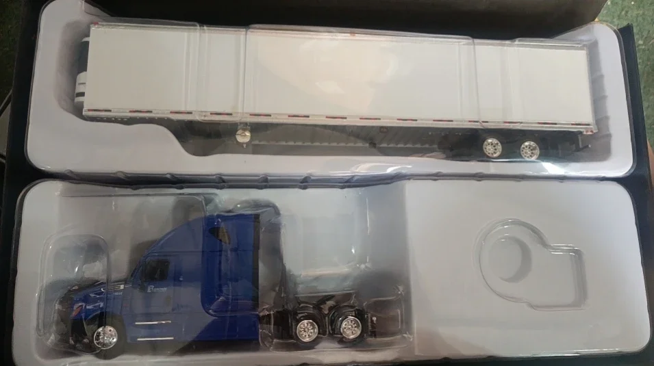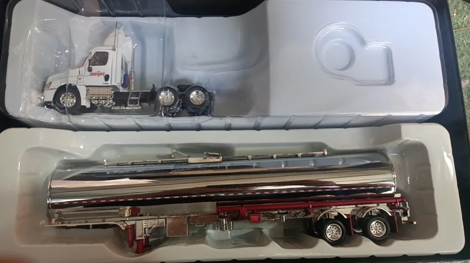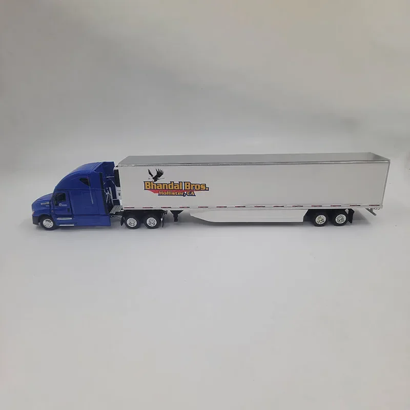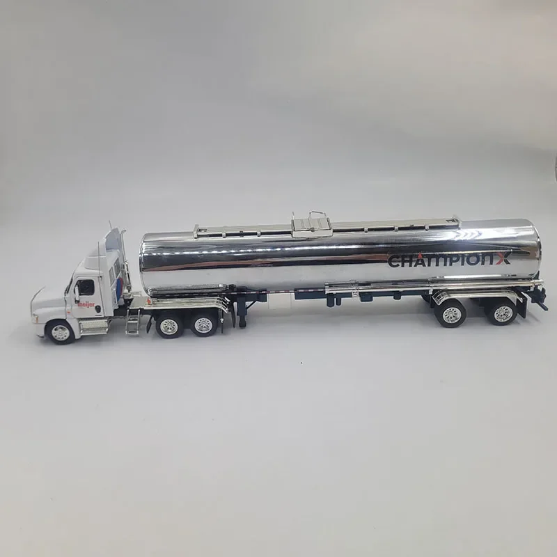 This 1:53 scale diecast model truck features a vibrant red Freightliner/Peterbilt 587 container truck alongside a sleek yellow truck, both crafted from high-quality alloy for durability. The models exhibit intricate detailing, including realistic headlights and a shiny chrome grille, perfect for showcasing their modern design. Each truck boasts a high roof and rounded cab silhouette, with dimensions that may vary slightly by 1-2 cm. As static models with no moving parts, they are ideal for display purposes, making them an excellent addition to any collection or a thoughtful gift for enthusiasts.