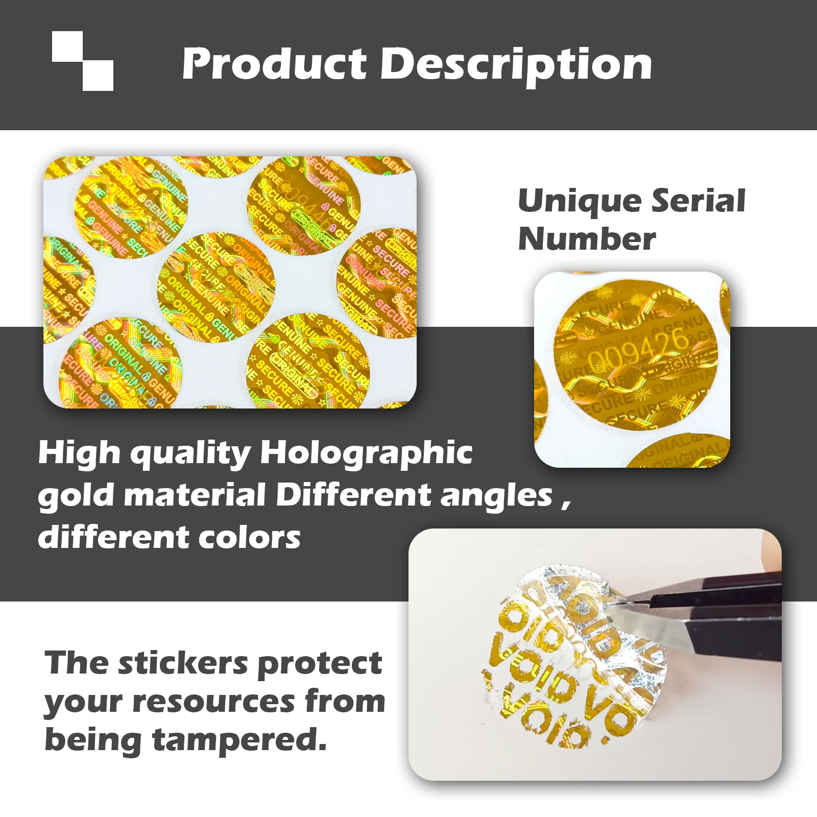 - Available in premium gold and silver colors, with quantities of 300, 600, or 1200 pieces, suited for large-scale security and anti-counterfeiting needs.