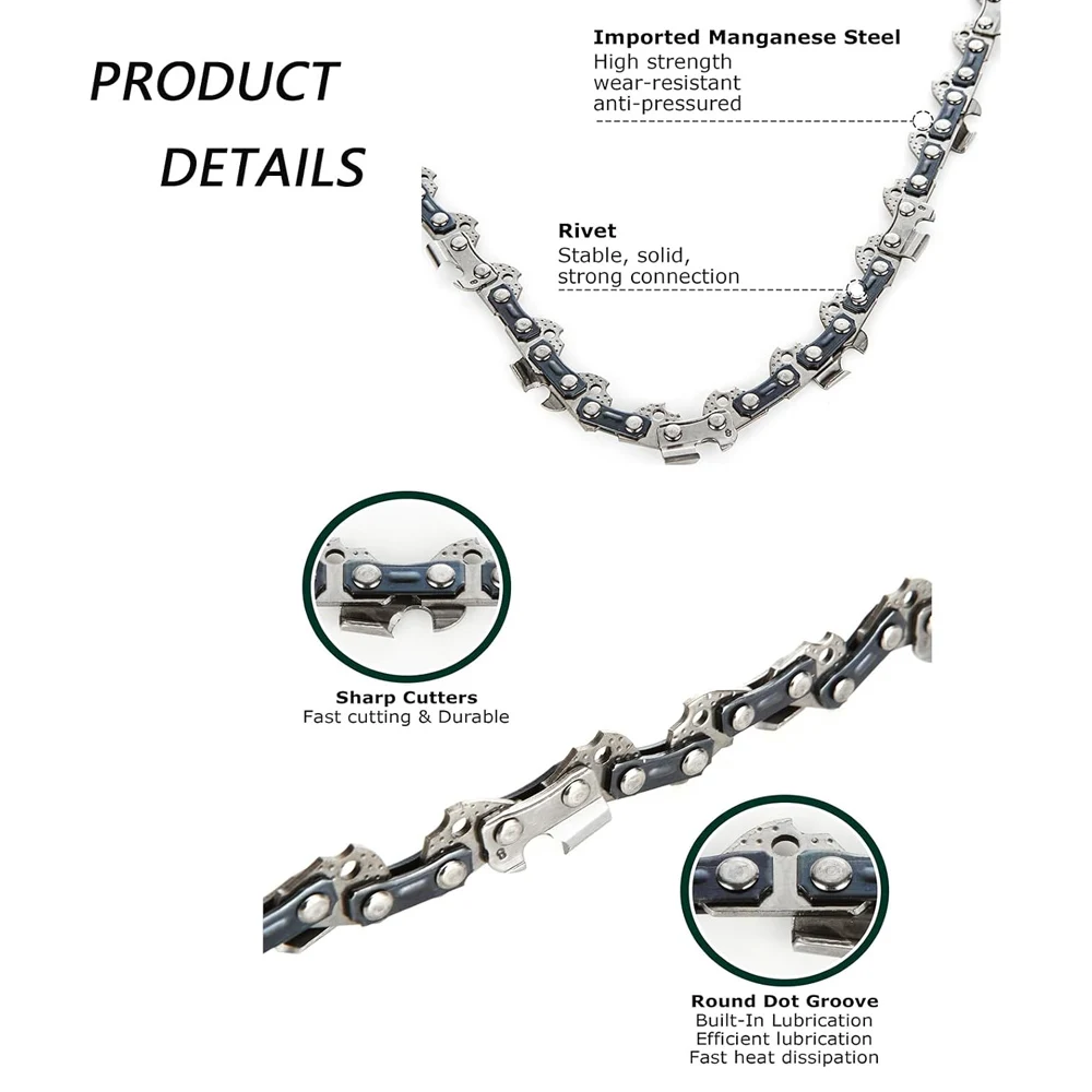 - Chains feature small, sharp teeth spaced evenly, with dark rivets securing links, providing a rhythmic, efficient cutting motion with minimal kickback risk.