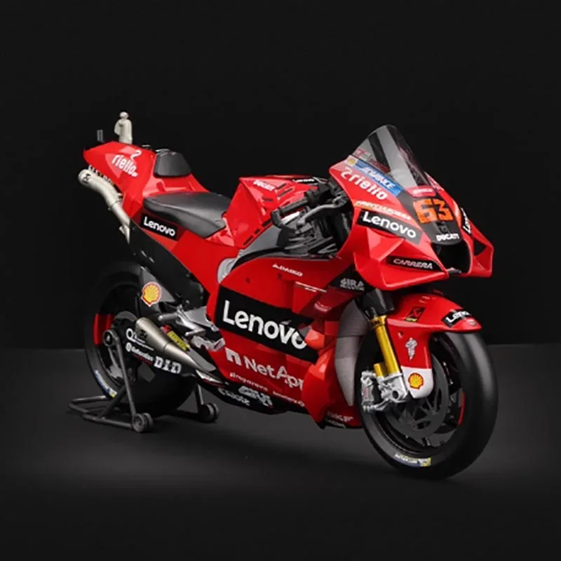 - Features a vibrant red finish, accentuated by detailed sponsor decals including Lenovo, Shell, and NetApp, that enhance its authentic MotoGP aesthetic, ideal for collectors seeking dynamic visual appeal.