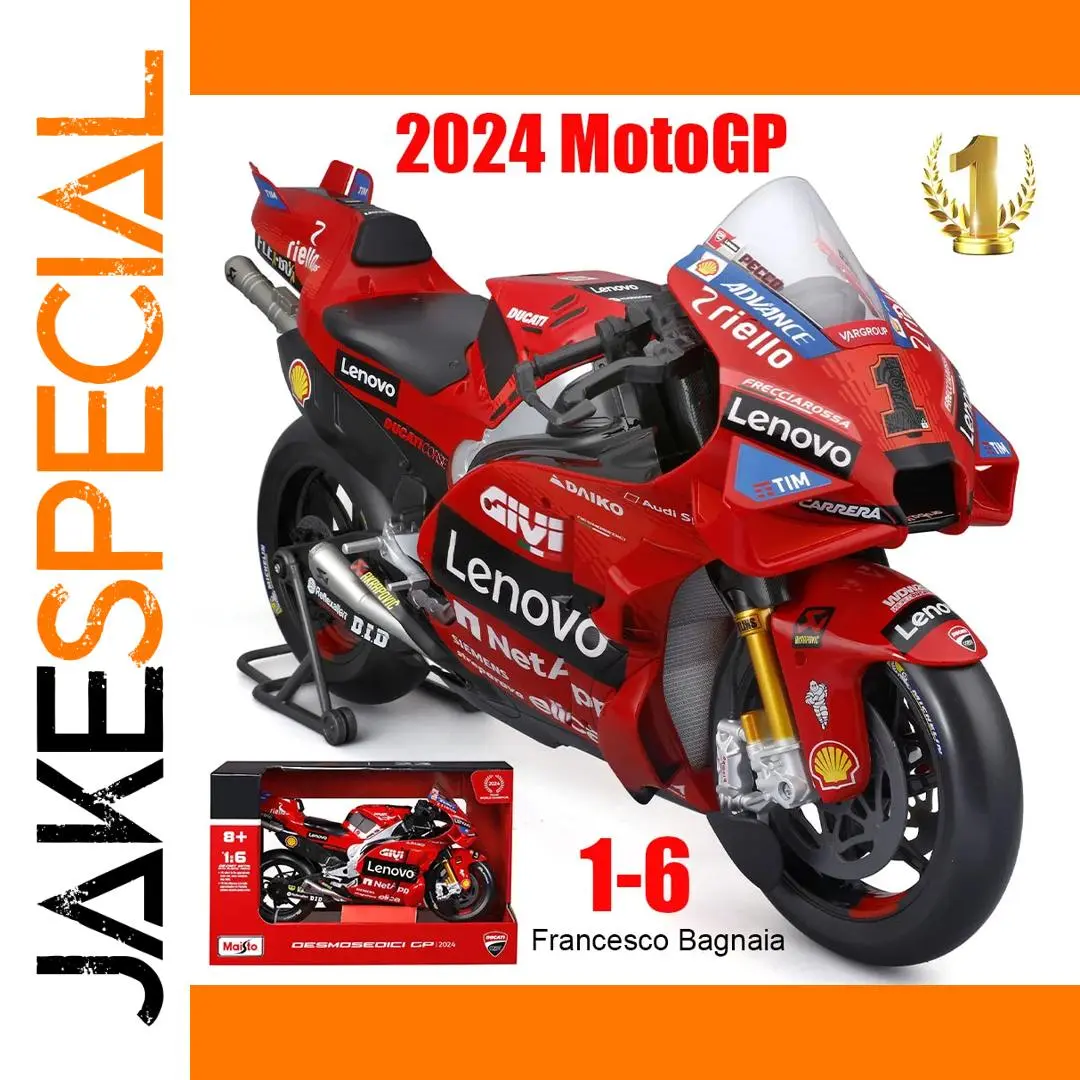 - This 1:6 scale model is made from durable metal and offers detailed recreation of the 2024 Ducati MotoGP bikes with vibrant red accents, sponsor decals, and sharp aerodynamic styling for an authentic racing look.
