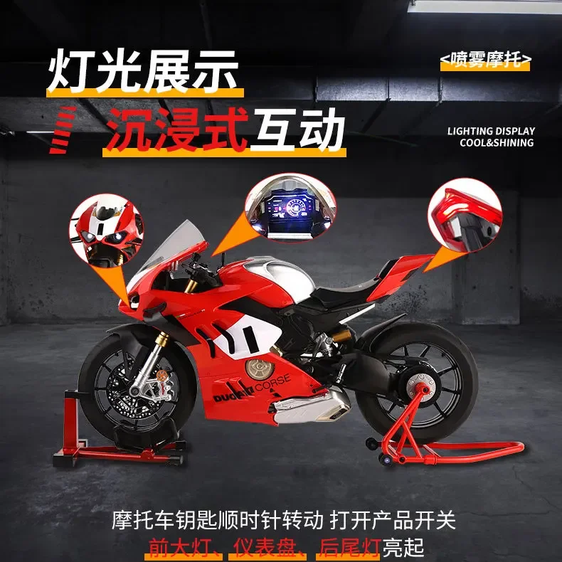 - Technical specifications include ventilated rotors, dual disc brakes, alloy construction for durability, and light and sound features activated via batteries, capturing the essence of a racing motorcycle with precision.