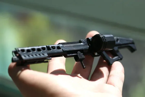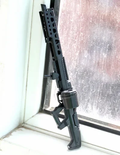 - Features detailed perforated barrel sections, heat shields, and top rail accessories, capturing authentic firearm design elements.