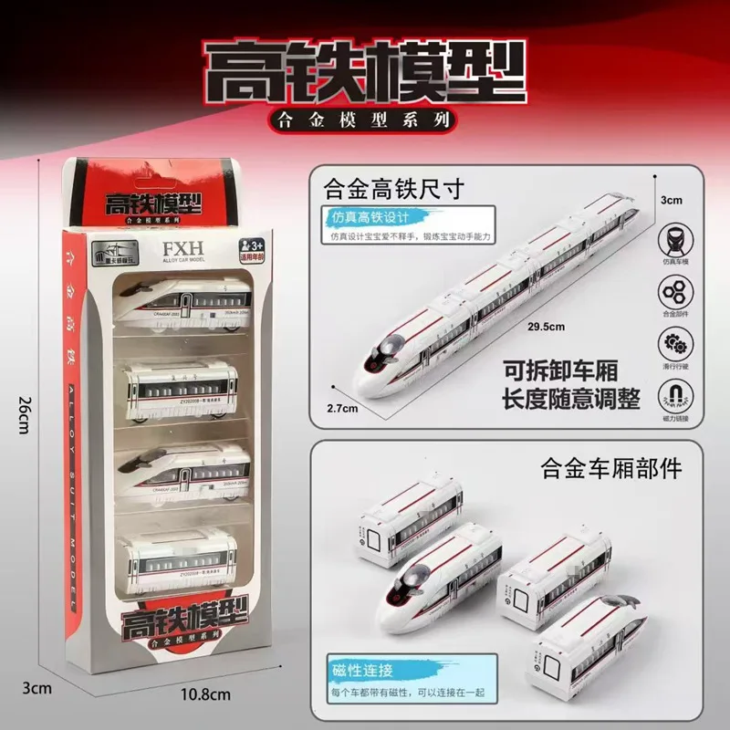 - Set includes four meticulously crafted 1:60 scale alloy models, featuring sleek locomotive and carriage designs in white with vibrant red and grey accents, ideal for display or educational use.