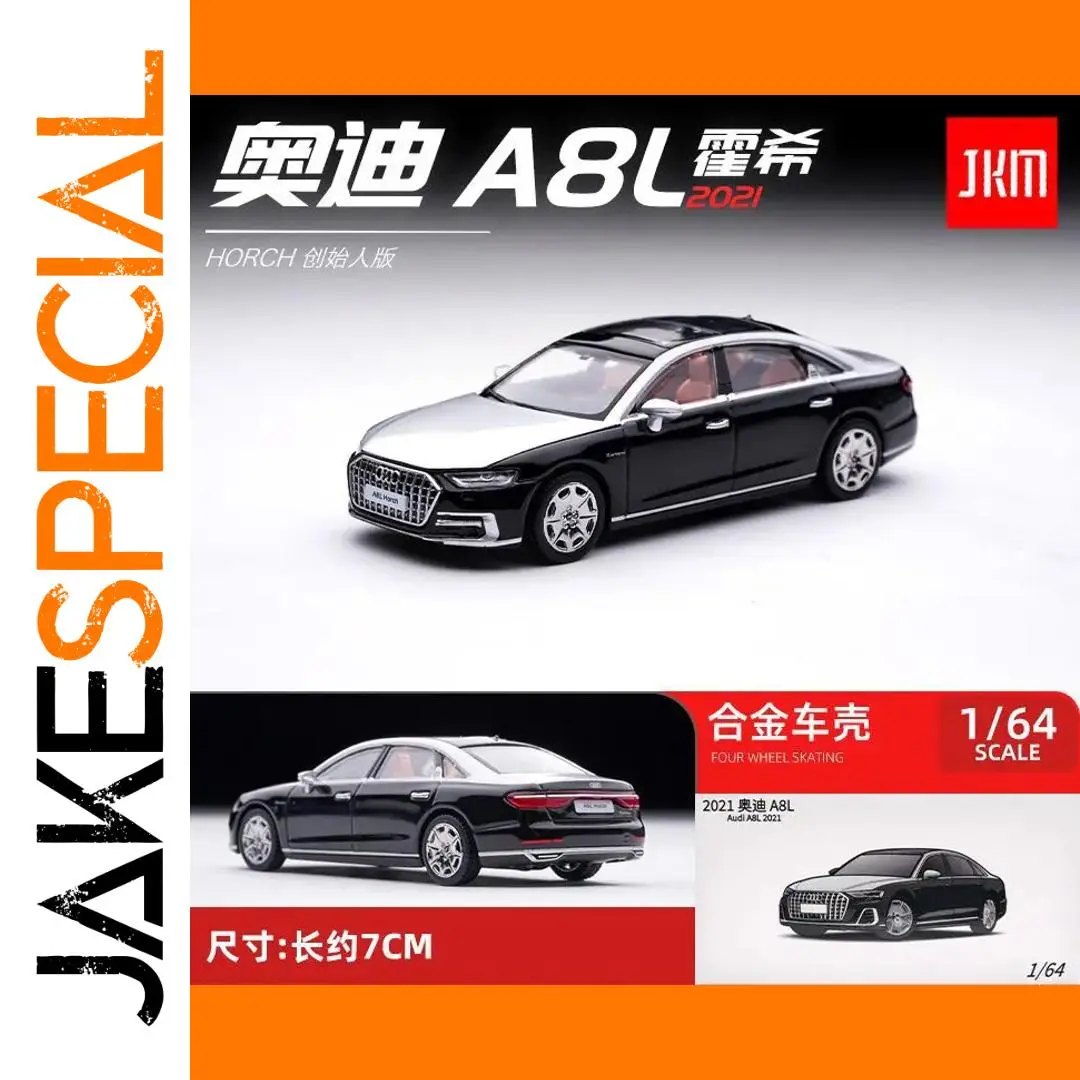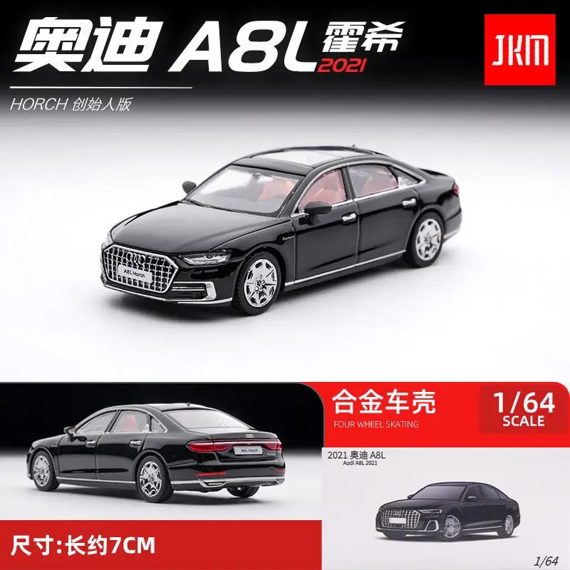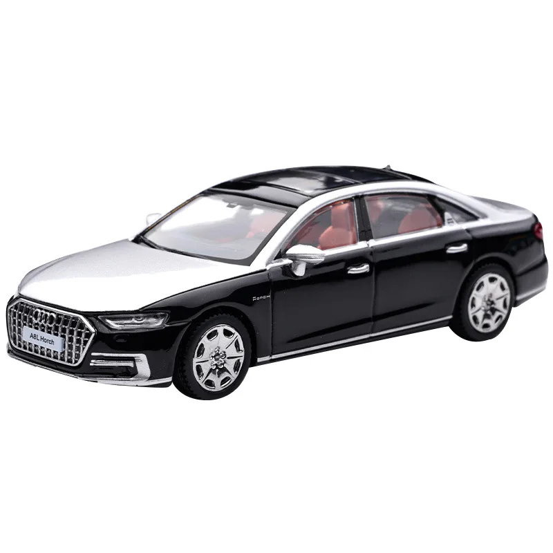 Immerse yourself in the luxury of the 1:64 scale diecast Audi A8L 2021, crafted from durable metal with a sleek, glossy black finish. This detailed model features exquisite alloy wheels with intricate spoke designs, a prominent honeycomb grille, narrow headlights, and chrome accents framing the windows and rear trim. Its smooth, contoured hood and gently sloping roofline exemplify modern elegance and sophistication. Suitable for collectors and enthusiasts aged 18+, this no-battery, non-electronic display piece is perfect for adding a touch of luxury to any collection or display shelf, capturing the essence of contemporary automotive design in a compact, stylish form.
