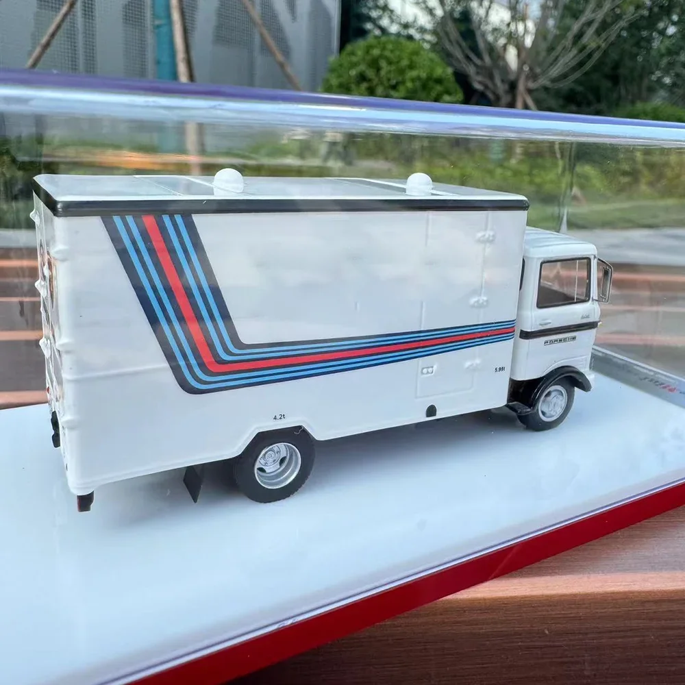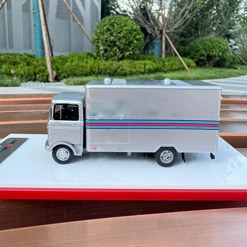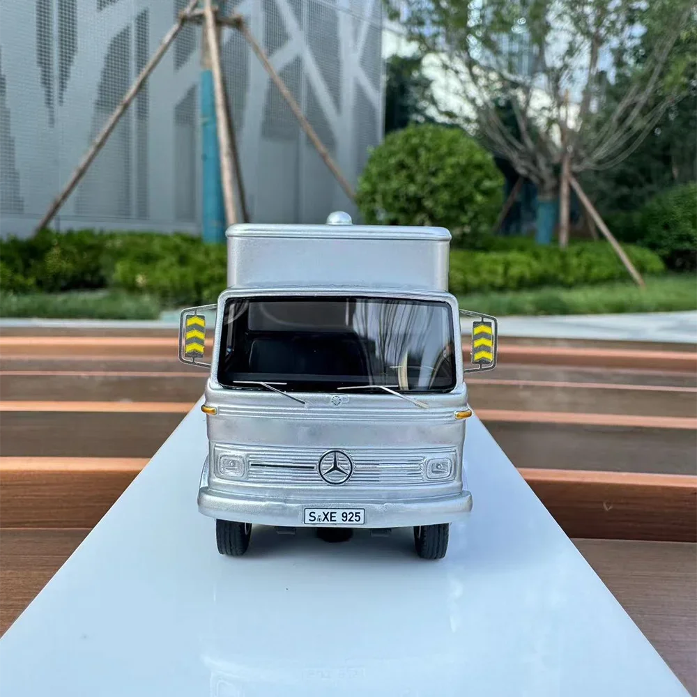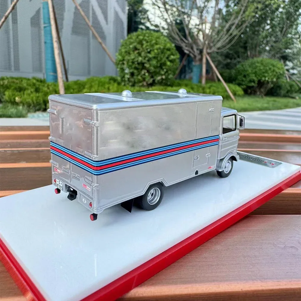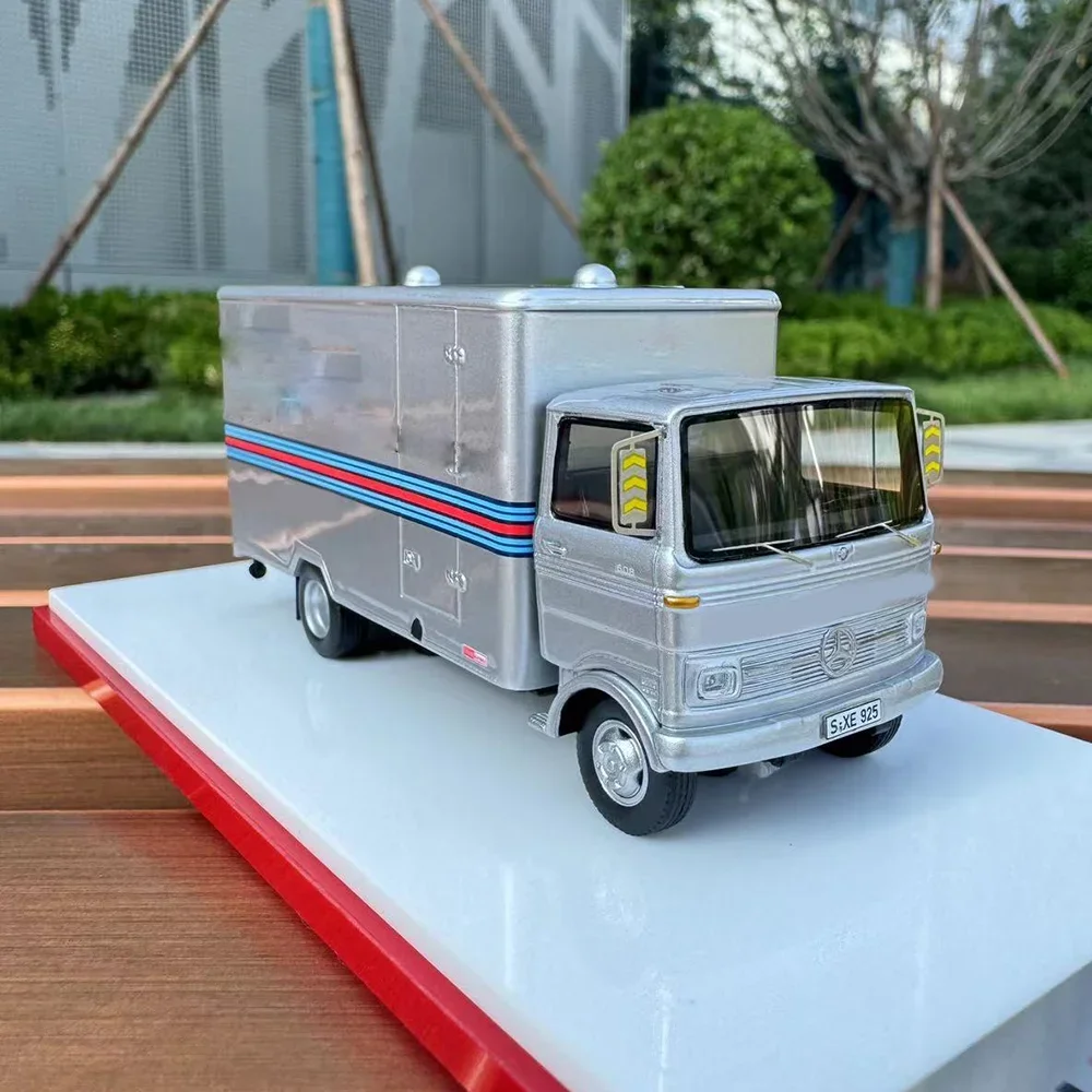 This 1:64 scale resin model of the Benz LP608 transport truck measures approximately 10 cm in length, 4.3 cm in width, and 4.8 cm in height. Featuring a sleek silver finish with detailed design elements, including rotating wheels, a rectangular cab with curved plastic windows, yellow and black striped decals on side mirrors, and a smooth cargo area adorned with blue and red stripes, it offers a realistic and collectible appearance. Ideal for display, gifting, or hobbies, this static ornament is crafted without batteries or light and sound functions, making it a refined addition to any collection. Suitable for ages 14 and above.